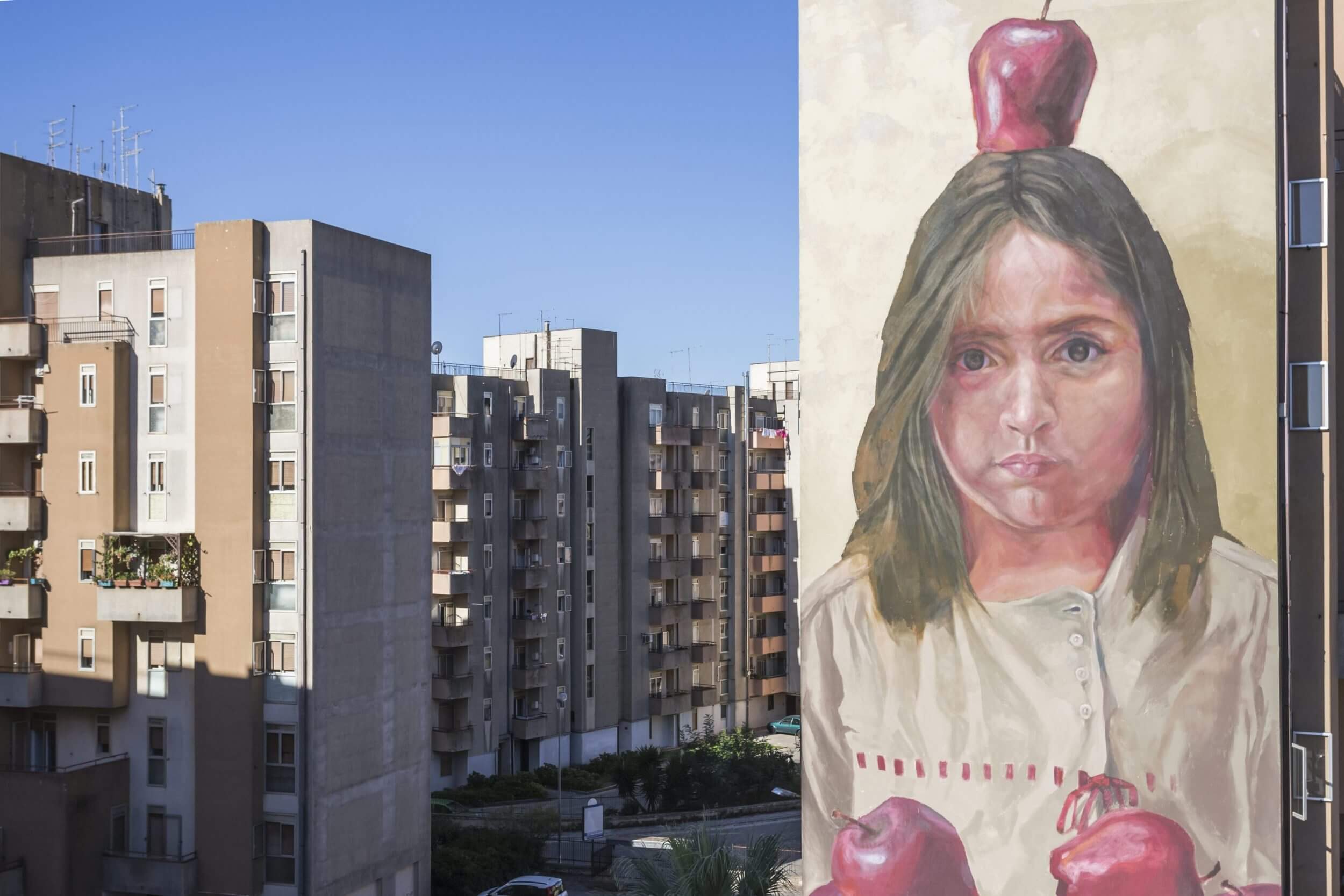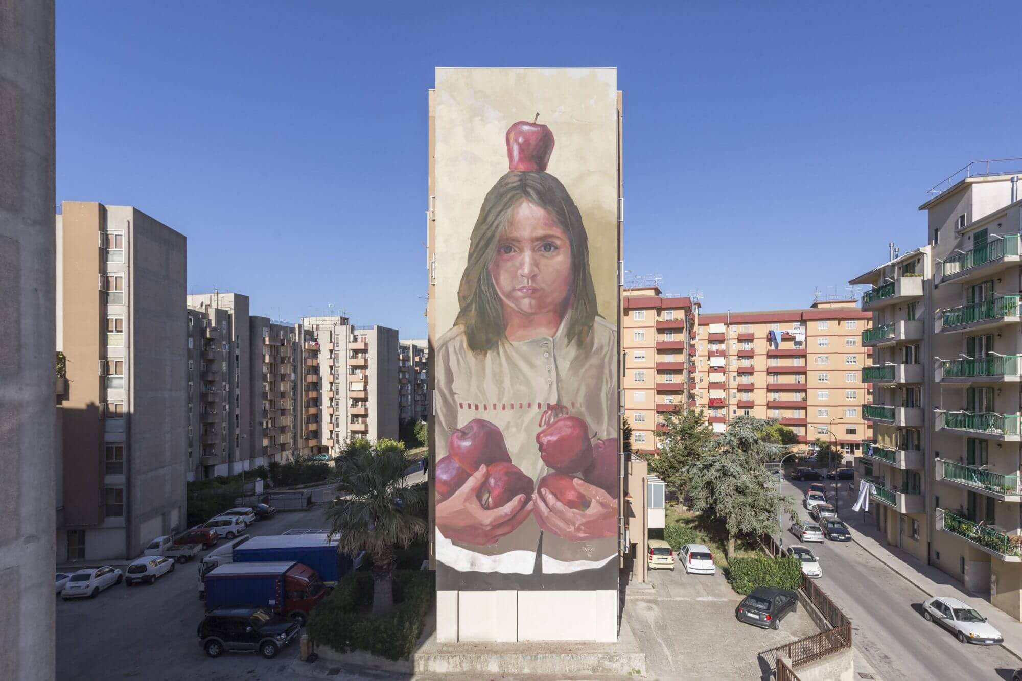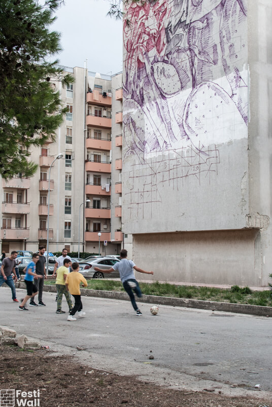 For the 2016 Edition all the walls were painted in a well-defined area of Ragusa. The district, known locally as “Wild” is an area for public housing. In the 1980’s the area was built upon with large ugly residential buildings and for years been synonymous with urban decay.