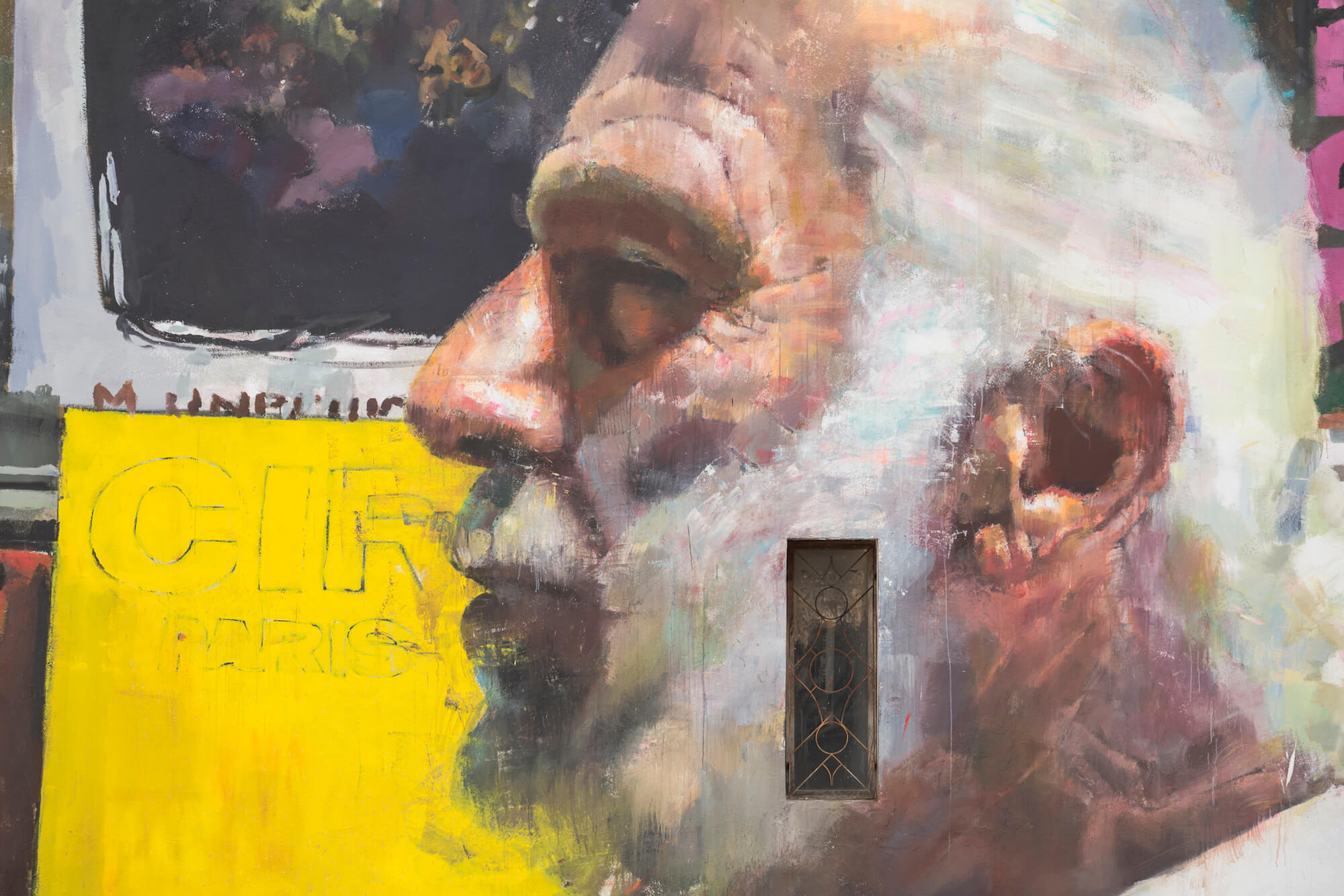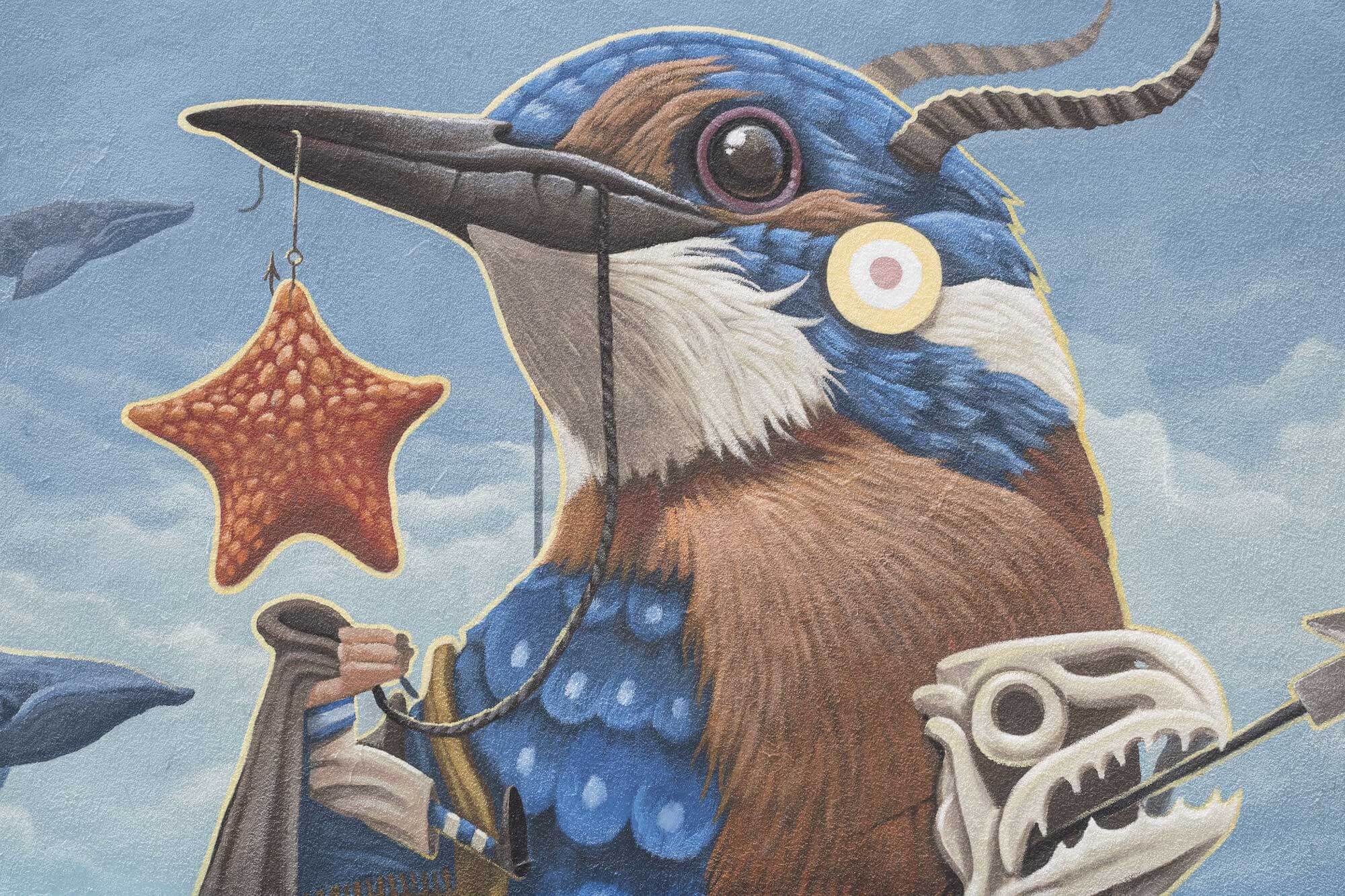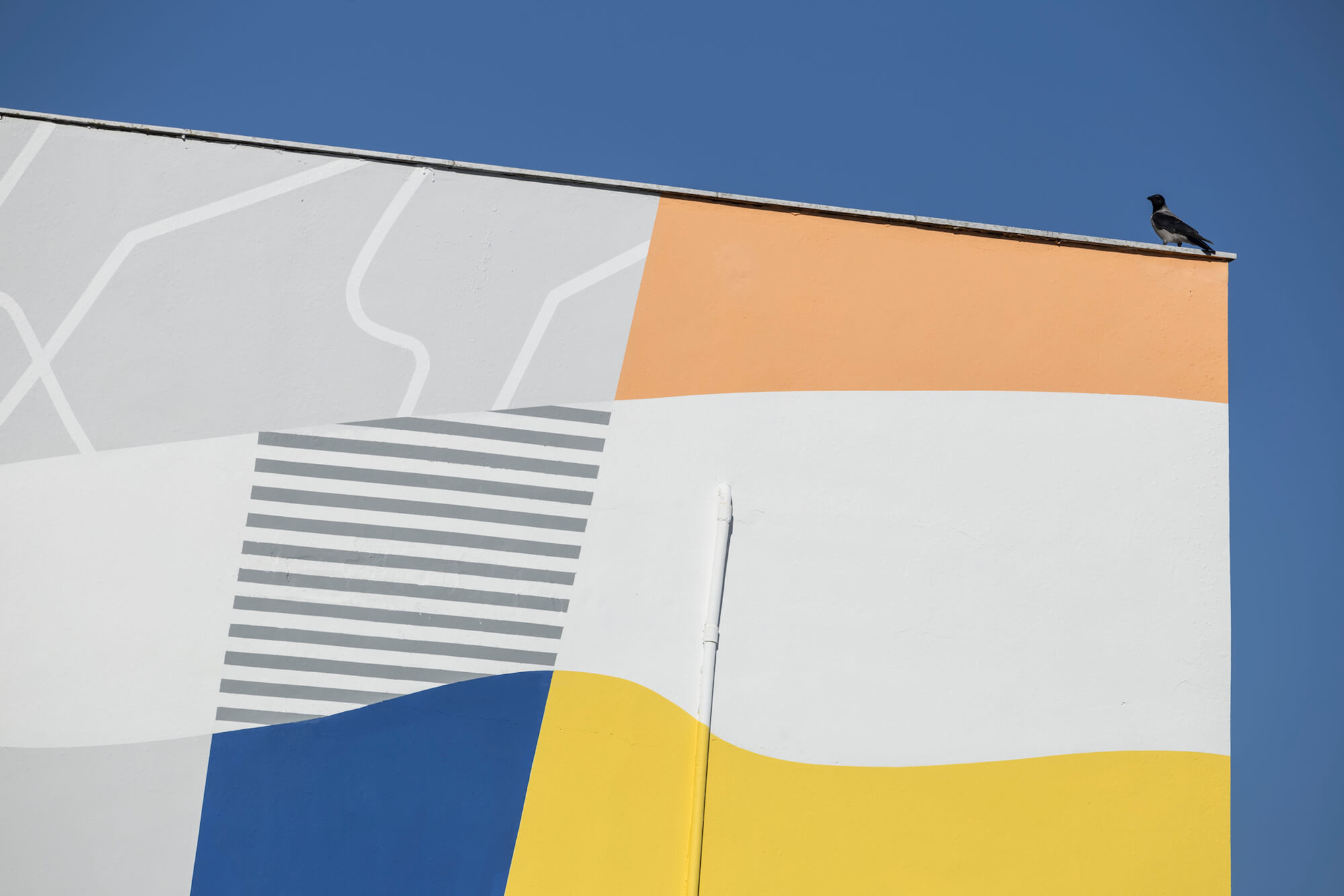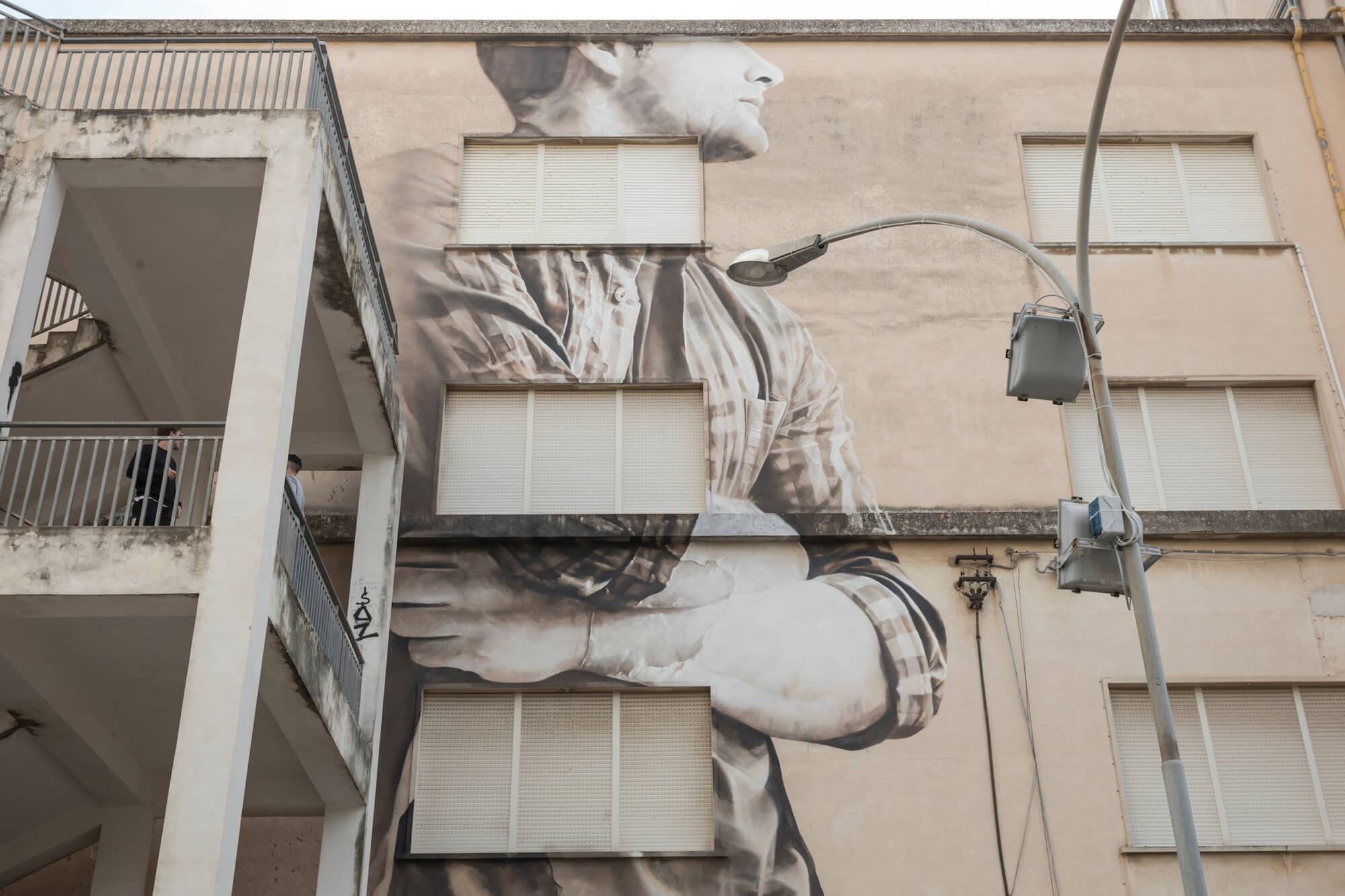 “Growing up in one of the coldest regions in Russia we have been exposed to an Italian culture through books and old films. It was very important for me to step further than the stereotypical image they have created. That is how I came up with this almost collage-like mural that showcases that juxtaposition of those and my own up to date observations I took when I travelled to Italy in the recent years. The subject of the mural is a man going to a fish market. I was drawn by the brutality and violence of the pescheria. I have paired it with the picture of the asphalt I took at the airport on my way to the festival. This mix of retro and new, the cliché and perceptive is what make Italy a very special place and what I wanted to show in my mural.” Marat Morik