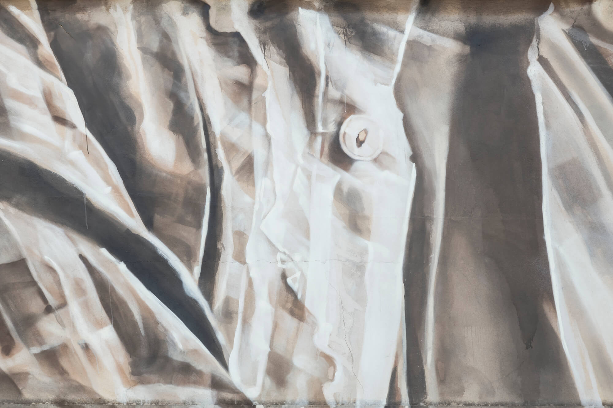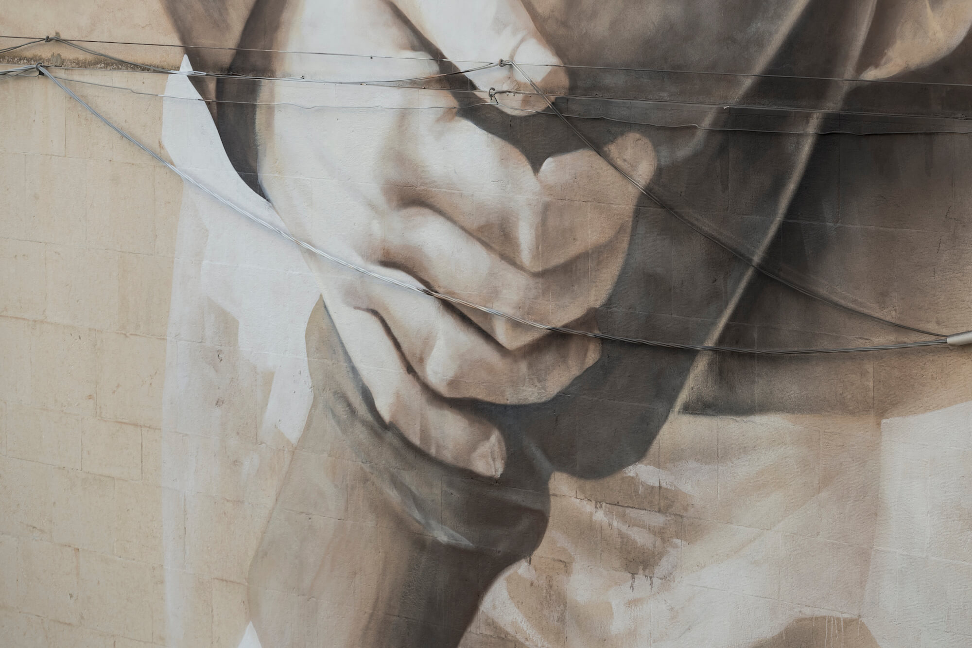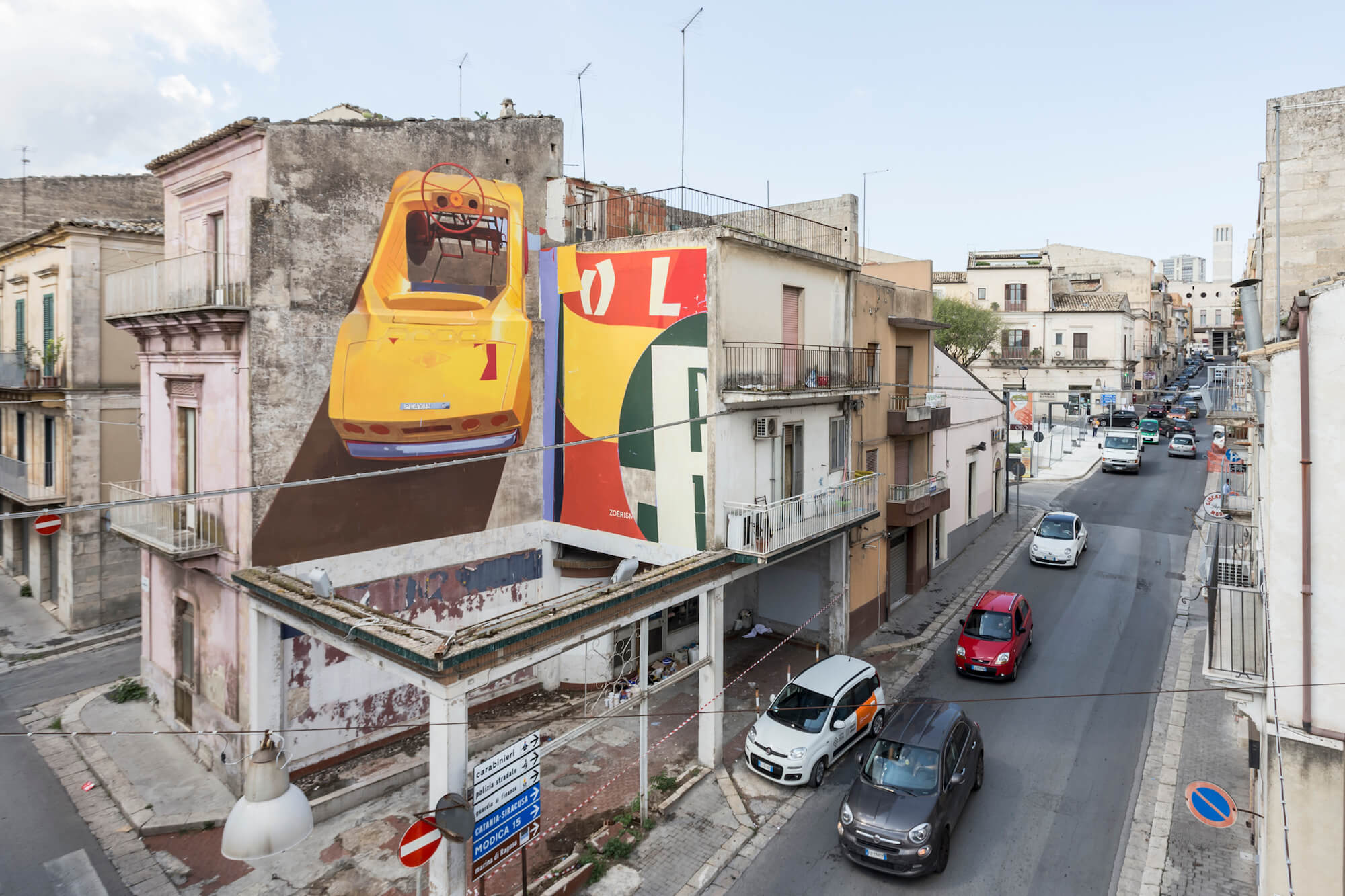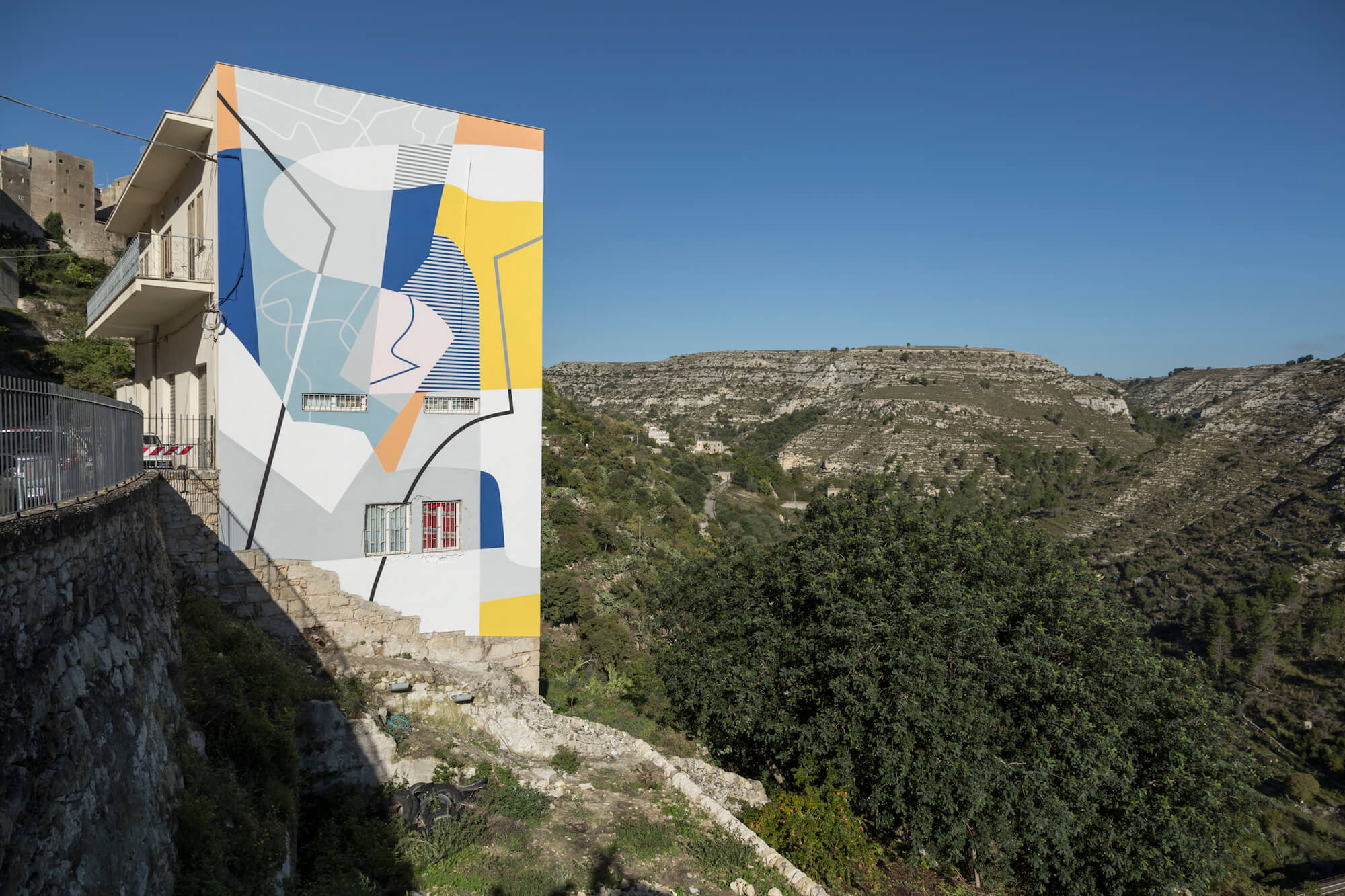 Gué paints roads that cross the landscape designed by the boundaries of the walls, cultivated fields, the margins of the encounter between the city and the striking scenery of aspen and rocky of the Iblean countryside. His mural is titled Border.