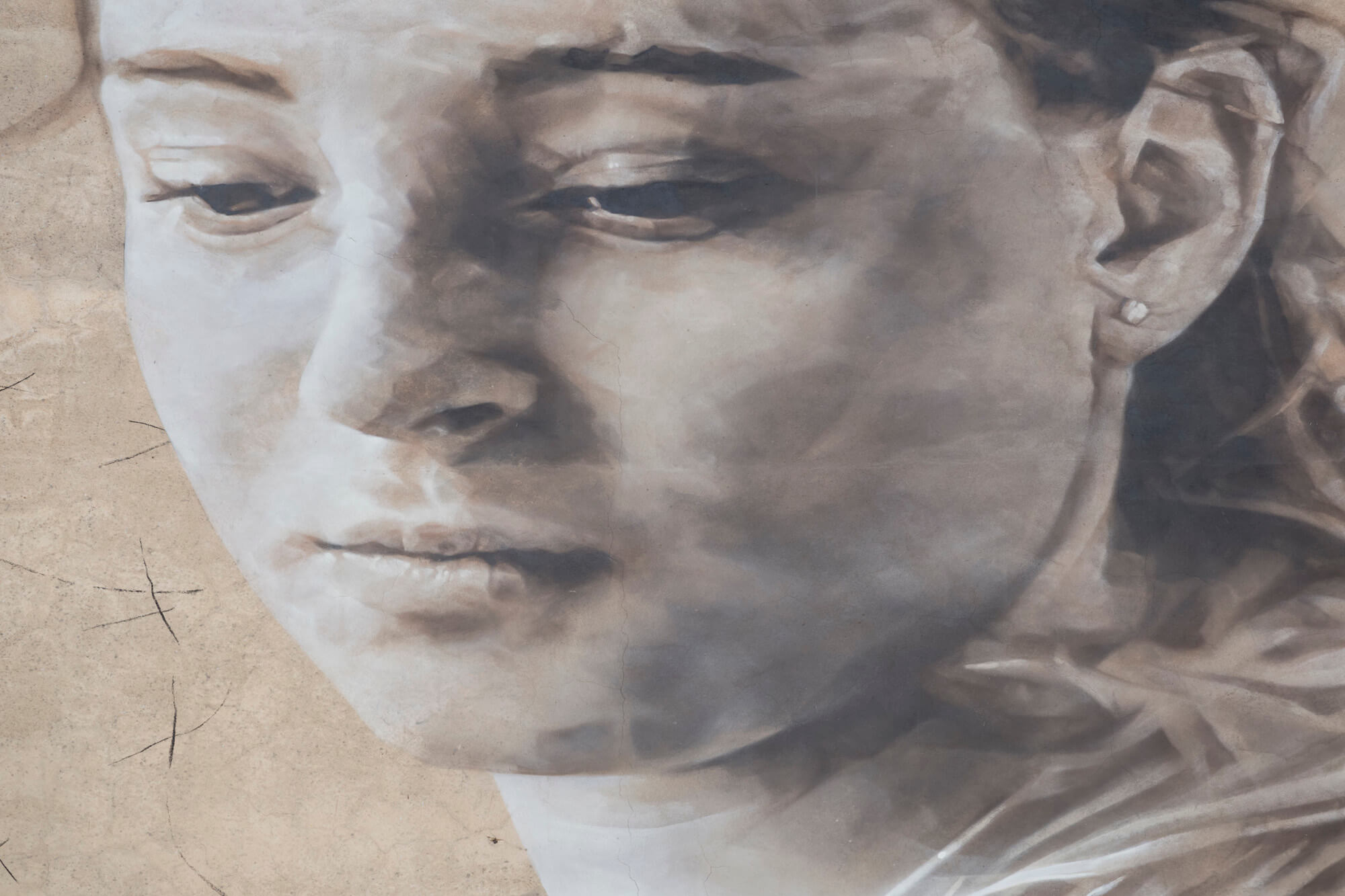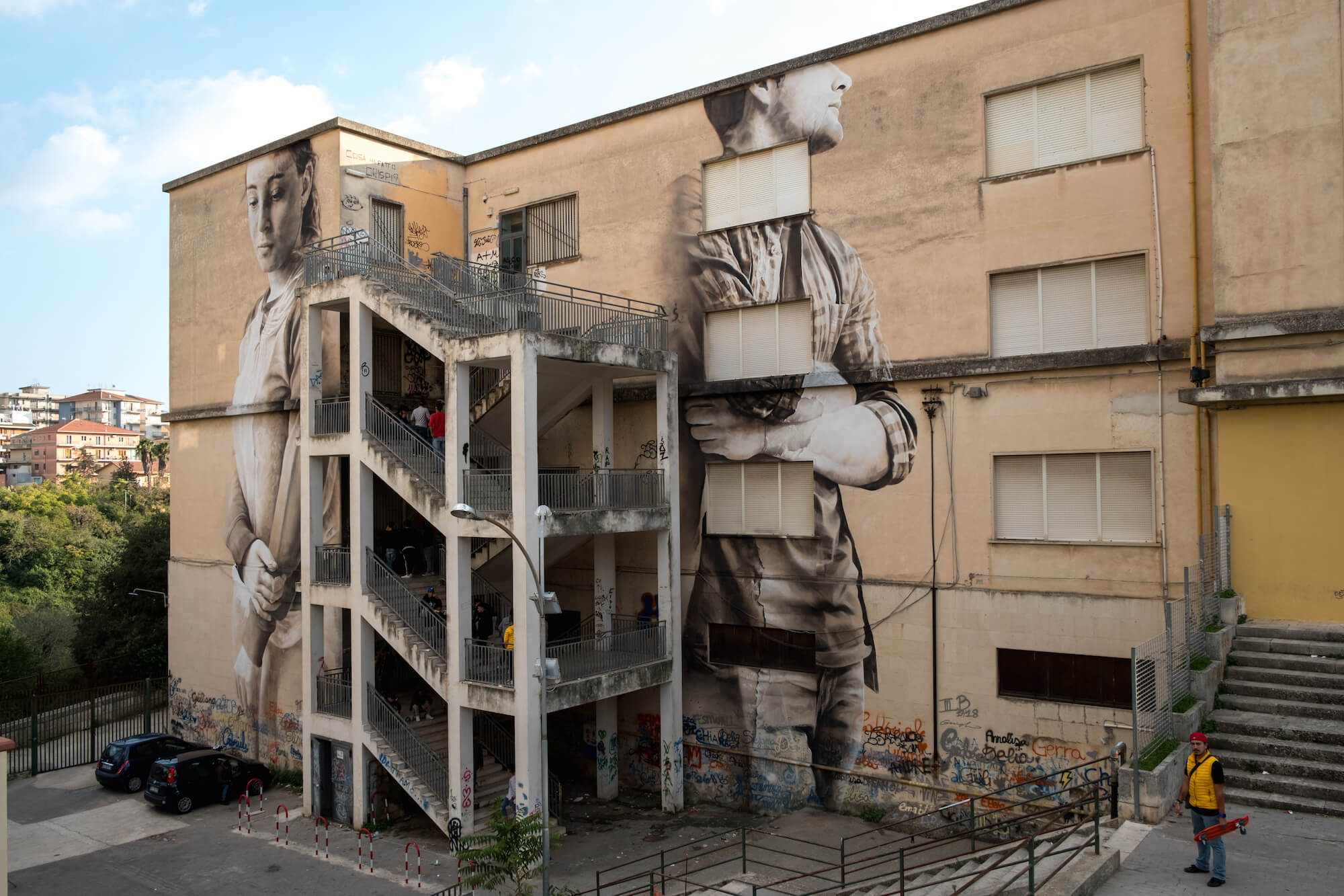 Australian artist Guido Van Helten mural is titled L’attesa’ (The wait). This painting is at the place known as the ‘Marsala’ in Ragusa Sicily… the stairs at the back of the school Liceo Classico Umberto Primo. The energy of this place is generational and ingrained, a location where teenagers and young people have met daily to play music, talk and hang out.