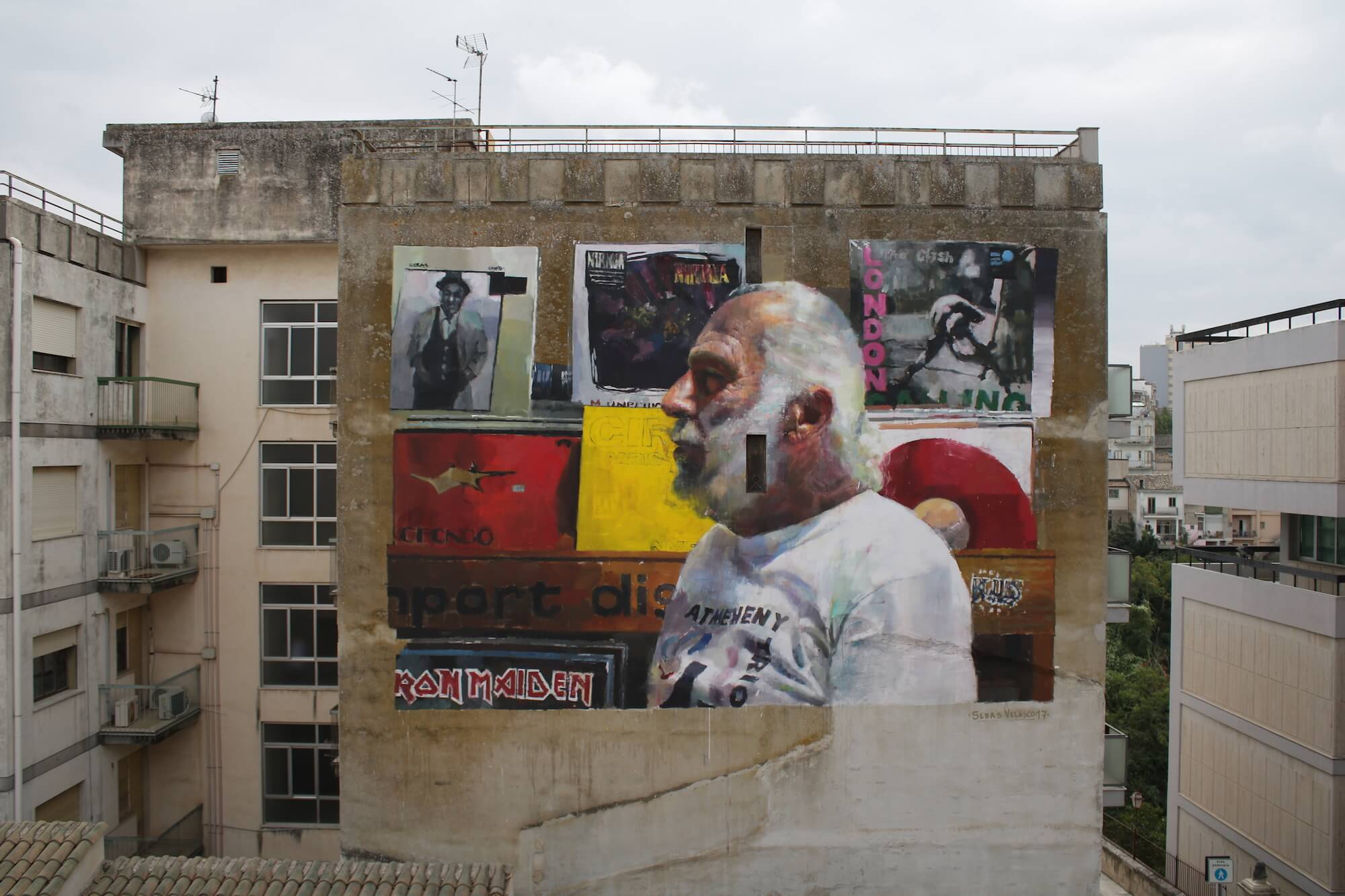 Spanish artist Sebas Velasco’s mural is called “Il suonatore Gino /The Gino player” and his inspiration was from local vinyl shop owner Giorgio “Gino” Nobile. His shop Magic Music, is the only vinyl record store in the Italian city.