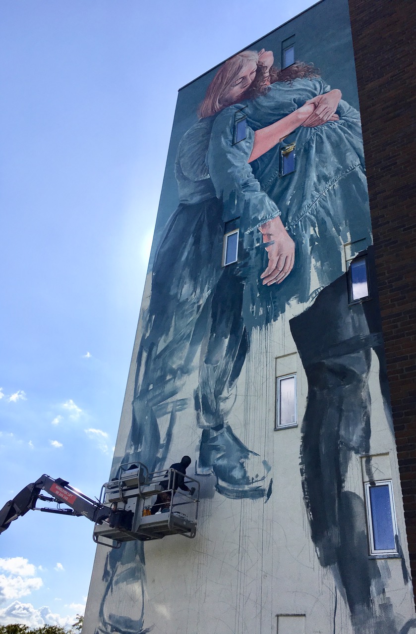 Australian artist Fintan Magee has just finished his mural in Aalborg . The whole process from sketch to wall took 13 days, to produce this outstanding piece of art, like a water colour as the artist put it himself.