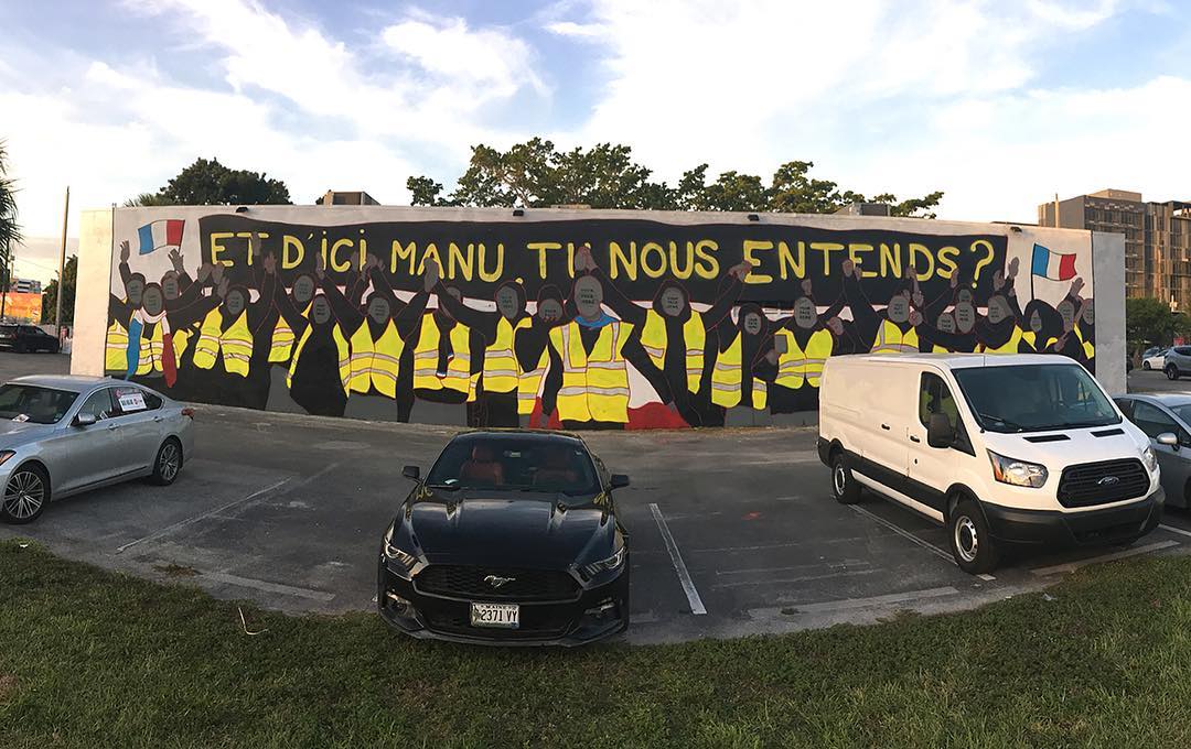 MTO has commented previously on The Yellow Vest Movement of his facebook page. MTO’s mural in Wynwood Miami Art Basel last year consisted of a line of yellow vest supporters shouting “And from here, Manu (Macron), Can you hear us ?”