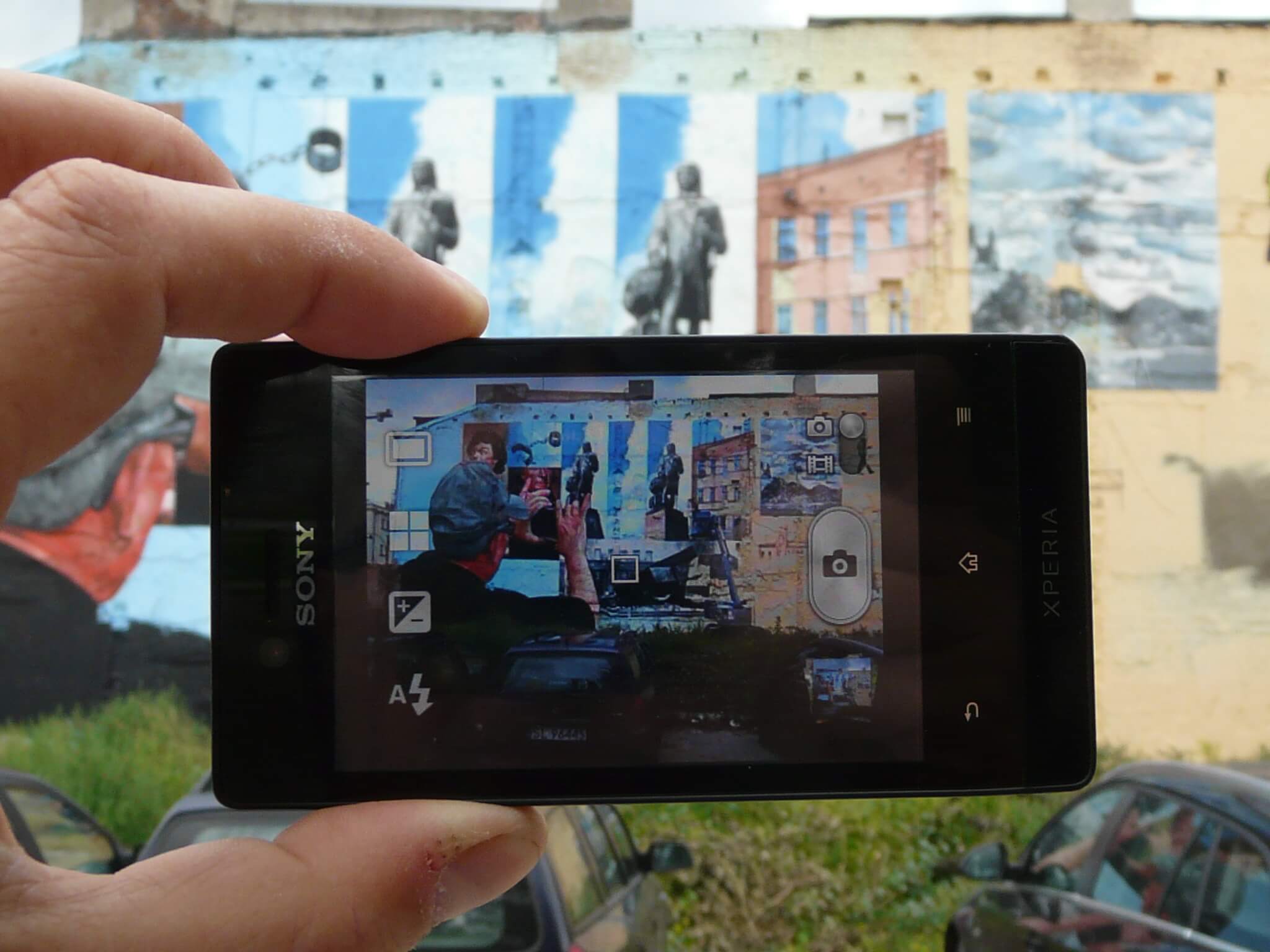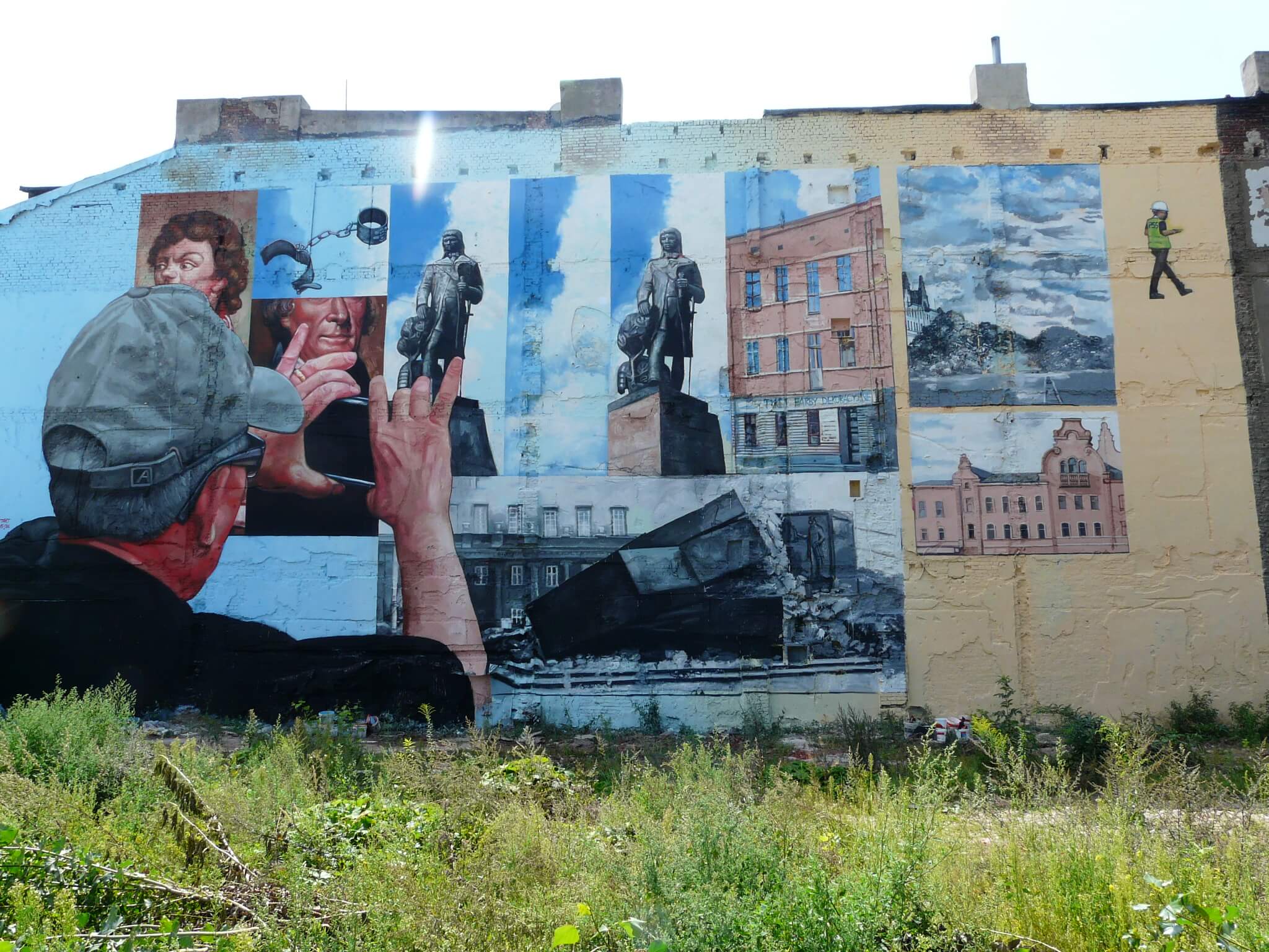 Gaia mural shows the three versions of the Kosciuszko monument on Wolnosci Square in Lodz, which represent the successive stages of its history: construction in 1930, destruction during World War II, and finally reconstruction in 1960. On the mural the non-existent buildings surrounding the New Centre of Lodz can also be seen.