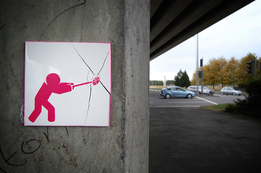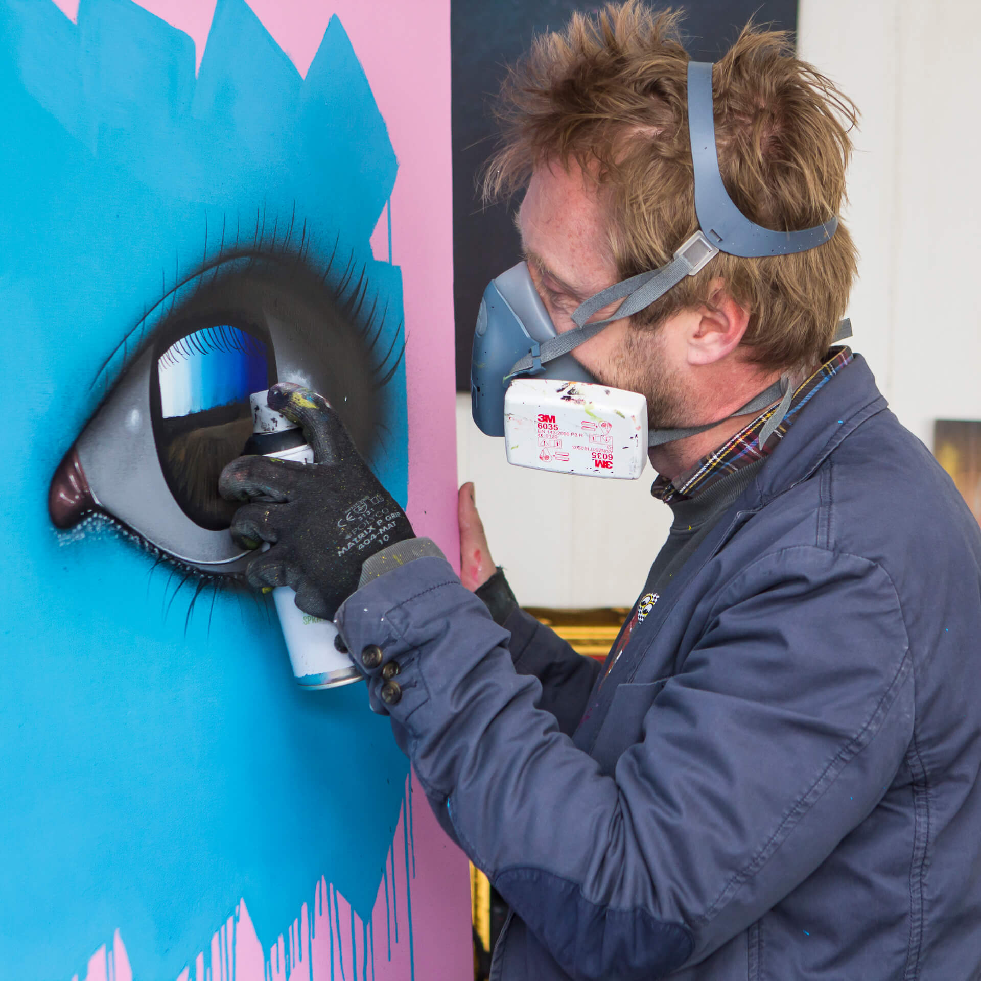 Pahnl characters are never more than 10cm tall, you’d be forgiven for missing them! Pahnl has been stenciling on and off the street for over a decade, and also makes use of stickers, posters, film, and photography to bring his cheeky world to life. Taking the term ‘street art’ literally, Pahnl always strives to make his work interact with its environment rather than simply sticking a pretty picture up in the middle of a wall without reason. Studio work affords Pahnl the time to focus on the detail and craft of his art, whilst weaving a narrative through a scene. With the belief that “art changes when the world does”, Pahnl doesn’t seek to explicitly push a moral or political agenda. At the end of day, all he wants to do is bring an unexpected smile.