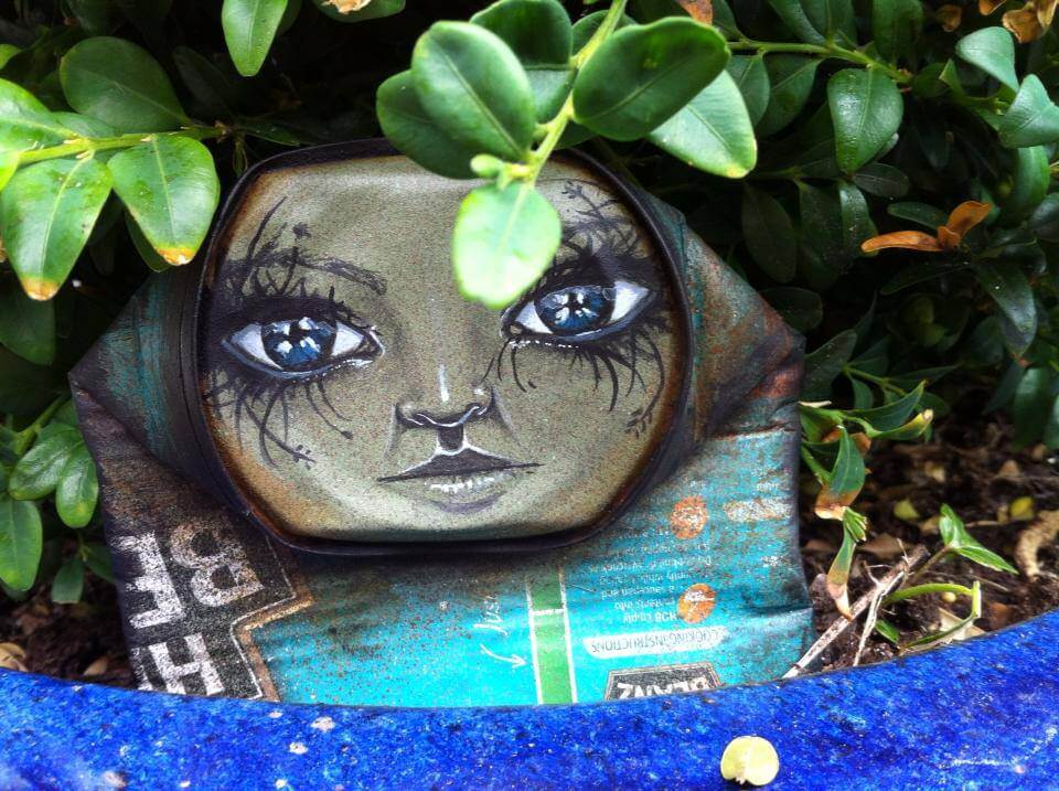 My Dog Sighs’s style is characterised by the combination of melancholic and often naive portraiture with the use of found materials including abandoned food cans. His use of materials ‘lost then found’ became the underbelly to ‘Free Art Friday’ project, now a global sensation. Moments of loss and then being found echo the materials used. Tin cans, once the receptacle of our sustenance, all too quickly rejected, thrown away, abandoned by a materialistic society.