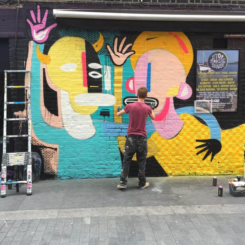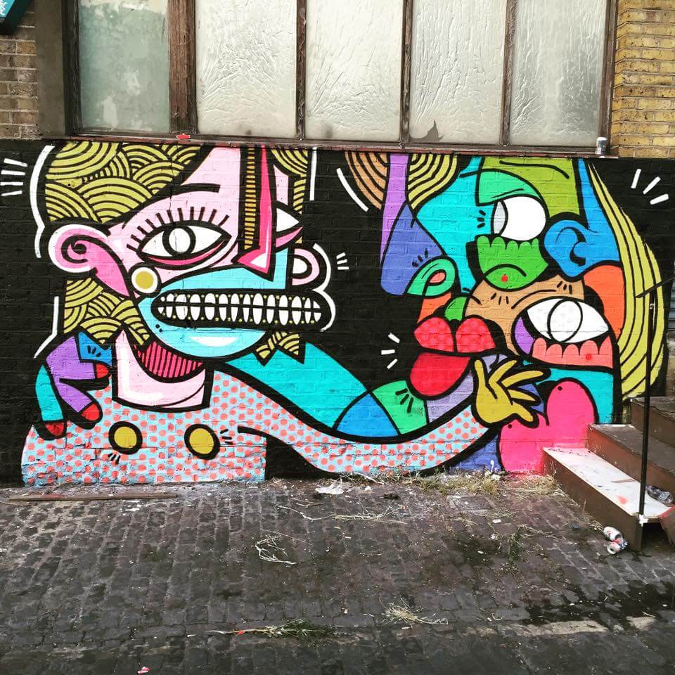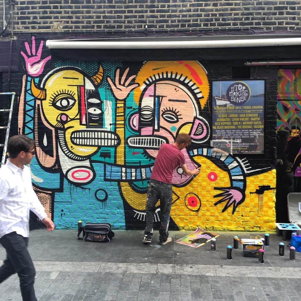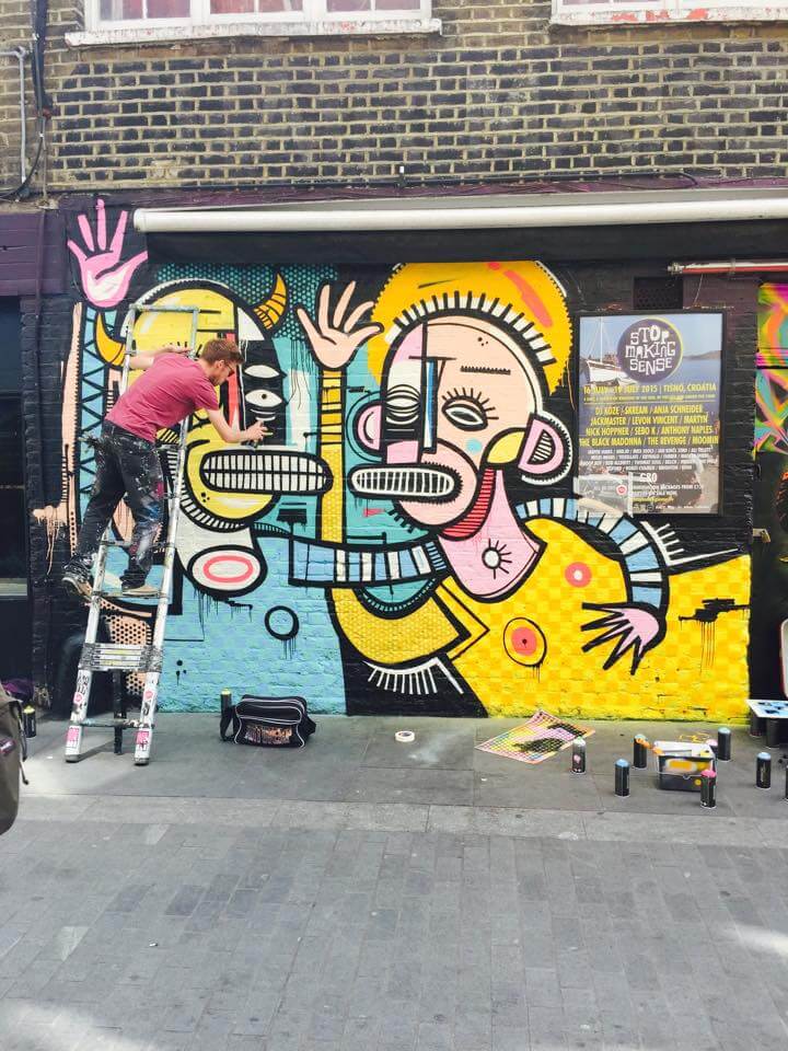 Joachim, from Belgium, was on his first visit to the capital and was super keen to get painting in Shoreditch. Joachim threw colour in Rivington street next to the friendly guys at the Bedroom Bar with his Saint and Sinner Mural.