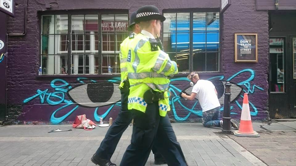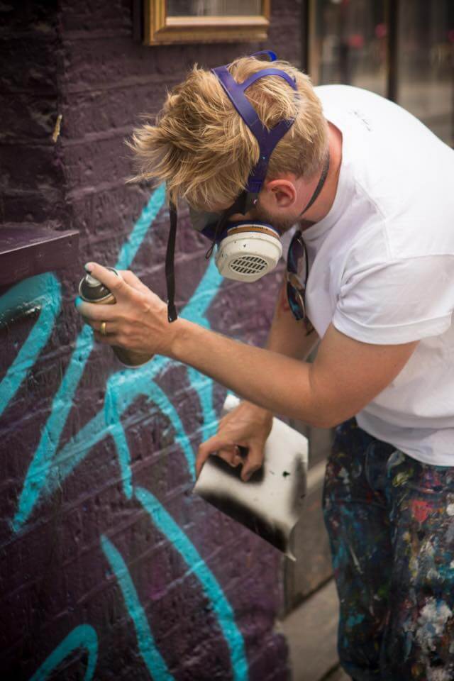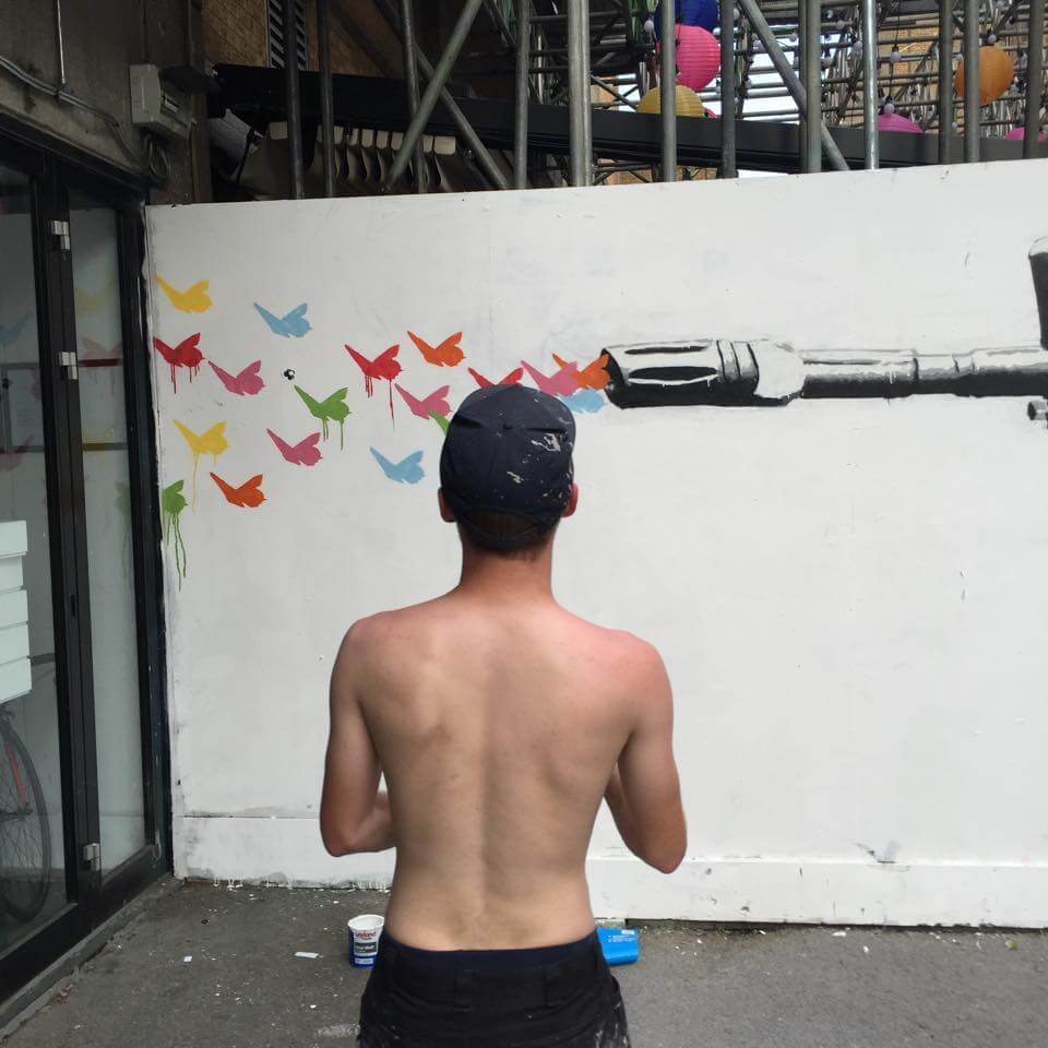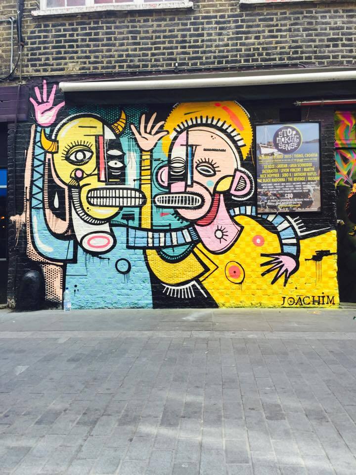 Joachim, from Belgium, was on his first visit to the capital and was super keen to get painting in Shoreditch. Joachim threw colour in Rivington street next to the friendly guys at the Bedroom Bar with his Saint and Sinner Mural.