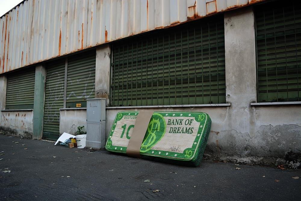 MATERIALS USED: Abandoned mattress, cardboard, spray can paint.