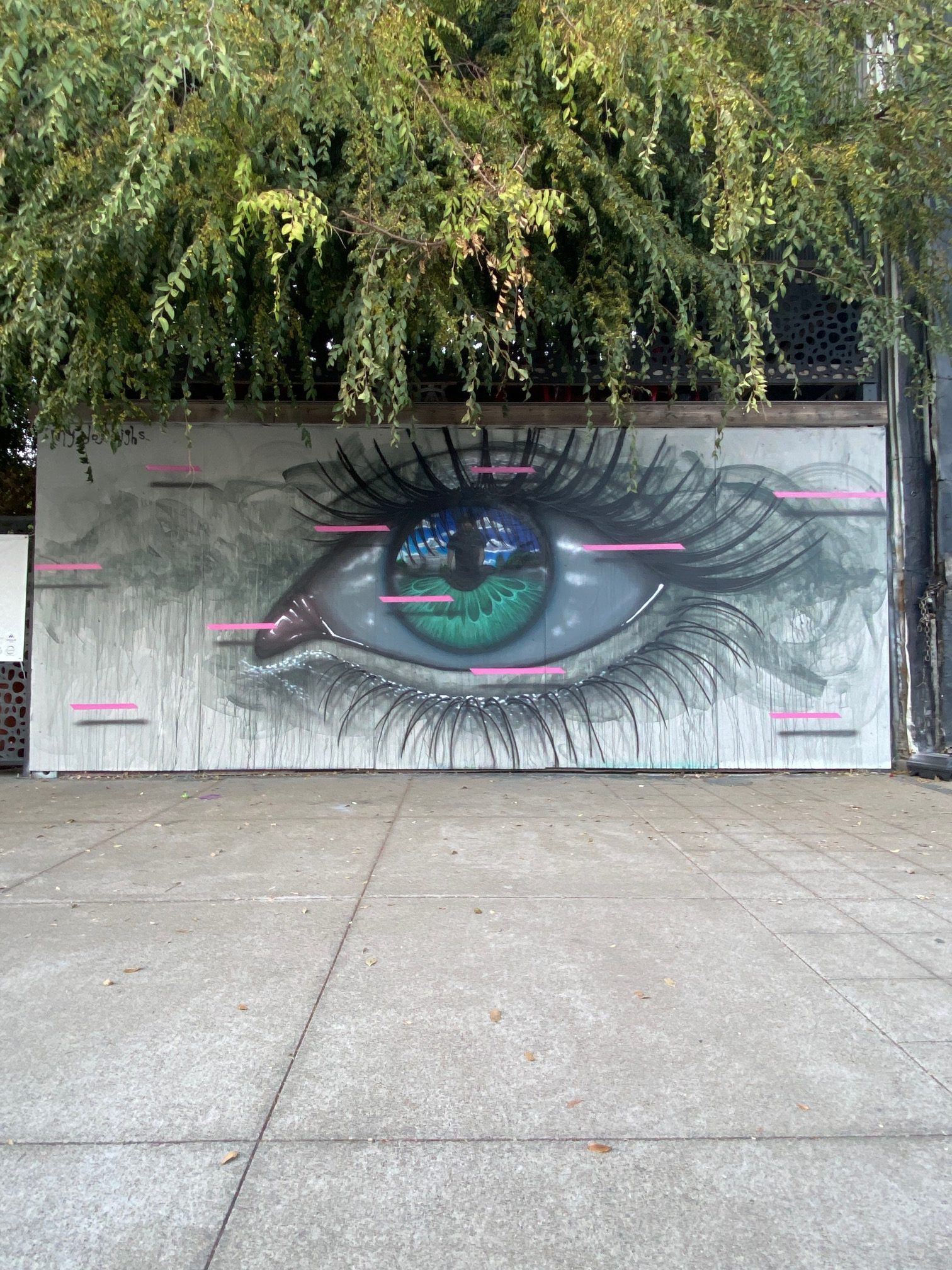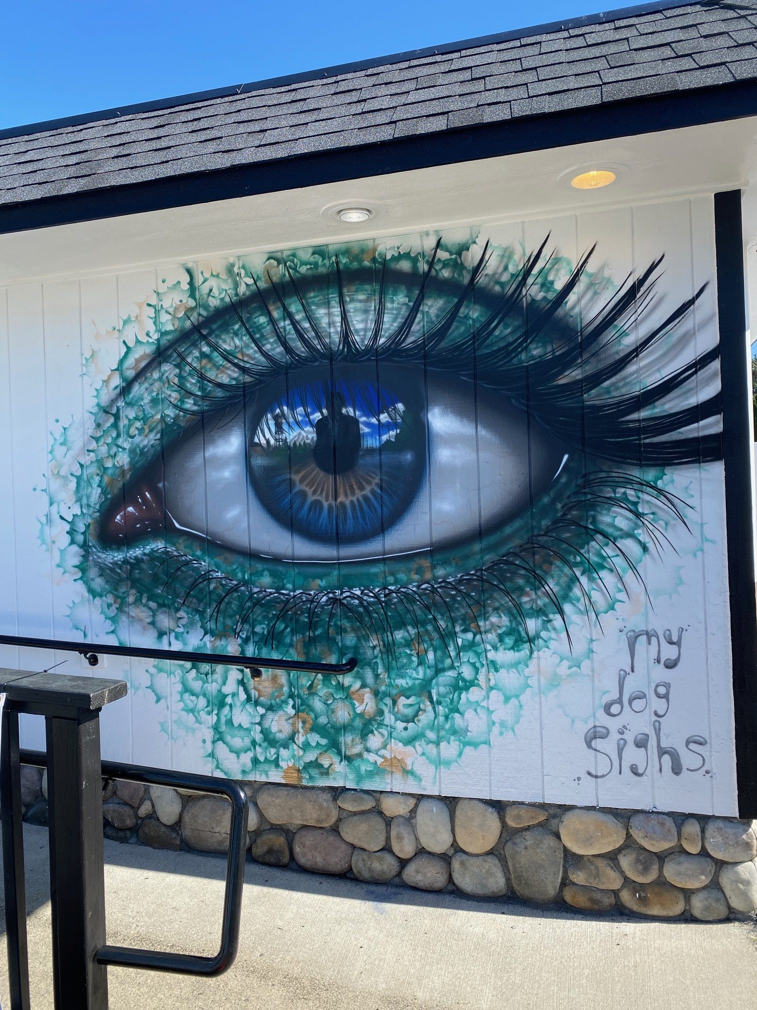 For the main festival wall, I created an eye mural, which is a signature of mine. The subject of the reflection is determined while I paint; for this eye, it was based on the grandson of the lovely lady who lives in the back half of the gallery building. To say she was happy would be an understatement!