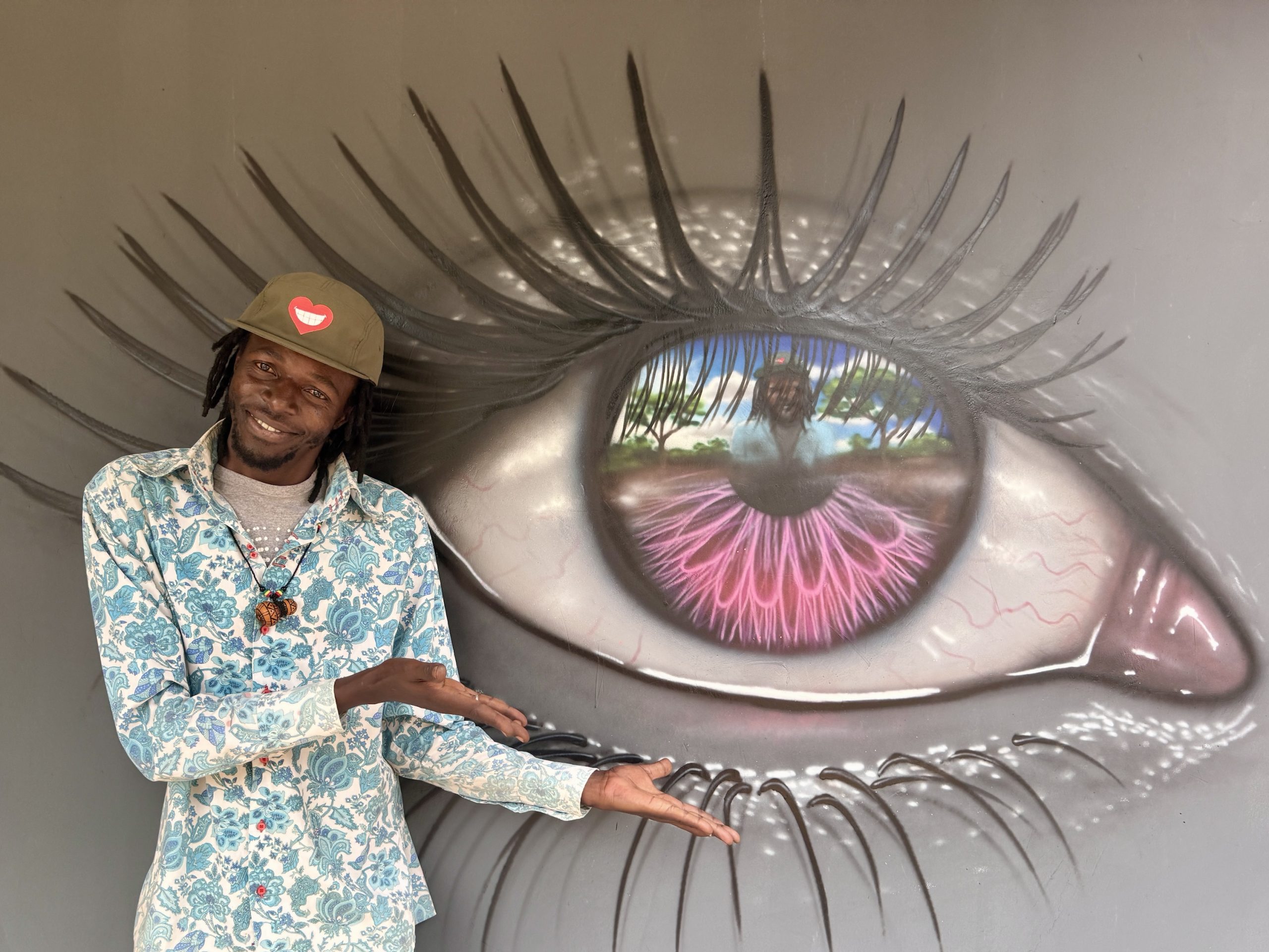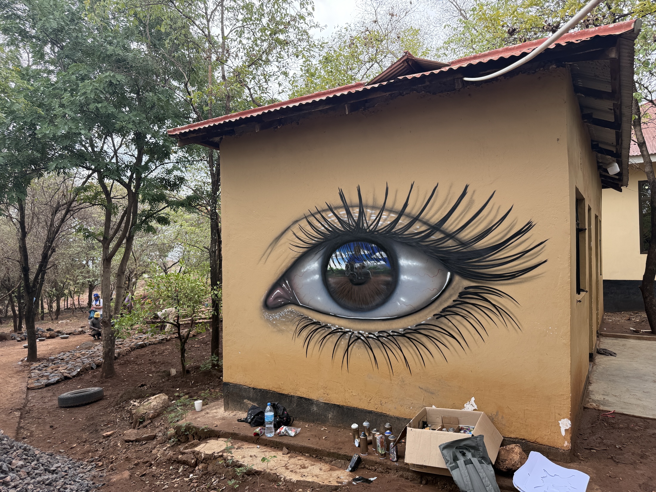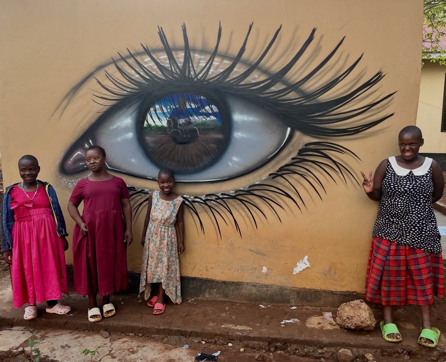 The now familiar hyperreal eyes created by My Dog Sighs appeared once more, luminous and watchful, yet within their reflections were the faces and stories of people encountered during the journey itself. Ebaneza, aged eight, appeared in the first mural at Feathers Gate, held within the iris as a quiet declaration that he is seen and valued. At Angels Gate, another reflection honours Ochu, whose path from street youth to art teacher represents a powerful cycle of inspiration that began years earlier when visiting artists first painted at the centre.