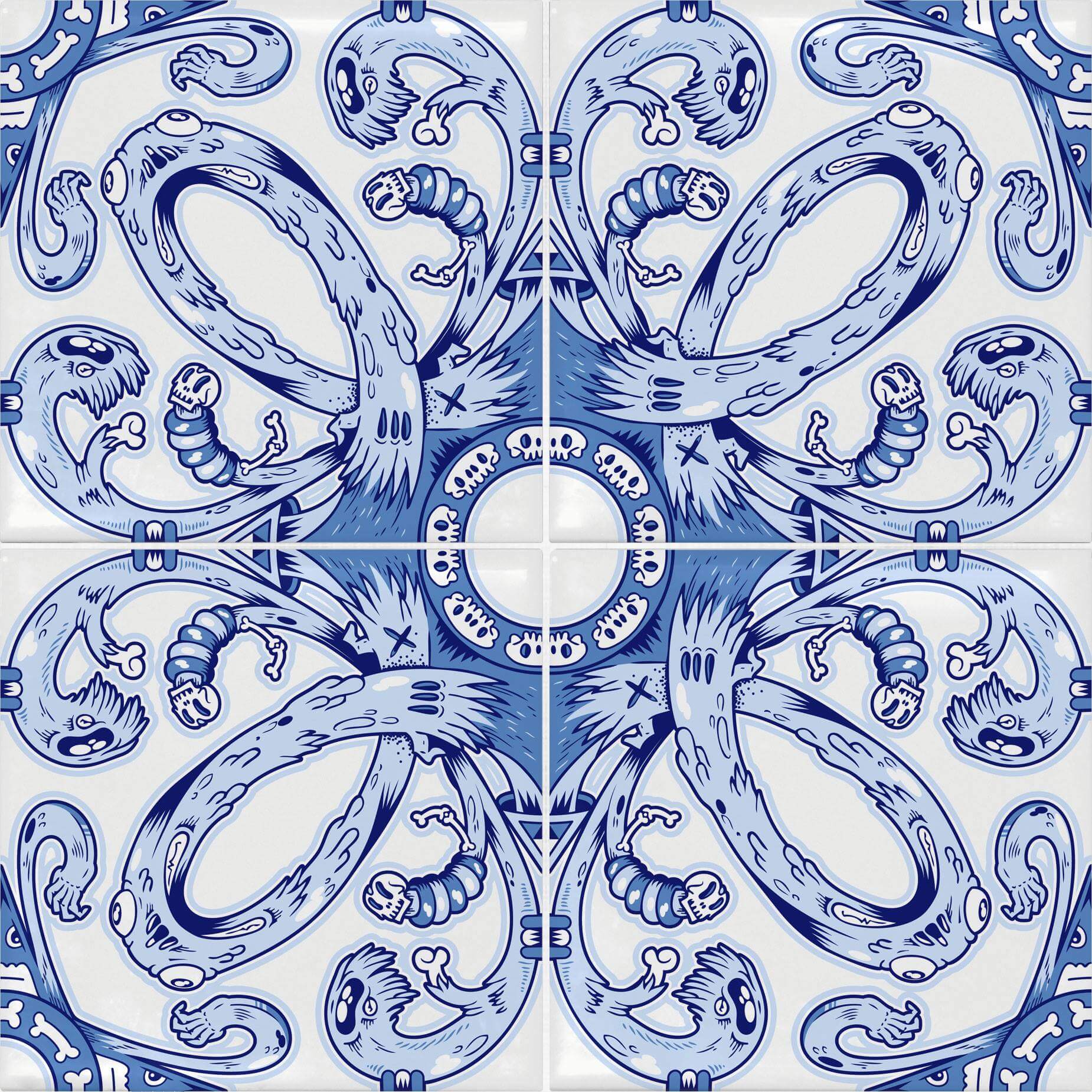 I think that the process was something natural for me yes. Tiles have always been a part of my culture. From the more artistic ceramic panels, to invitation figures, hunting and equestrian panels to the classical patterned building façades, this is something that is present in Portuguese culture. As I mentioned before, the process of merging my own drawing universe with the tile aesthetic was something that just felt right, the result was super satisfying and I felt that I needed to explore that path. Ten years later, here we are.