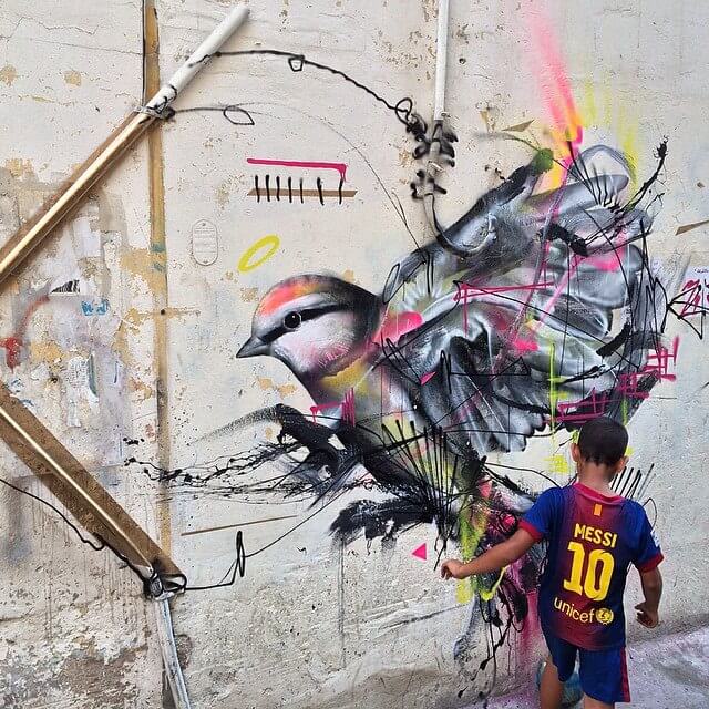 Luis Martins was at a young age when he first met spray paints and this experience opened the door for his street art work. While exploring mixtures for his work, Luis tried many techniques and finally created his unique approach by using china ink, latex, pastel, acrylic, anything and everything to generate the sophisticated chaos his artwork portrays. L7m undoubtable artistic skill cleverly mixes with, passion, human emotion, beauty of life, city’s disarray, neglect and of course the surroundings. All these concepts are transposed and are influential to the street works by this extraordinary artist. His love for freedom, signified with his bird paintings, now takes him travelling around the world…and GS were lucky enough to catch up with L7M for a chat. Check it out…
