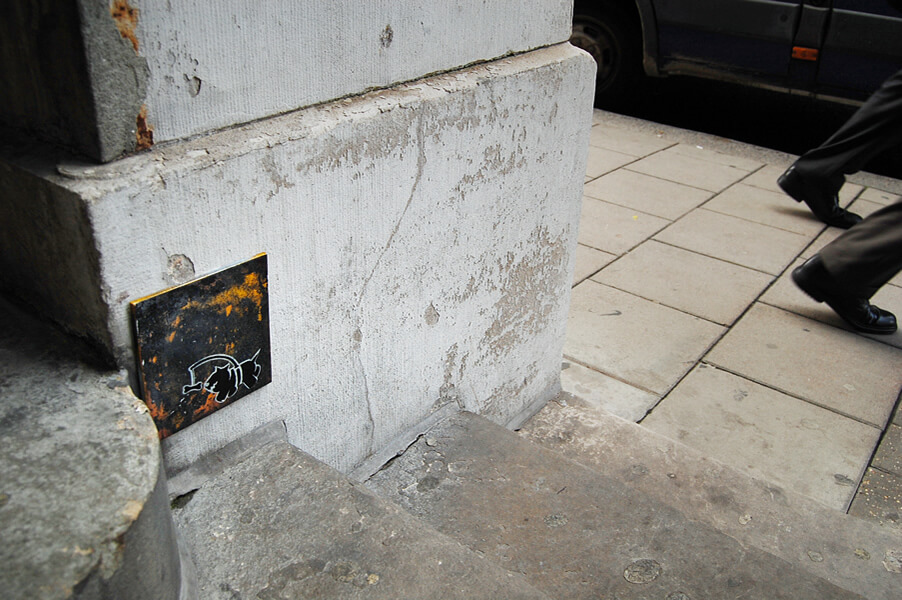 I’m from Oxford here in England and it’s been so long I can’t really remember how I got started. I’ve been stenciling for over a decade and I could probably look at an old interview from the past to remember how it all began. There isn’t really an ‘urban art scene’ in Oxford, I just liked painting things in the street. At first it was the usual photoshop photo filtered thing you see from anyone who starts stenciling. Even then I was painting cats and dogs, hah. It eventually progressed to taking the figures you see on street signage and bringing them to life; taking them away from the signs and letting them play in the rest of the street.