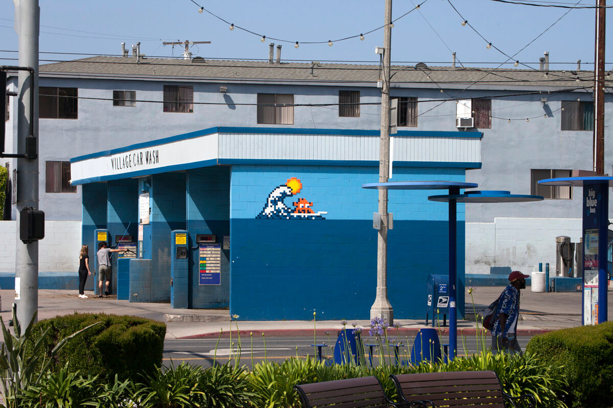 As you approach the car wash, you’ll have the chance to catch a glimpse of a space invader figure known as ‘The Surfer of Santa Monica’. Invader appears to have been inspired by the iconic artwork of Hokusai ‘s Great Wave, as evidenced by how the space invader happily rides the waves on his surfboard.