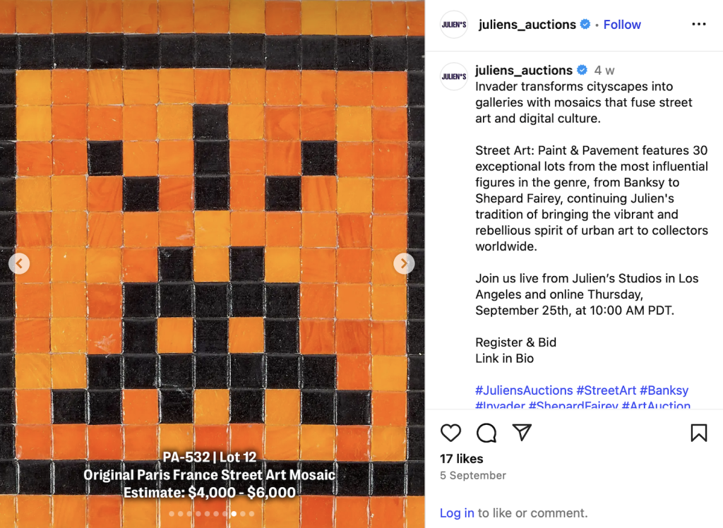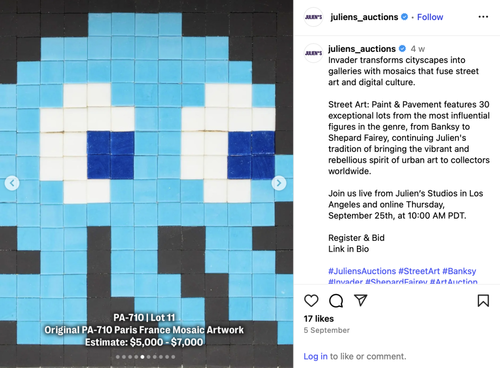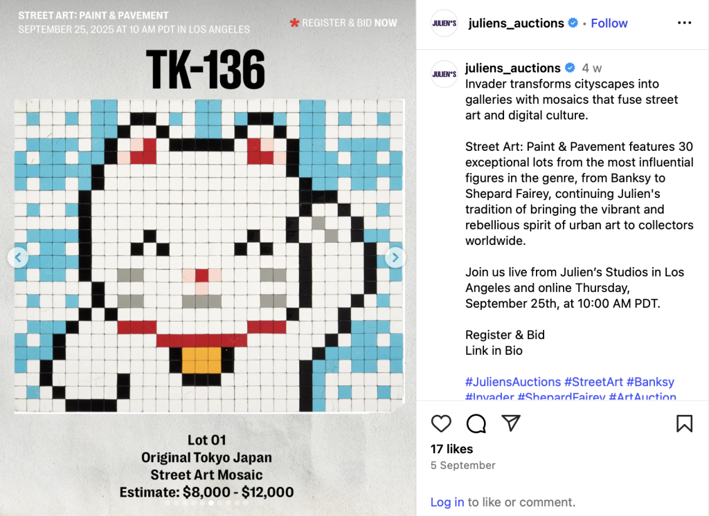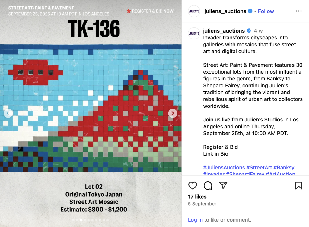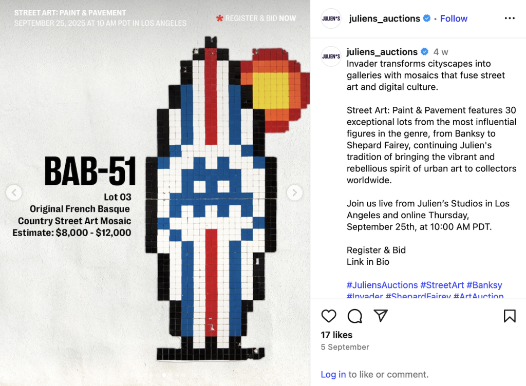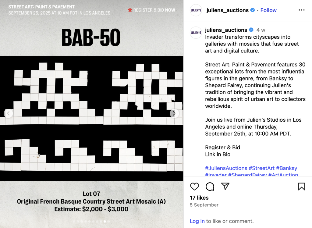 Juliens Auction Instagram posts promoting ‘Street Art: Paint & Pavement’ on 5th September 2025