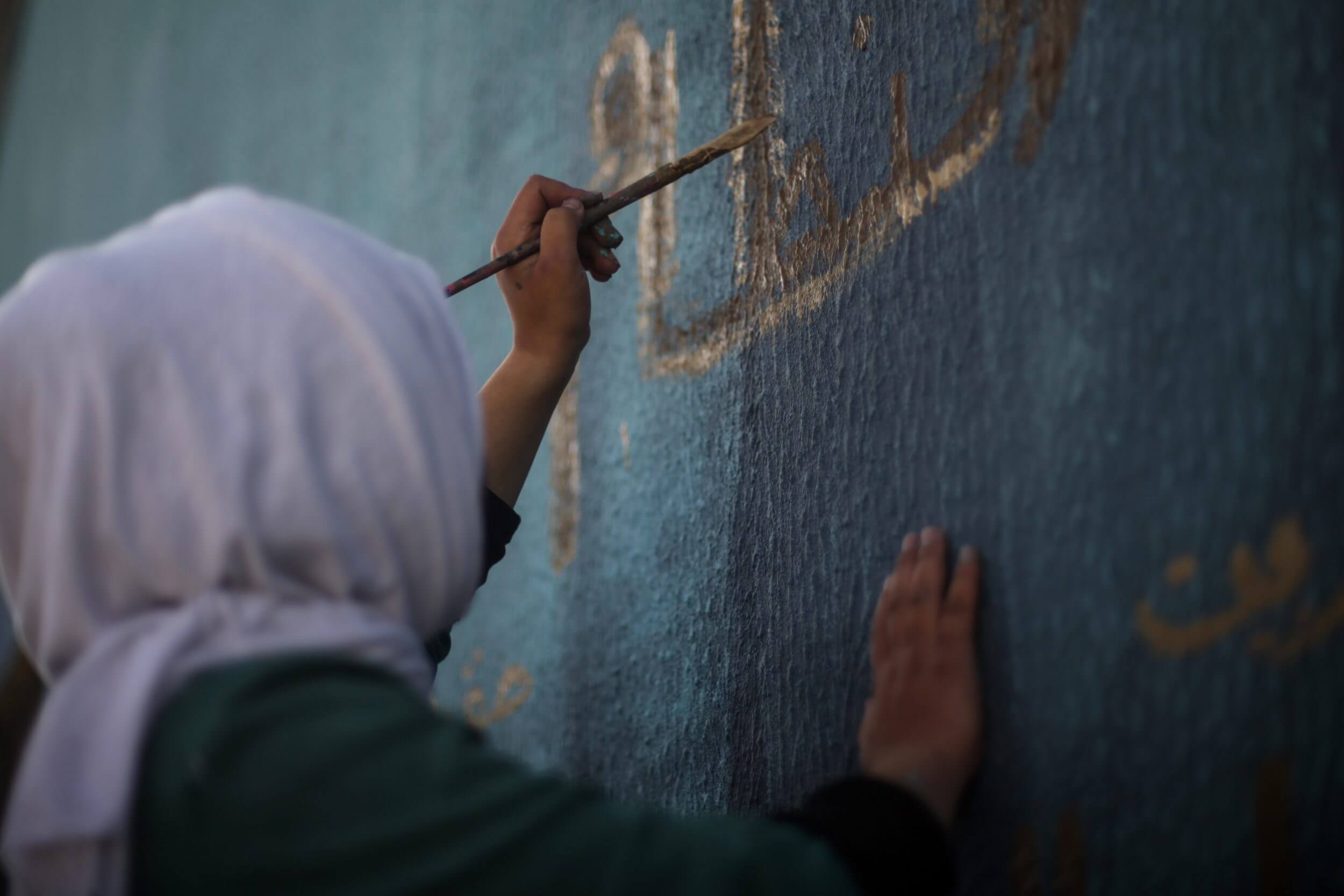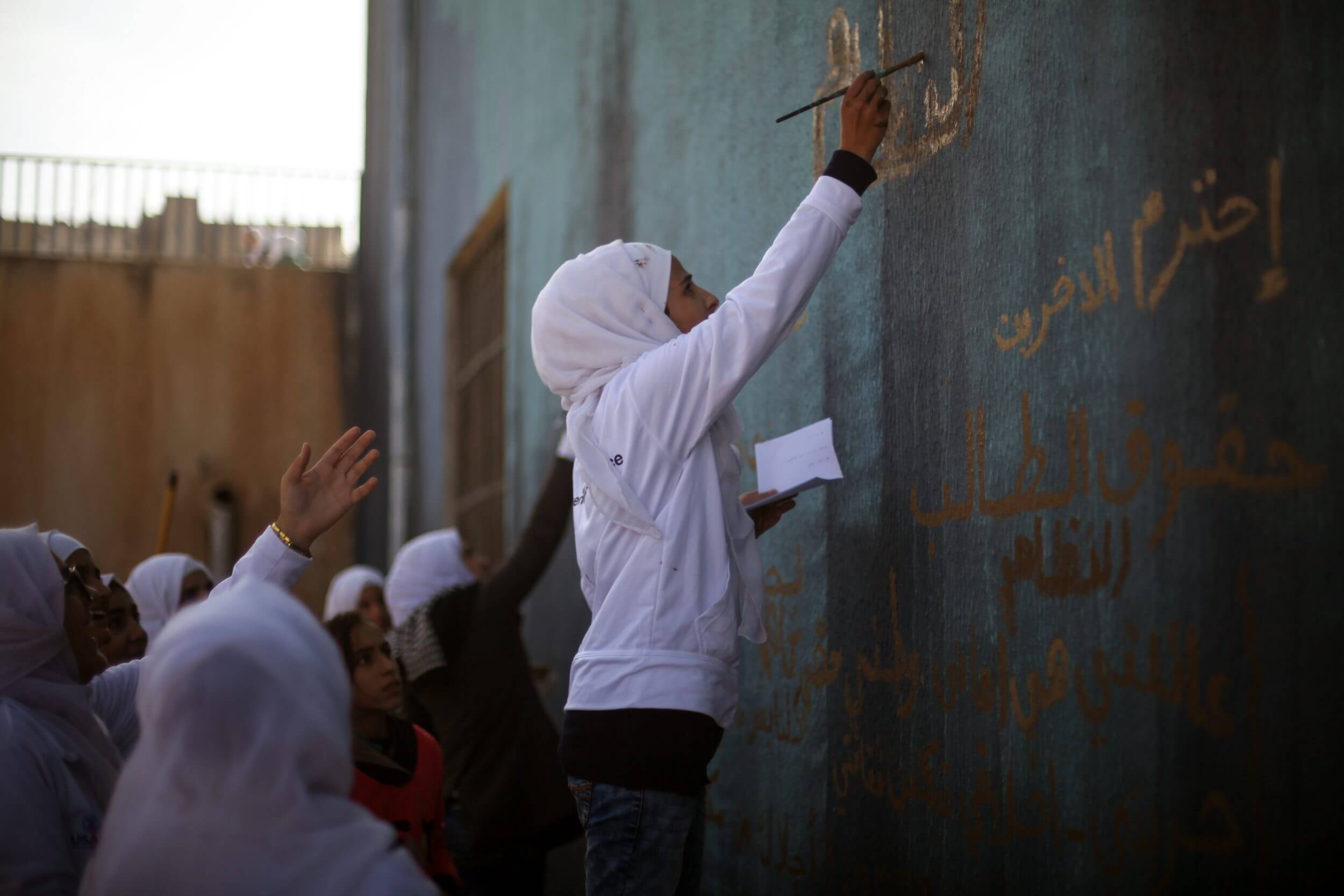 There are many male role models images in Jordan, but there are no images of female role models… and aptART were ready to change this! In an effort to inspire the young girls a meeting was held at the school and the pupils were encouraged to discuss issues most important to them, such as freedom, equality and empowerment. The girls then painted their words onto the wall.