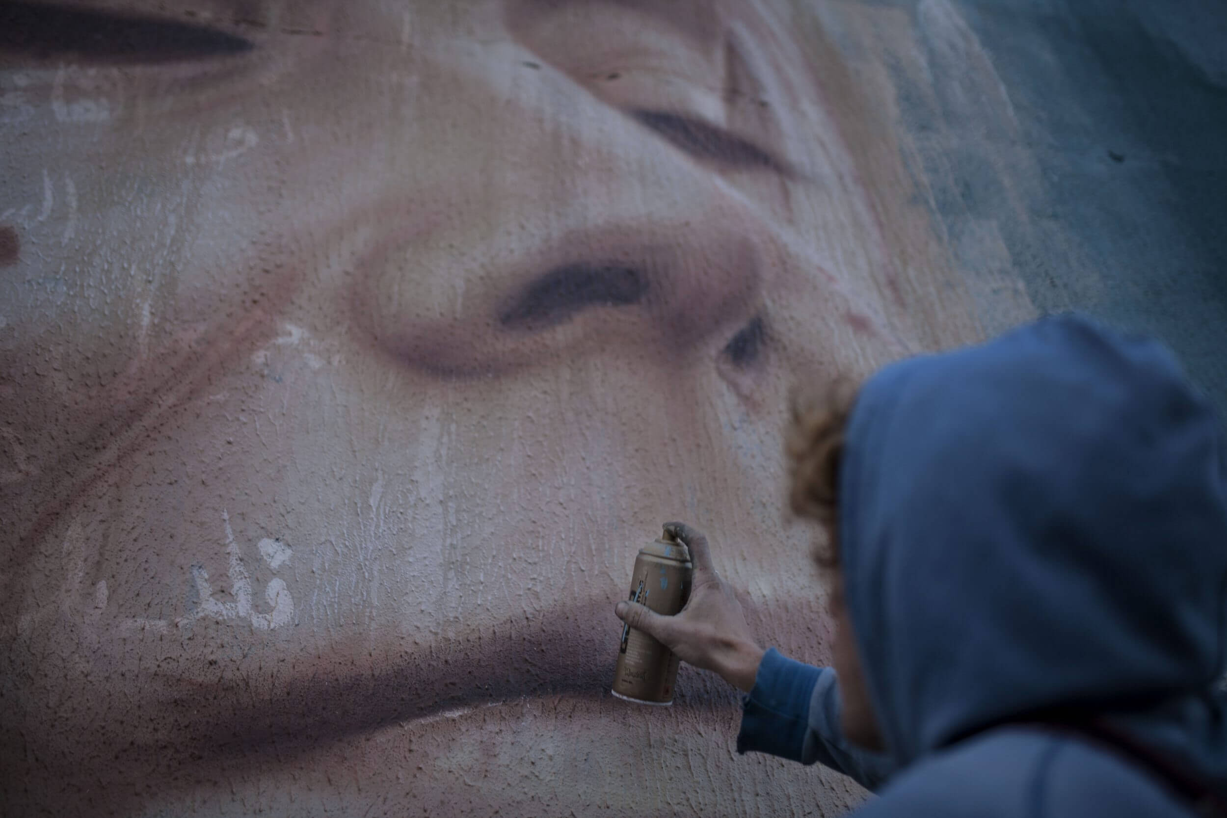 The messages ascended up a massive wall into the face of a peaceful and strong woman. Her face is adorned with tattoos traditional to Jordan and the Levant. Inside her hijab reads…