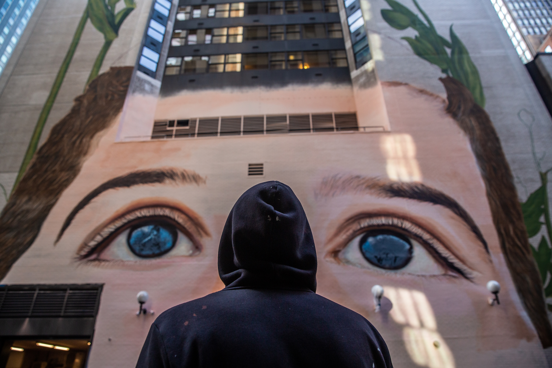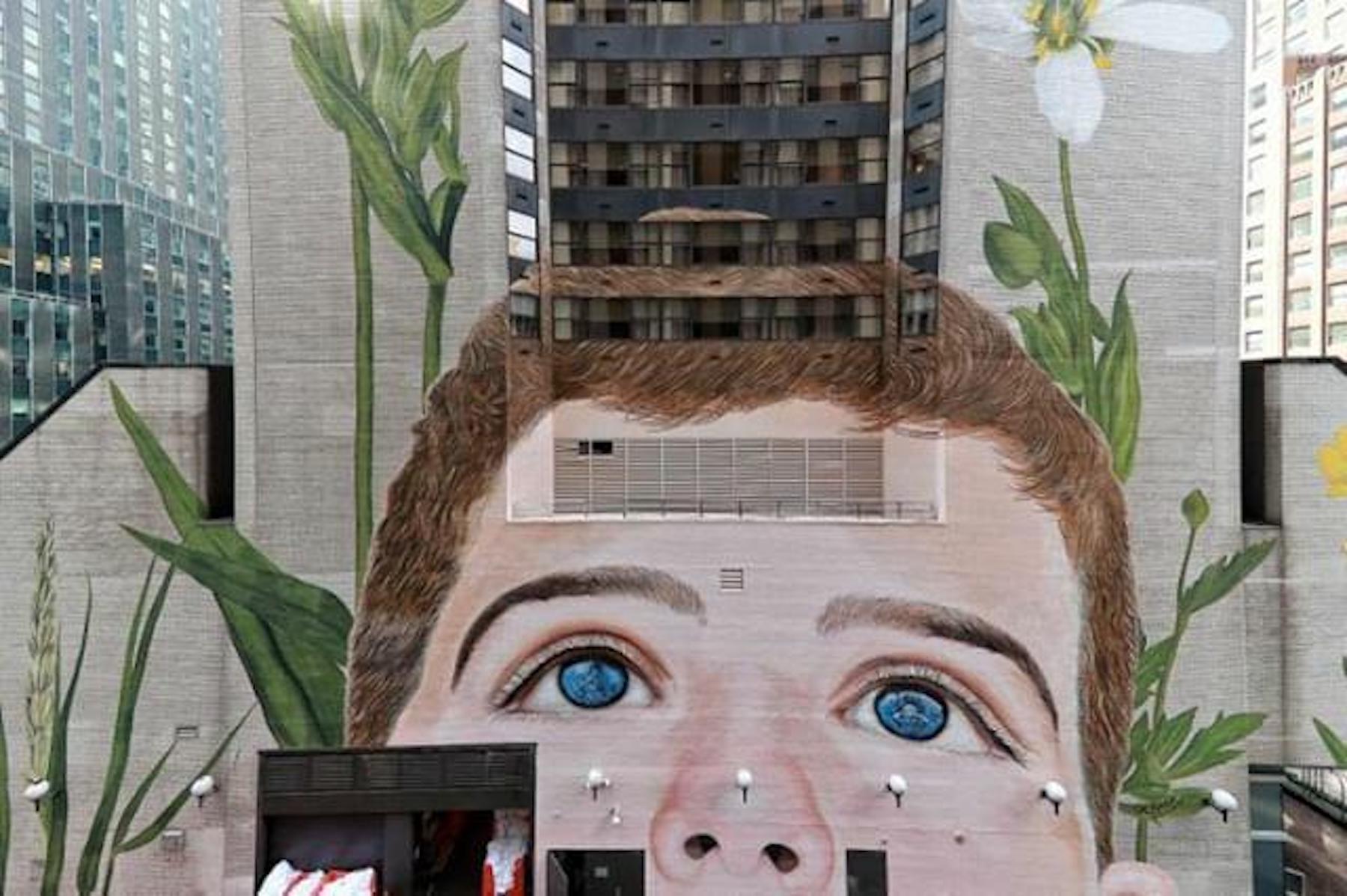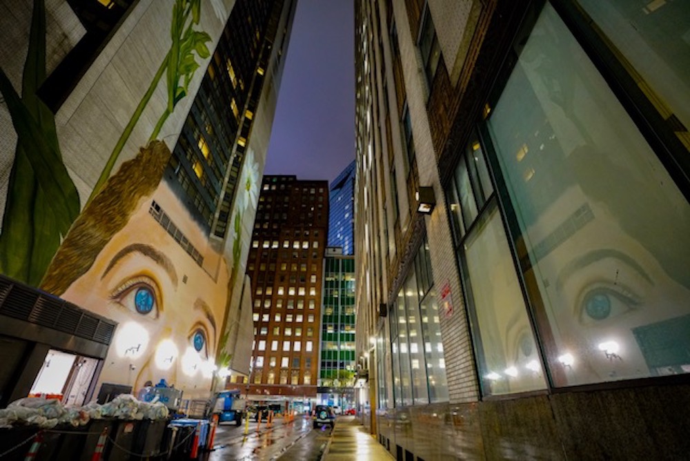 The colossal piece with a message to match rises in the Westin NY Grand Central Hotel facade in Manhattan was curated by ONG Street Art For Mankind in collaboration with the International Labour Organisation of the United Nations for its 100 years anniversary.