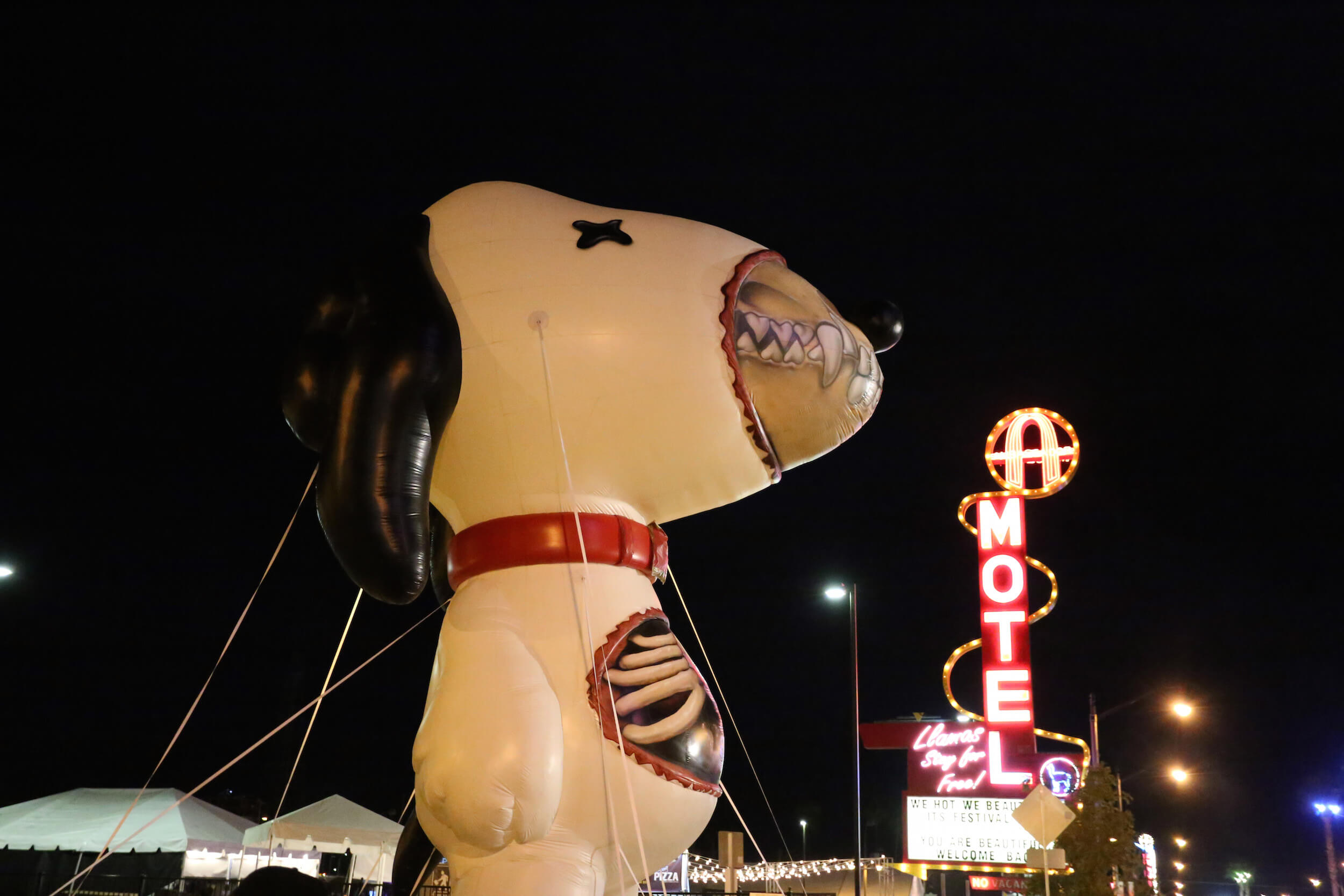 Gigantic ( 35 feet tall and 20 feet large!) Godzilla-like inflatables of Zombified Hello-Kitty and Undead Snoopy, by D*Face… along with his ‘Pistol Peace’ piece…