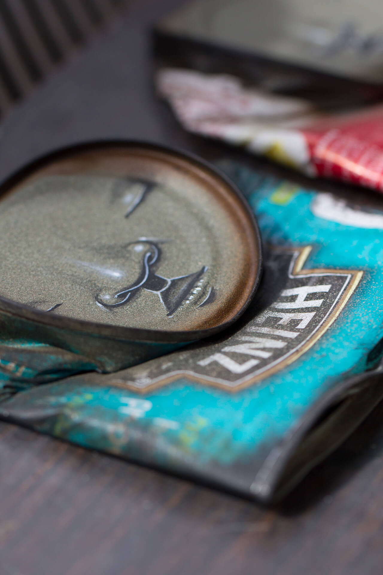 “One morning while looking for a spot to drop my FreeArtFriday I kicked a baked bean tin across the pavement. It had been flattened by traffic and lay squashed and rusted at my feet”.