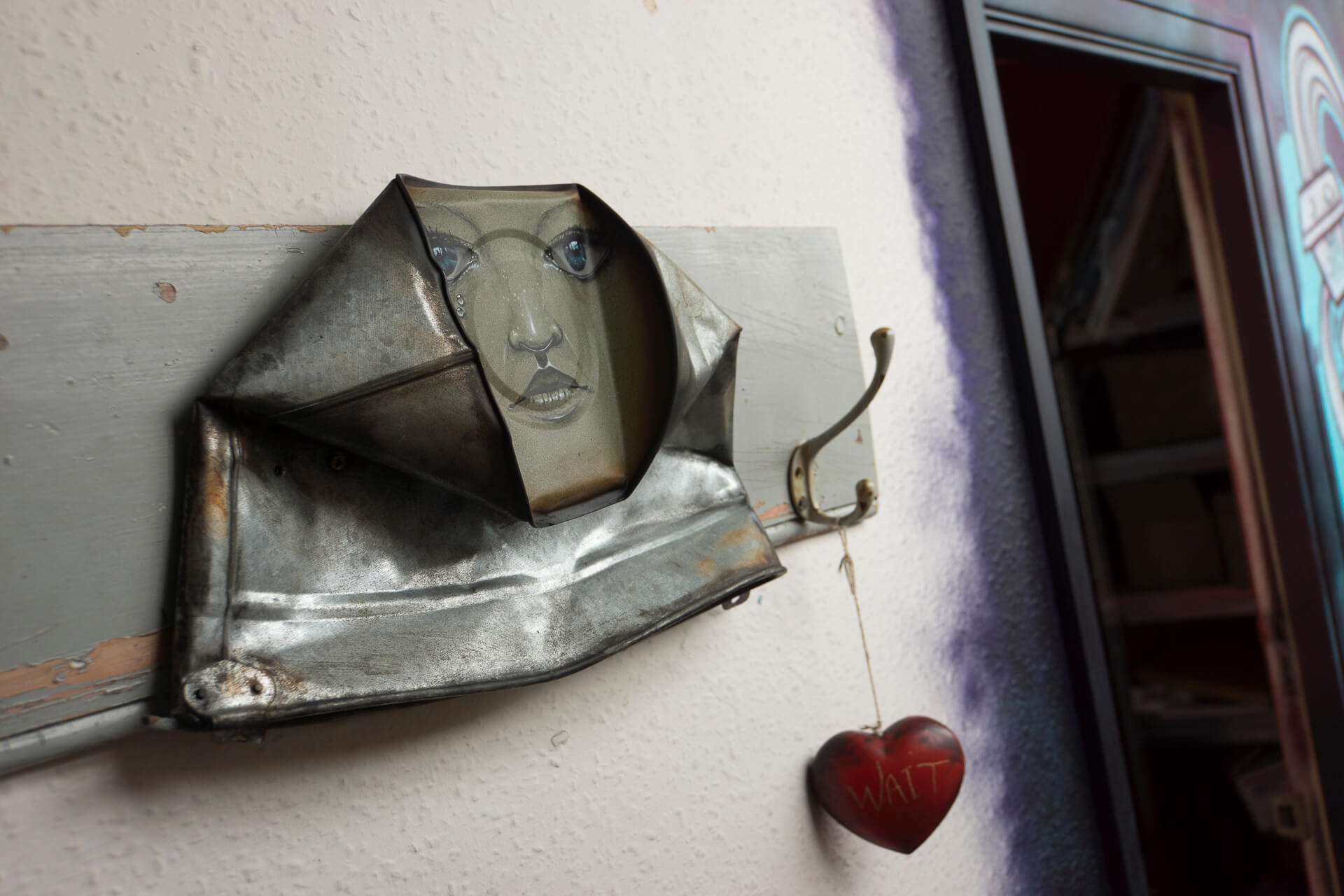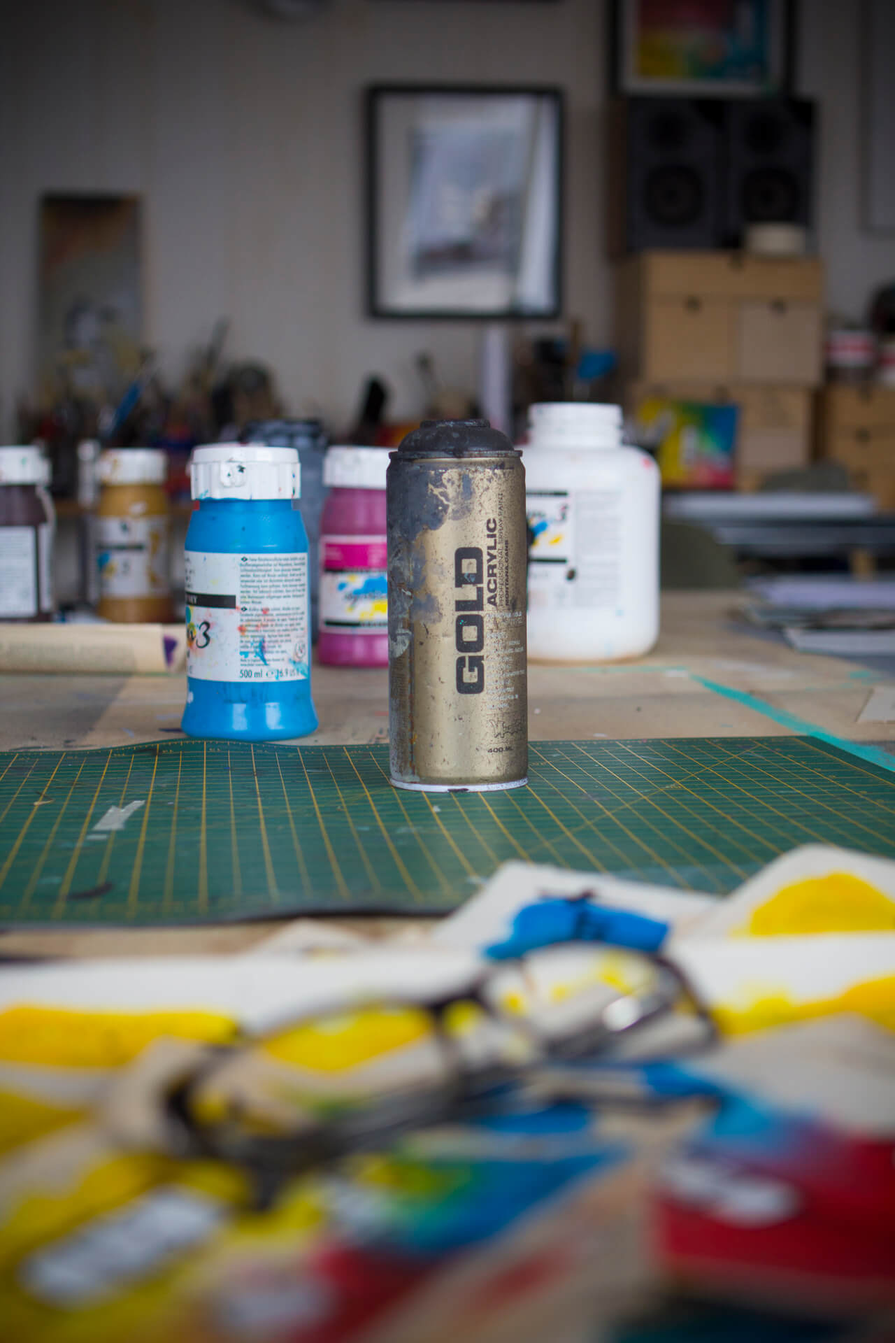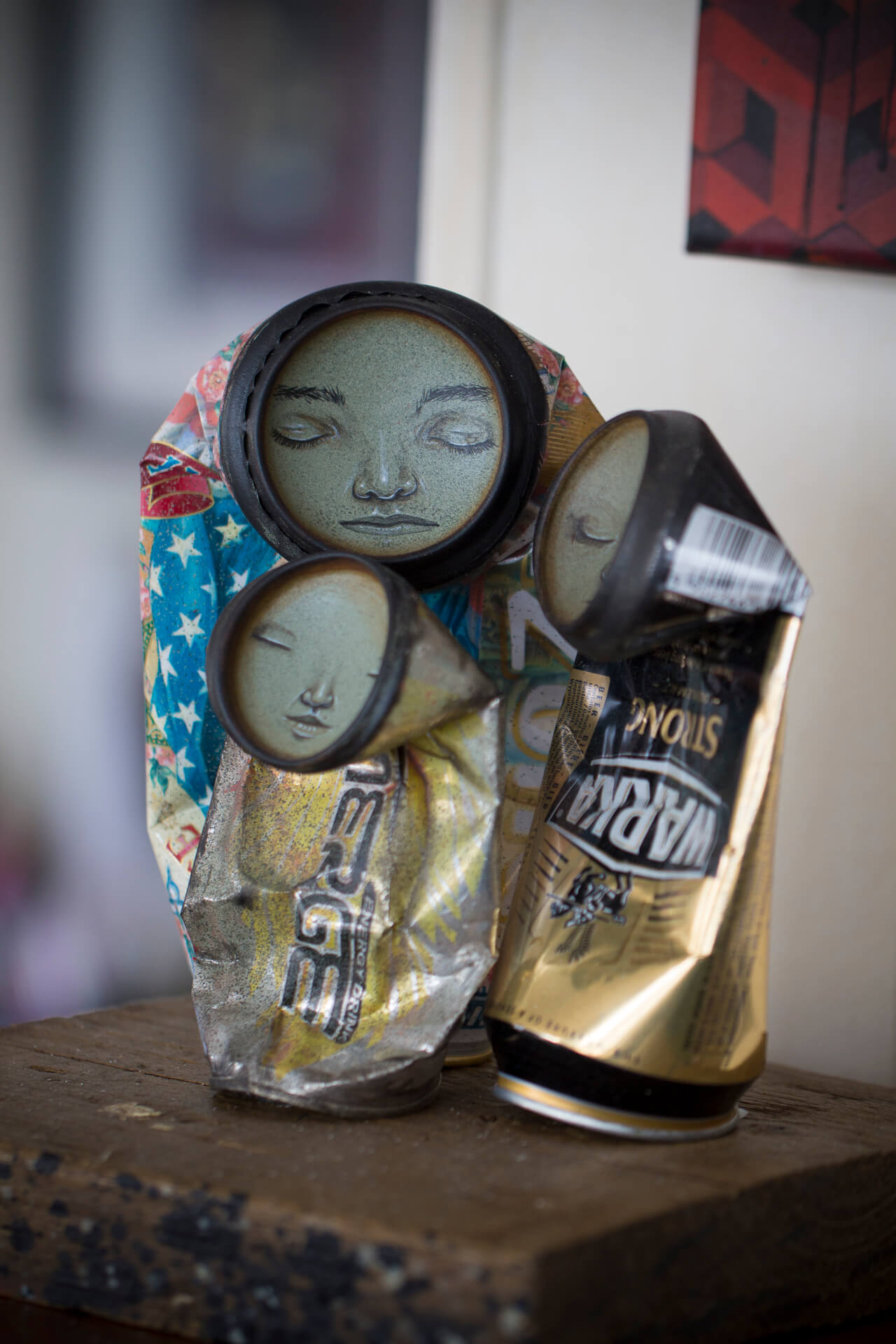 “Canvases aren’t cheap and add the cost of materials for something you’re giving away adds up… The solution to both problems came perversely thanks to our throw away society. Doors, timber, paint can lids and cardboard became my canvases of choice”.