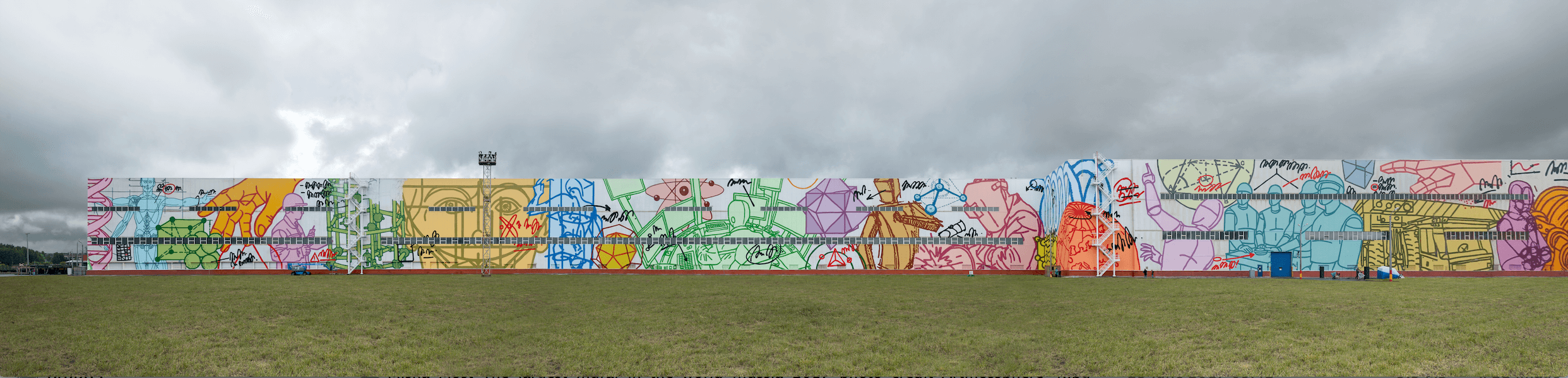 The name of the painting is Evolution-2. It covers the facade of the “Stan-5000” industrial complex, one of the industrial complex buildings in the oldest Russian manufacturer Vyksa Steel Works, which is part of the United Metallurgical Company in the Nizhny Novgorod region. The mural was created by the artist and five assistants in thirty-five days, with short interruptions, caused by bad weather.