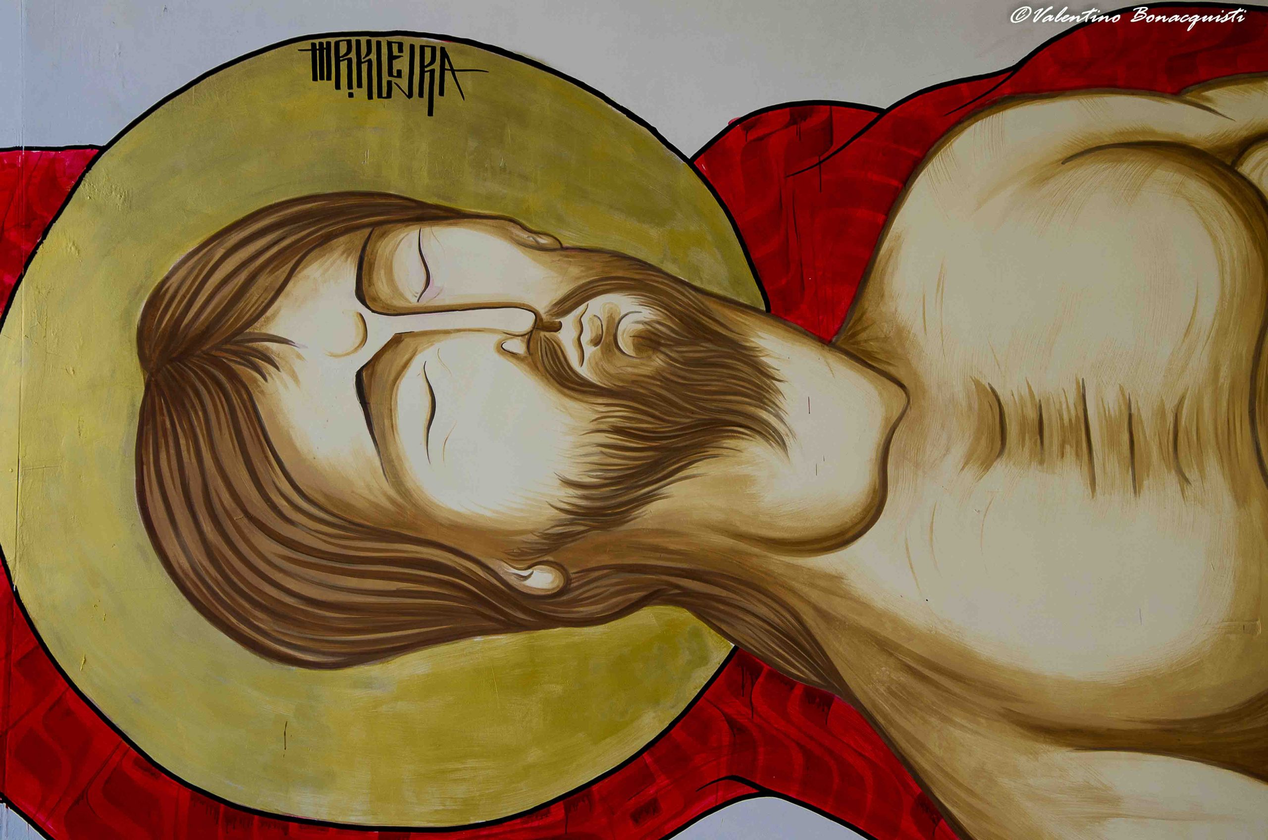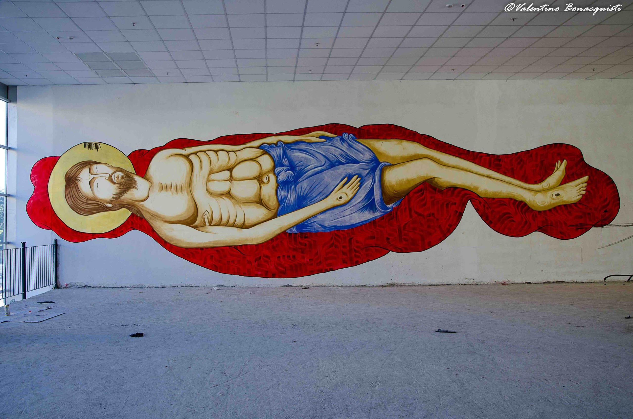 His first piece is entitled Ecce Homo “behold the man” and is from Ponzio Pilato stories. Mr Klevra painted this piece in an abandoned building in Rome where many homeless people sleep.