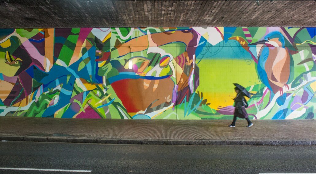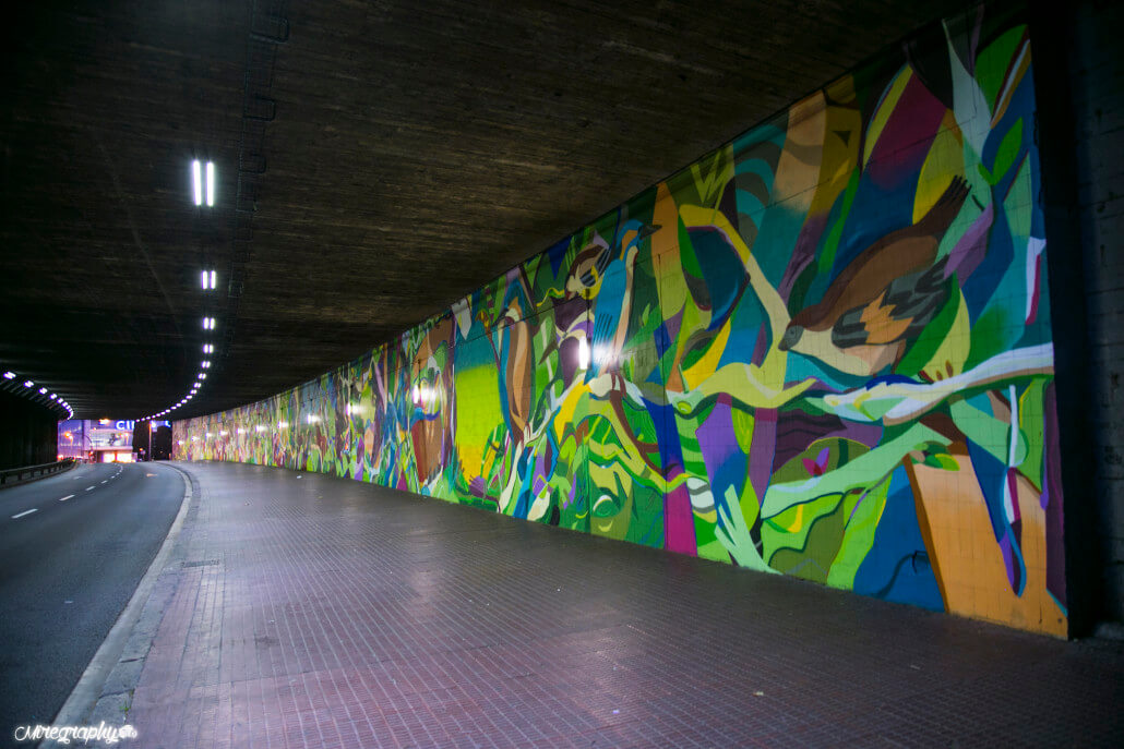 Urban artist, Kwets1 , was invited to paint an enormous mural that transformed the Avenida Isabel la Catatólica in the l’Hospitalet del Llobregat tunnel. It took 12 weeks to cover the 1000 m² grey wall, used 1250 cans of MTN94, and was sponsored by Mémora group and Hune, in addition to Montana Colors.