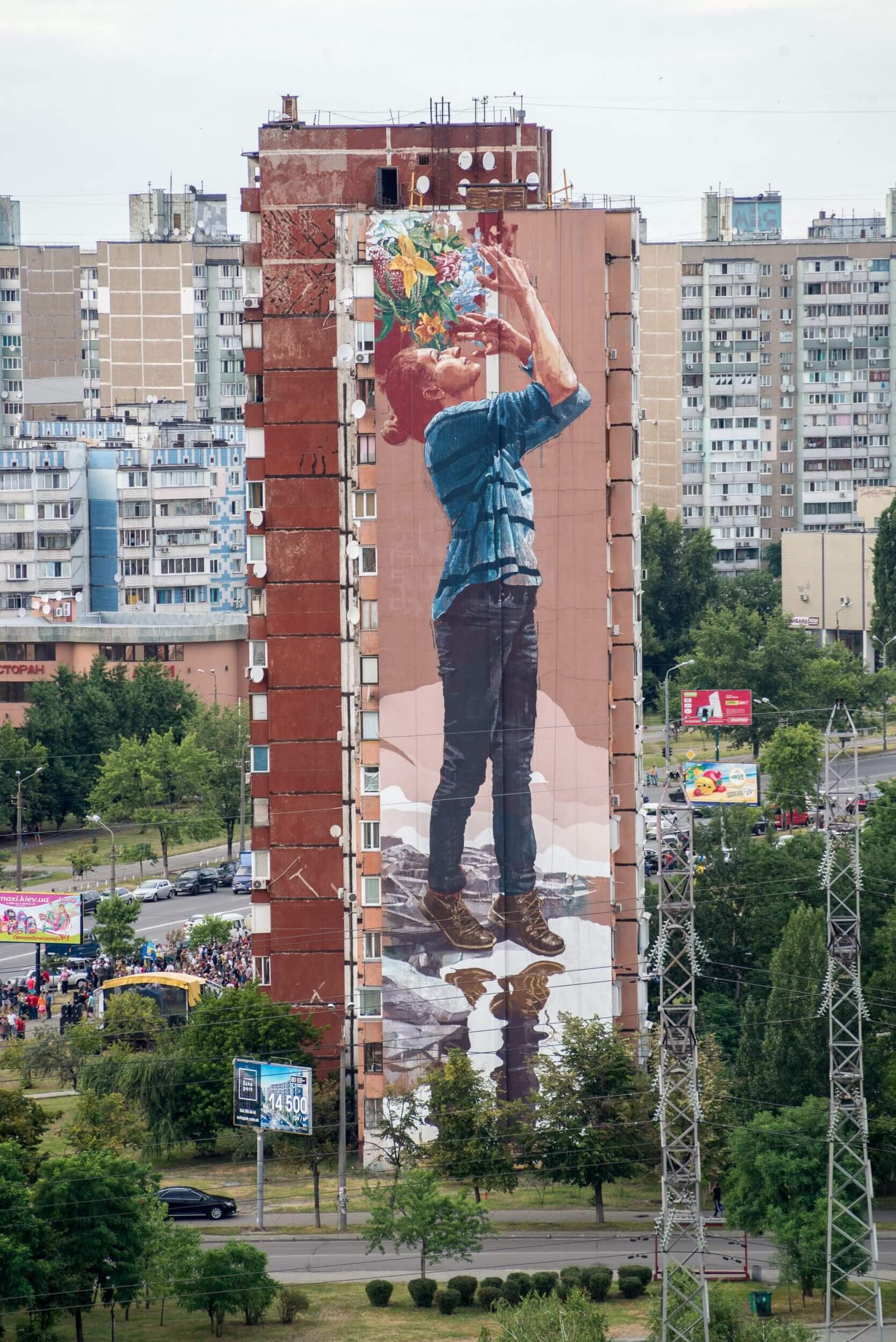 Fikos decorated a 16-floor high building in the capital of Ukraine. The name of the artwork is ‘Earth and Sky’.
