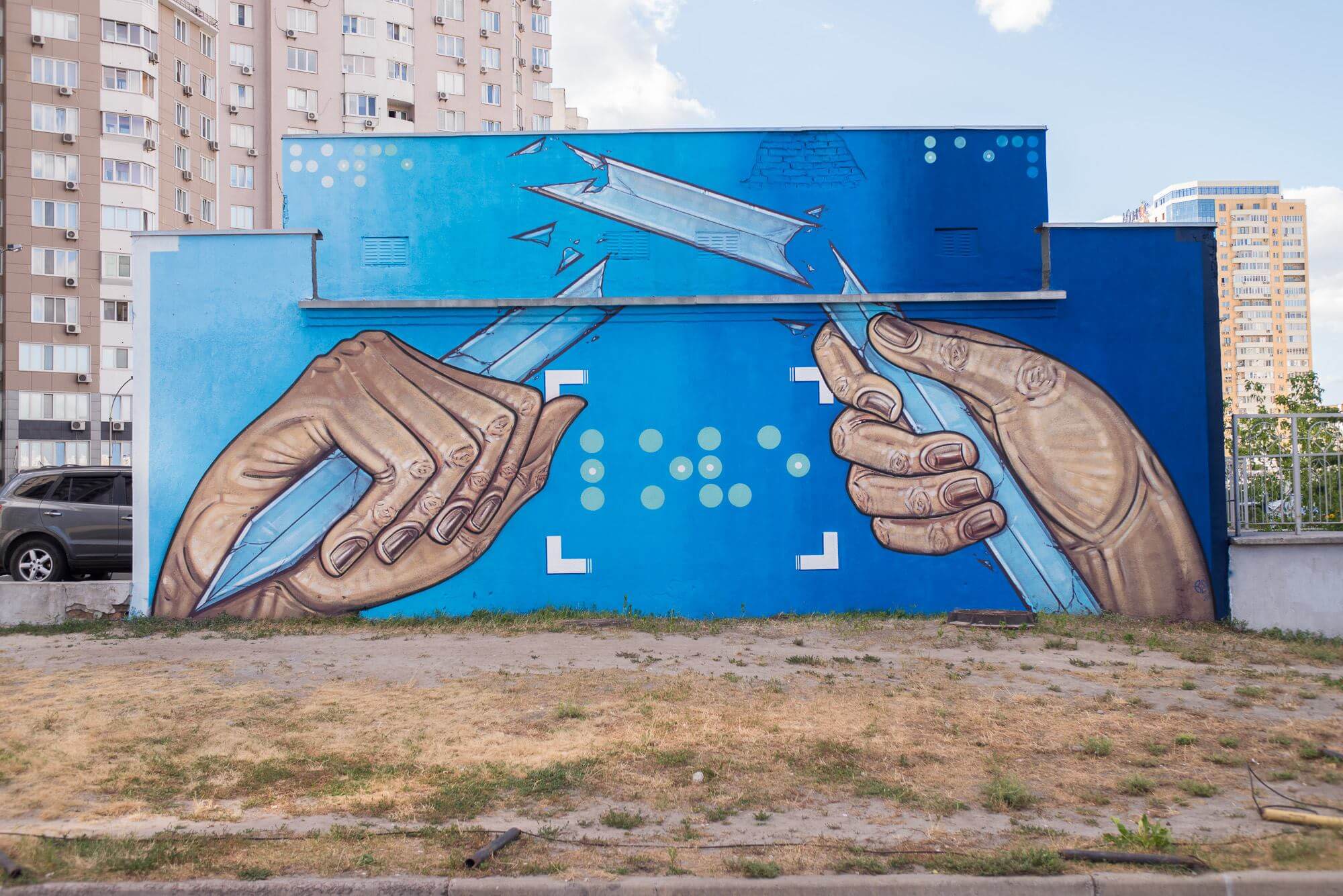 “The main characters of the mural are two hands breaking a sword. This is my manifesto against violence and cruelty, a call to mutual understanding. The mural also has an encoded Braille text that says Hope” Radkevych