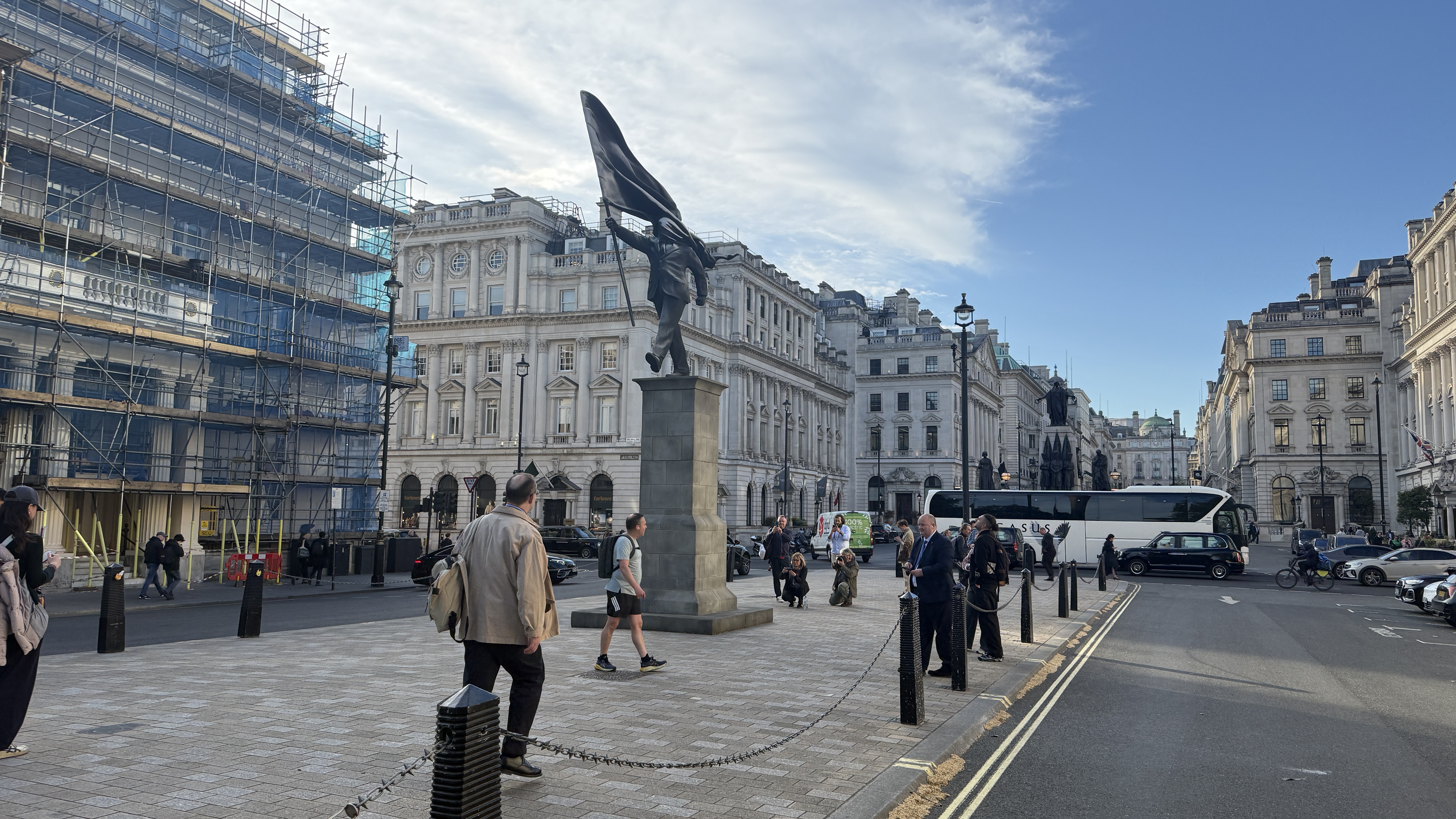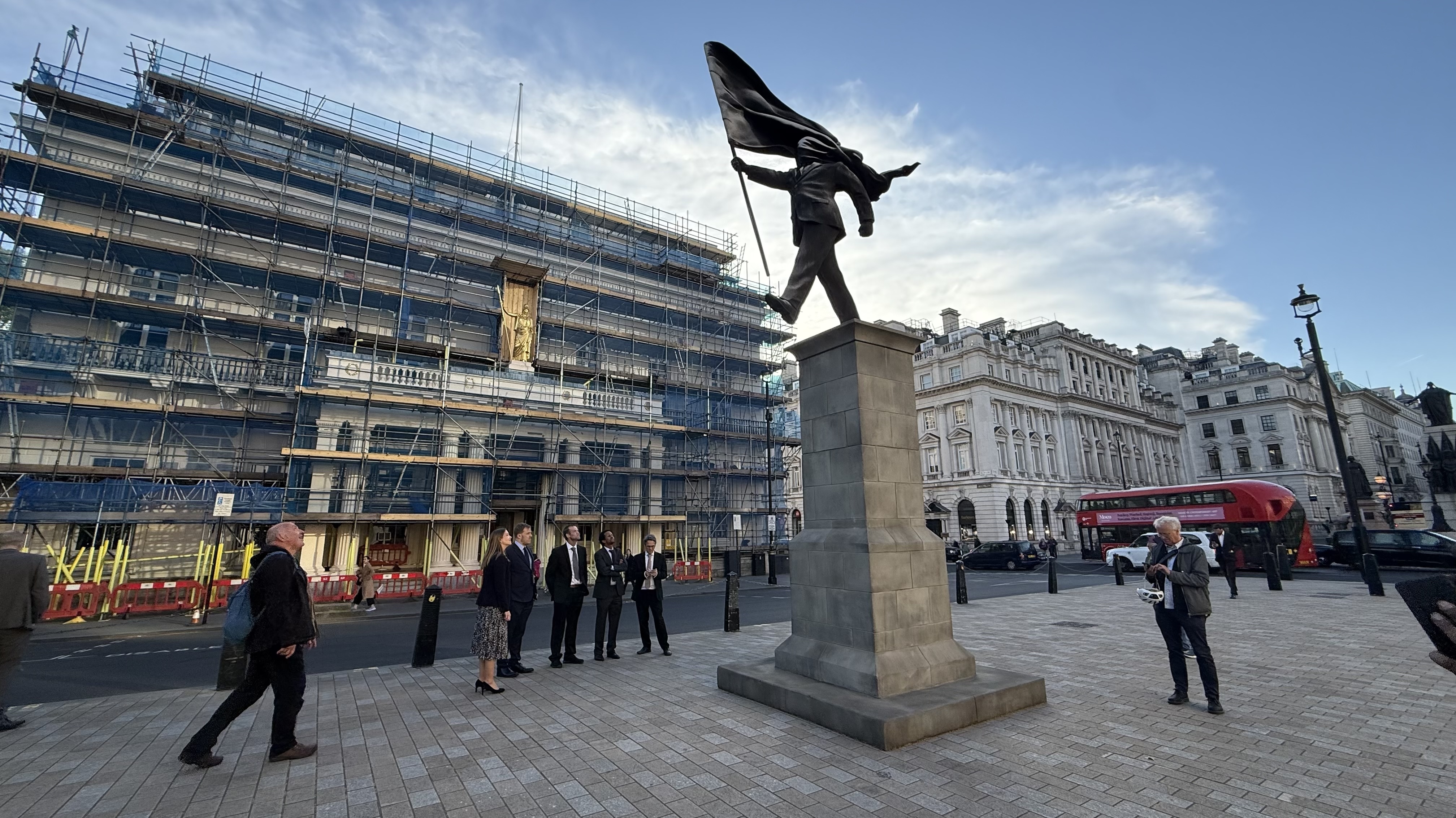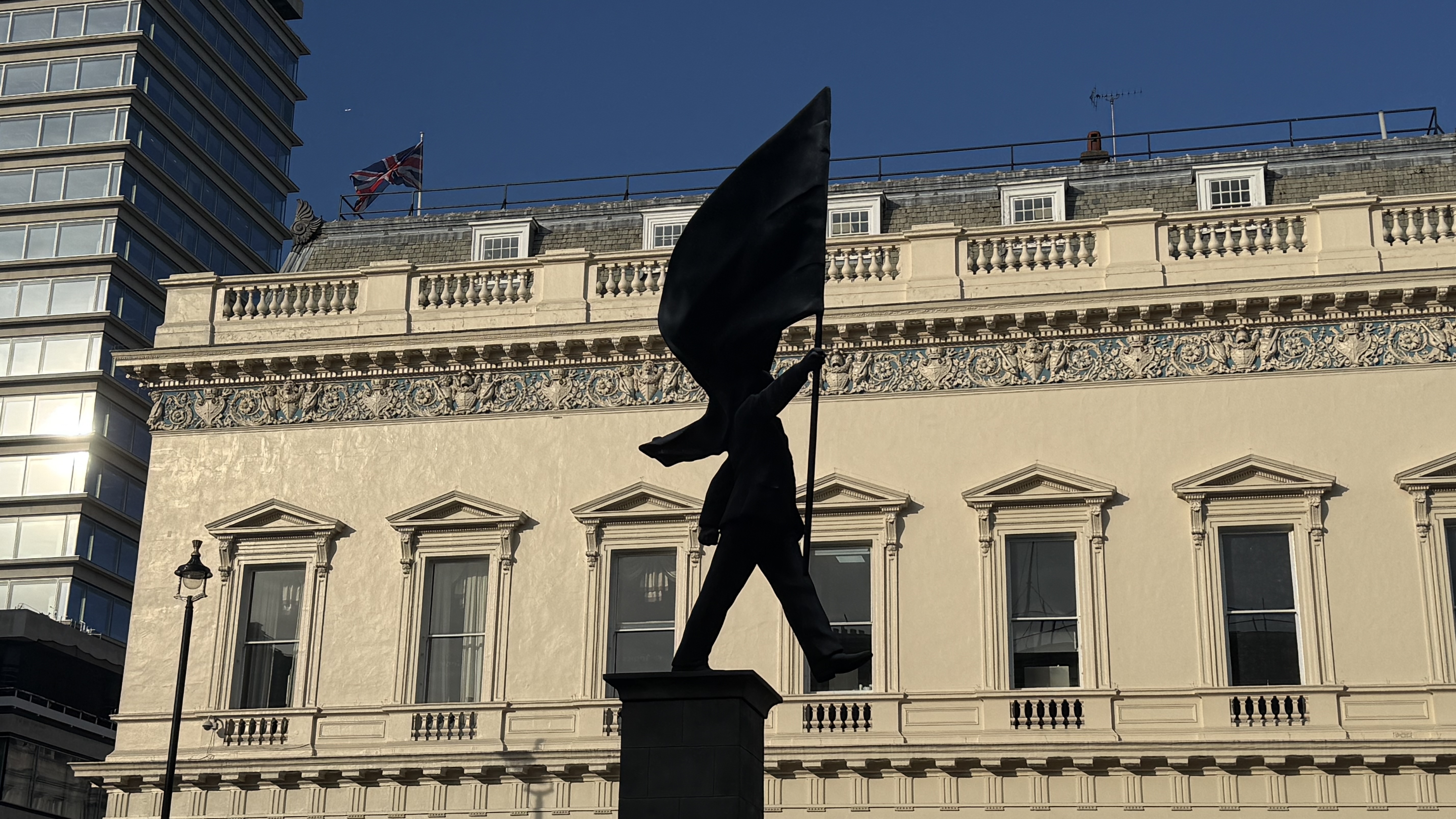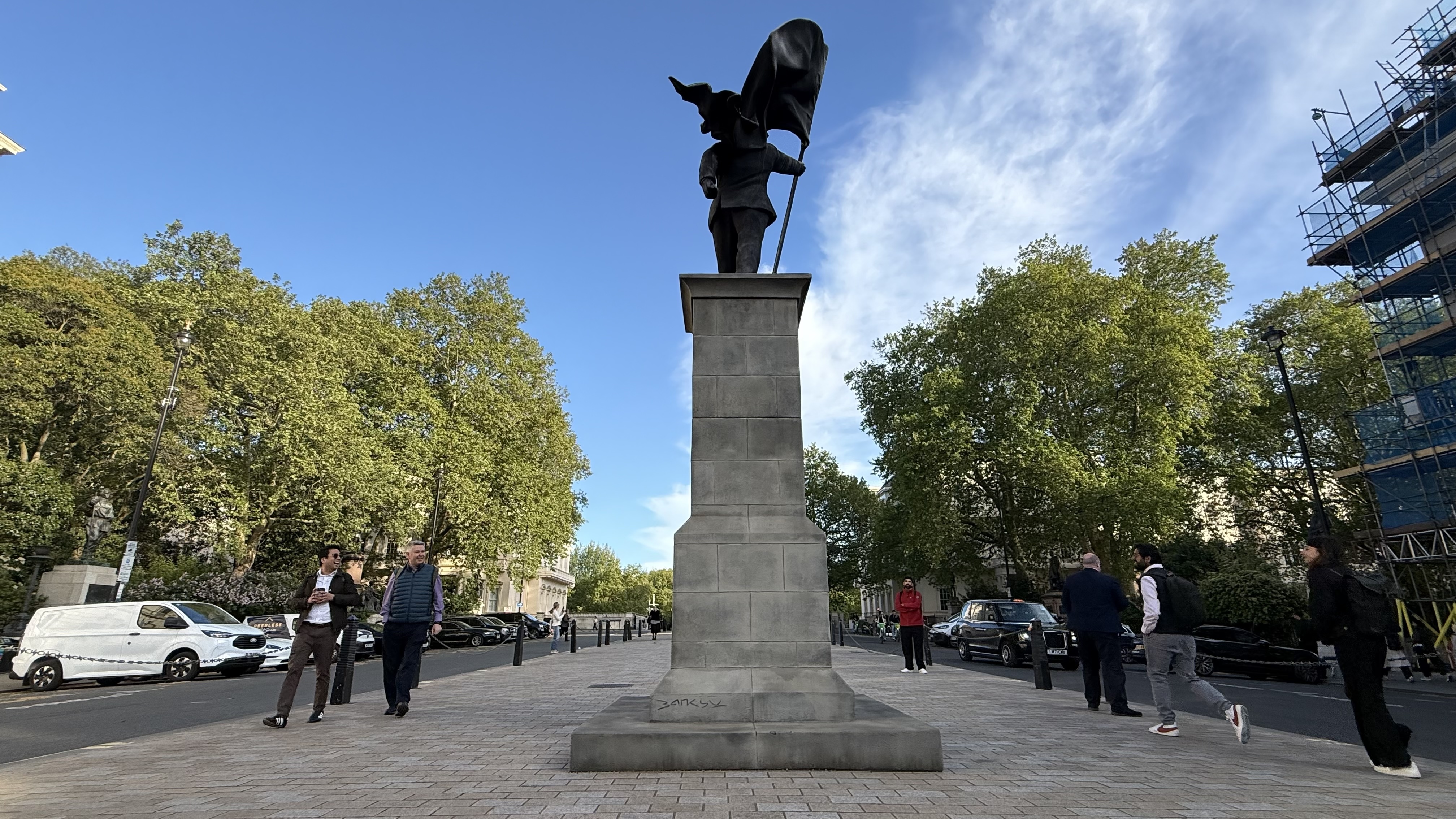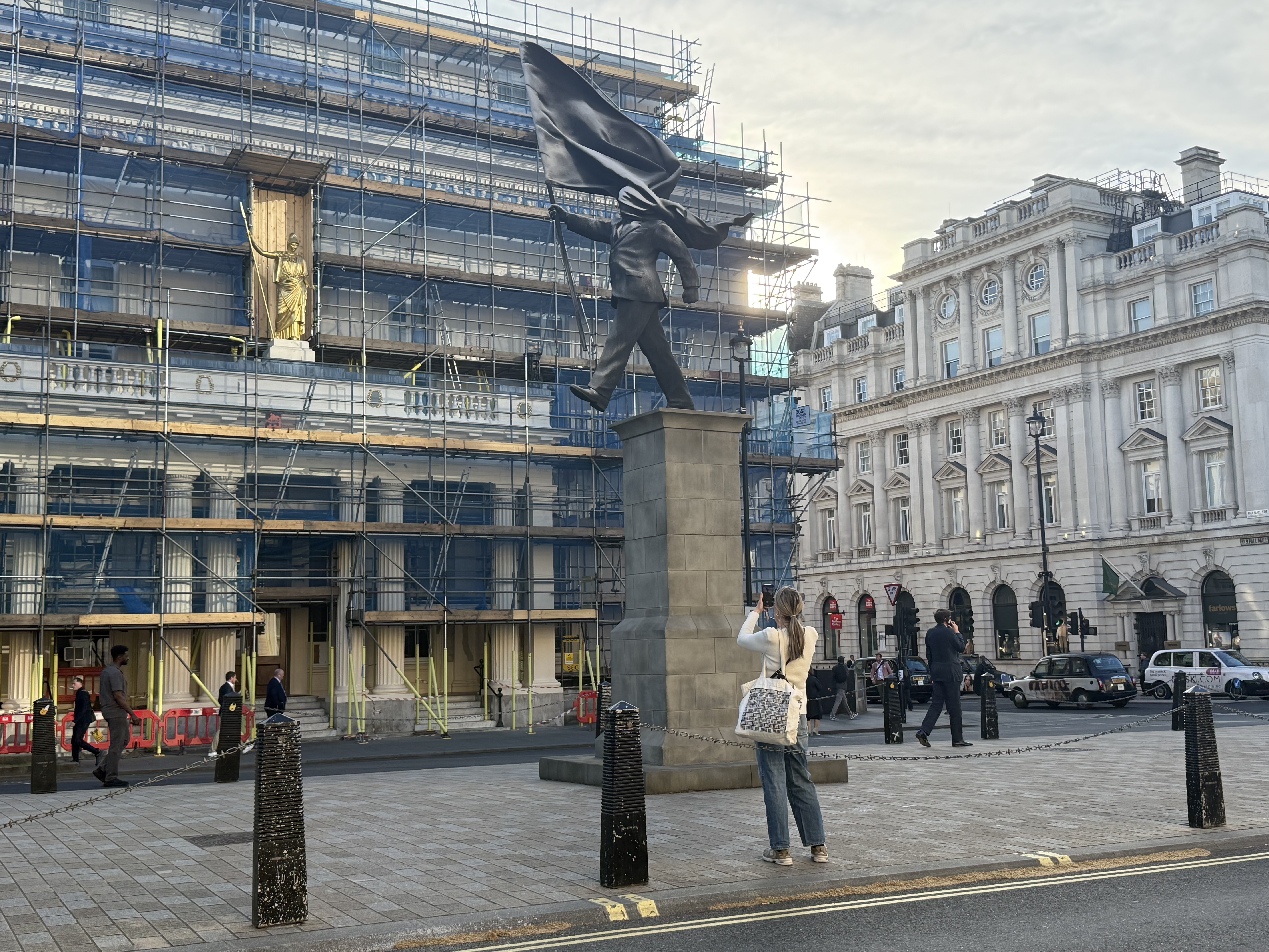 New Banksy Statue in London: A Suited Figure, a Billowing Flag, and the Edge of a Plinth