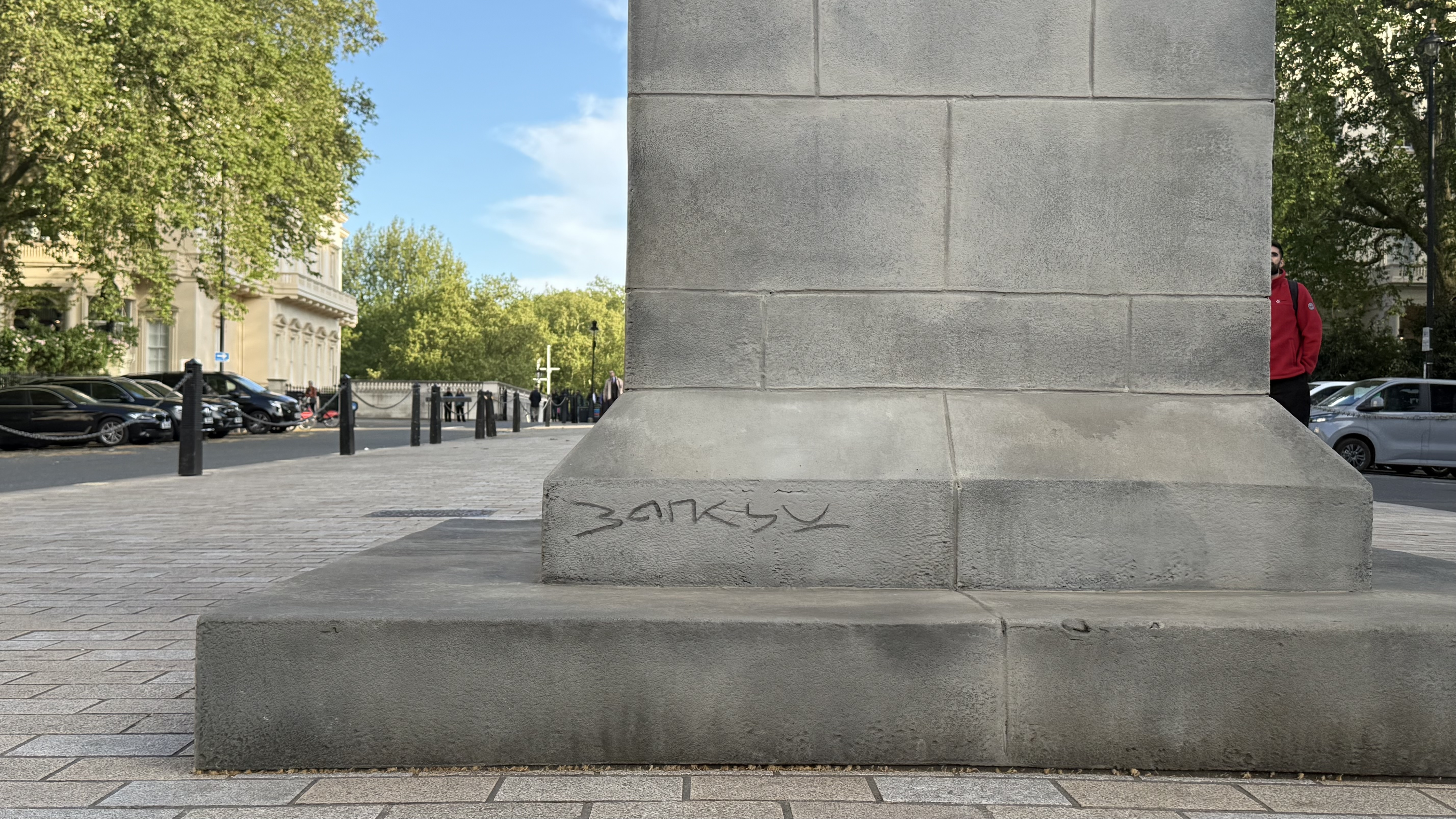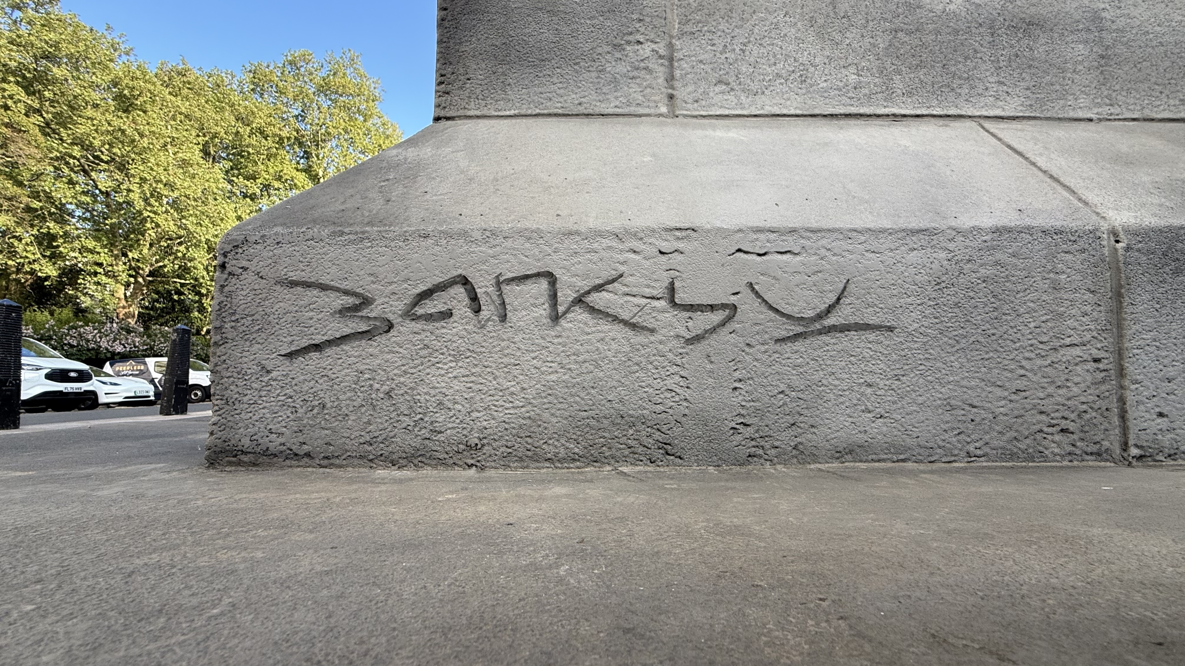 Banksy signature engraved on back of plinth Waterloo Place London 2026. Image copyright GraffitiStreet