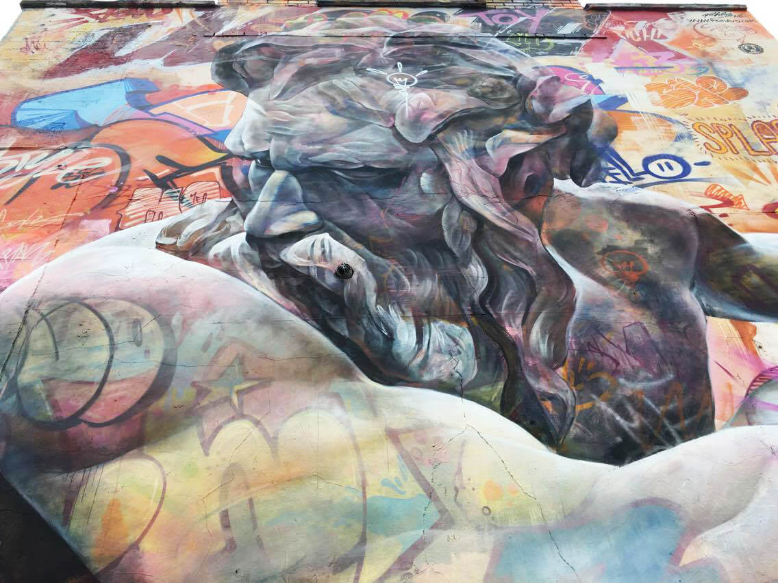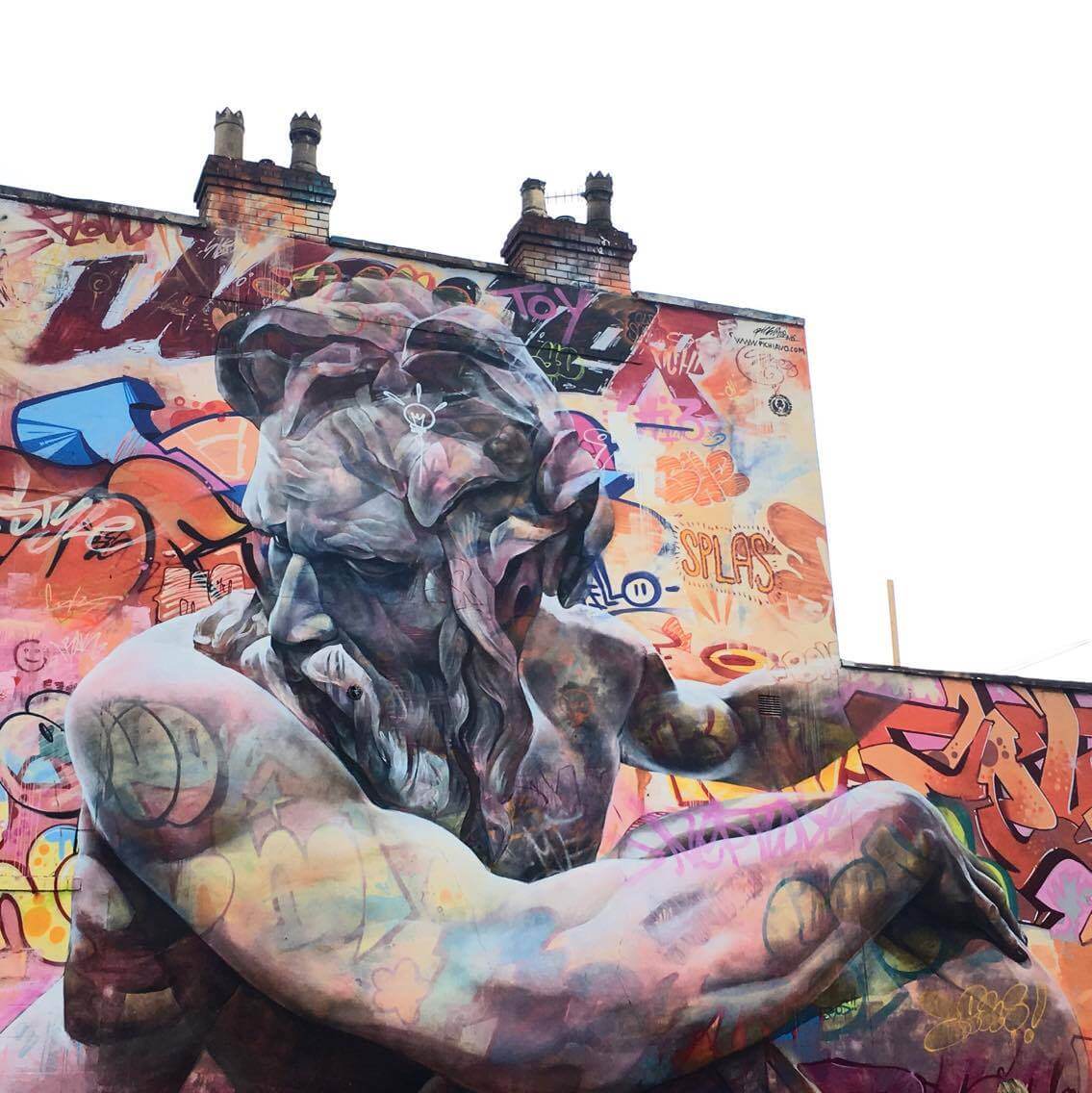 A carefully mixed explosion of colourful graffiti tags together with a classical sculptural statue gives us the ultimate, a powerful piece full of emotions.