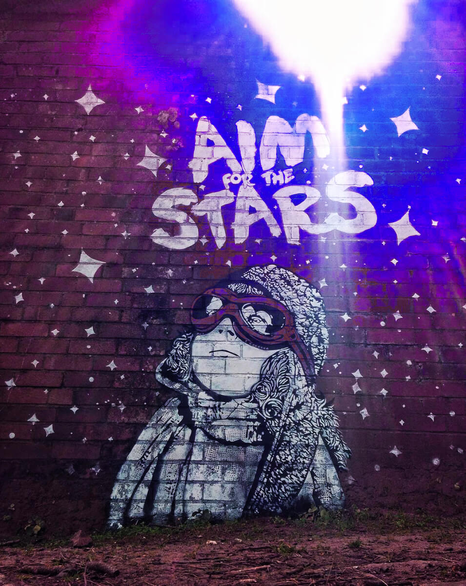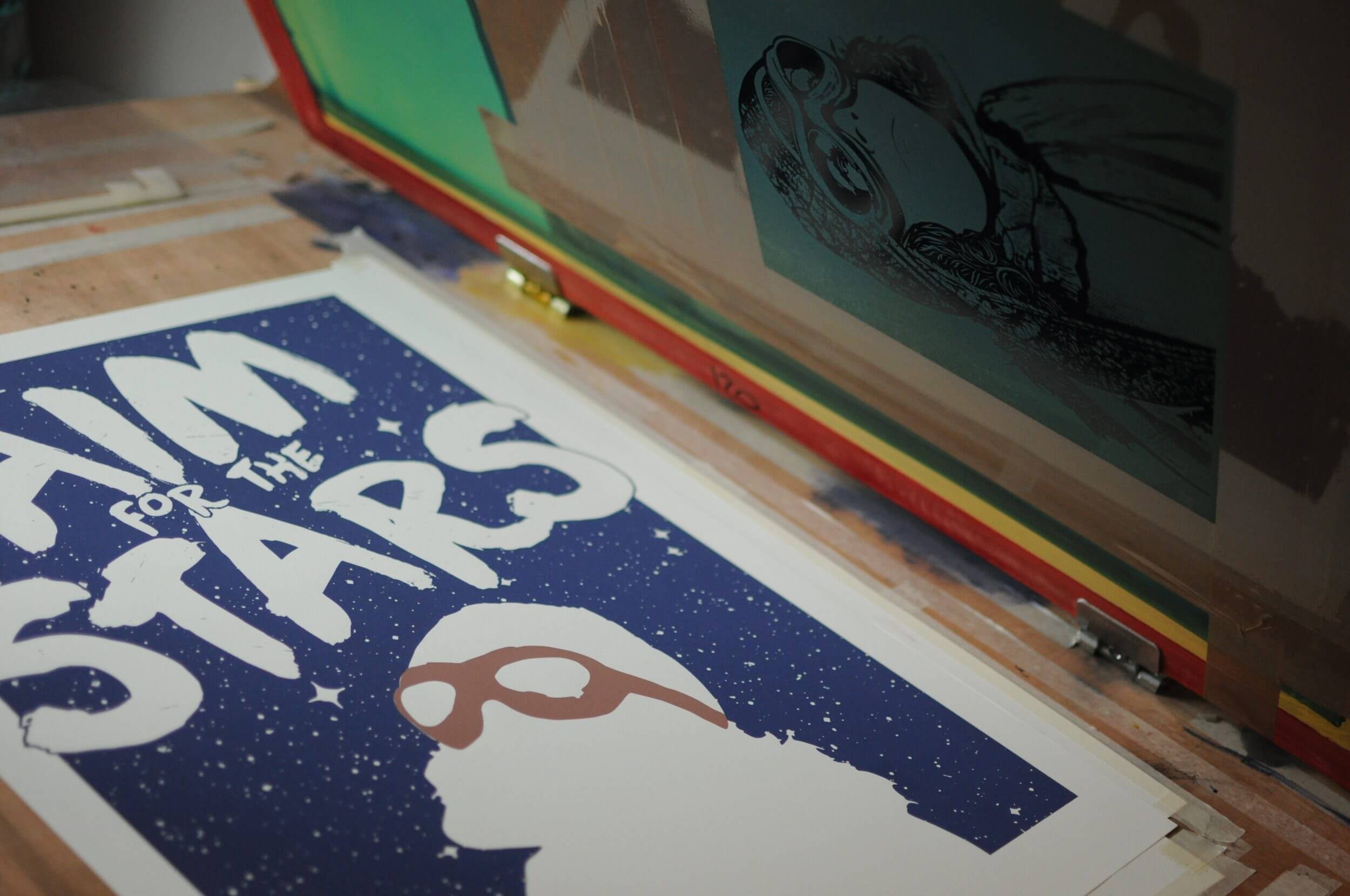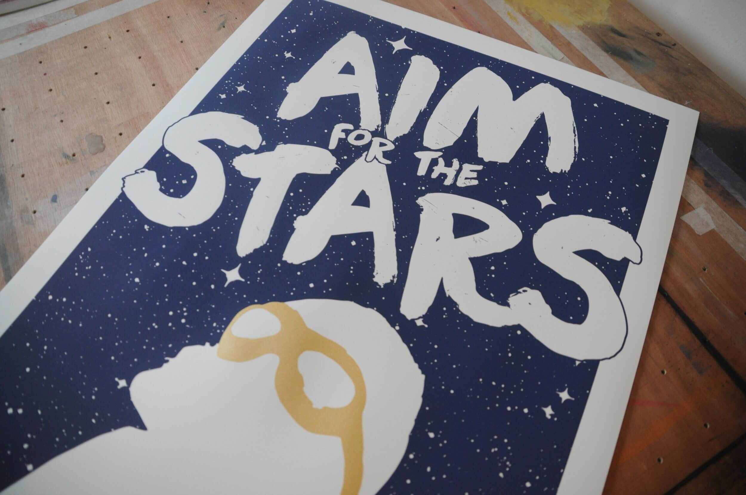 This is NME second motivational print we have screen printed which compliments the now sold-out print ‘The Skys the limit’. NME created ‘Aim for the Stars’ as a street mural in his hometown Dawlish to motivate people to always aim high.
