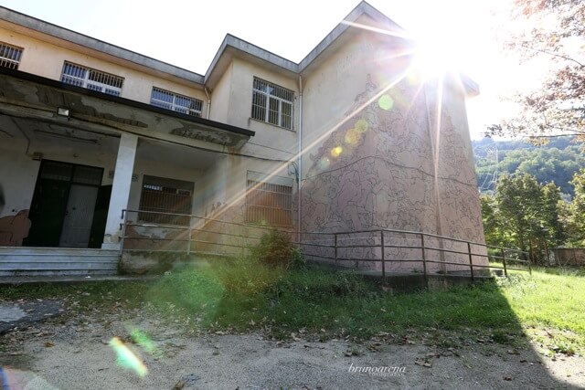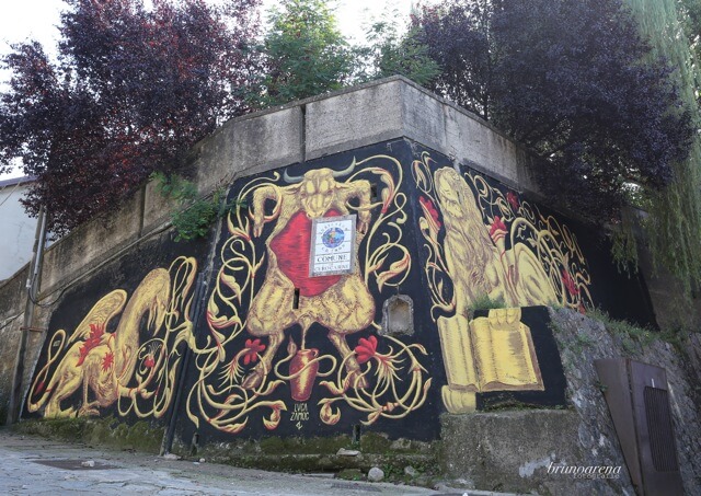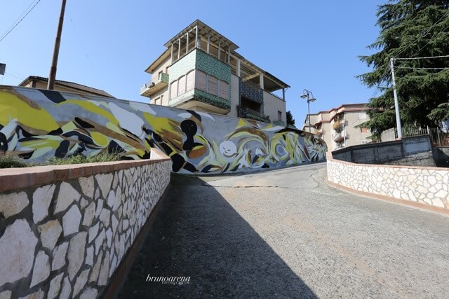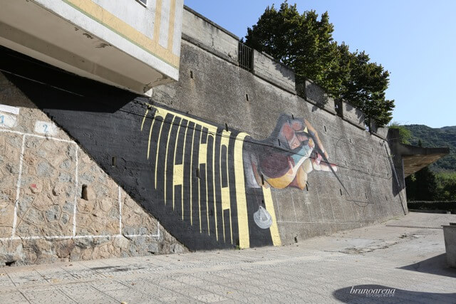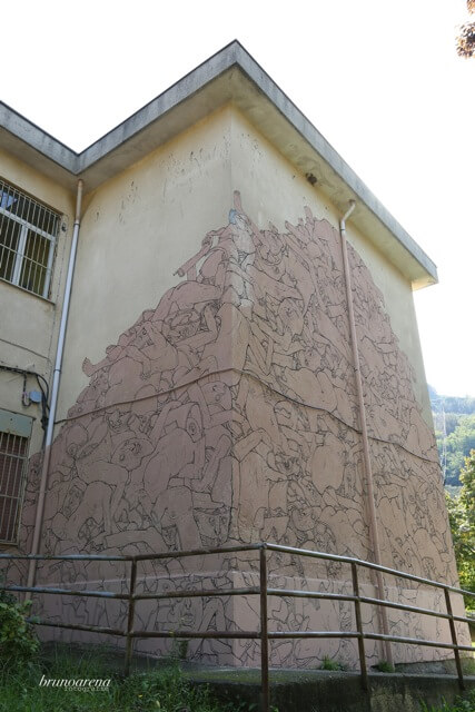 Walking along Via Carmine, you reach a bridge which is one of the main gateways to Gerocarne’s town. On the wall next to the bridge alongside the river, Giorgio Bartocci’s was invited to paint here. The work was inspired by the river since it represents the nature’s own strength which can be modified but never stopped. The mural included the local elements from the Gerocarne area such as the fossils found within the sandy quarry. The artist spread the energy intrinsic of nature to tell us about man’s journey: the eternal return humanity is destined to. The artist transformed the colours (yellow, white, grey, black and red) of the bricks into the colours of the lifecycle’s NOSTOI.