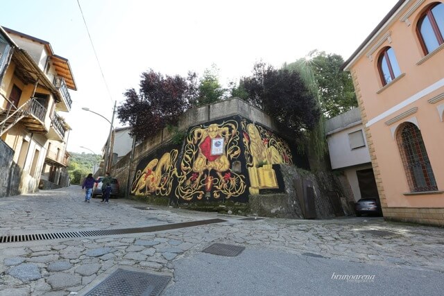 Collettivo FX paint ‘Attenti all’Uomo’ (Beware the Man) in the ancient suburb of the village, next to the pottery ovens. Starting from the village square, between the steep streets the artist Collettivo Fx has created an homage to the many devotees of St. Rocco, the patron who cured the plague victims followed by his dog.