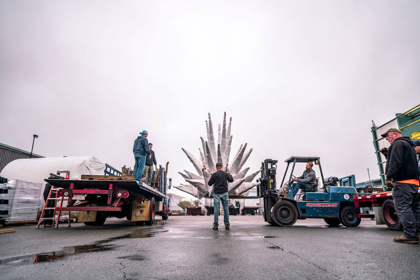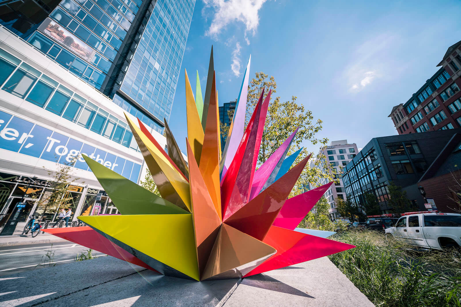 This vibrant kaleidoscope of seven large-scale sculptures was designed specifically for display within Seaport’s sweeping cityscape. The work’s eight- to twelve-foot sculptures are placed at deliberate intervals on the Seaport Boulevard medians, creating a public art corridor stretching from Sleeper Street to East Service Road.