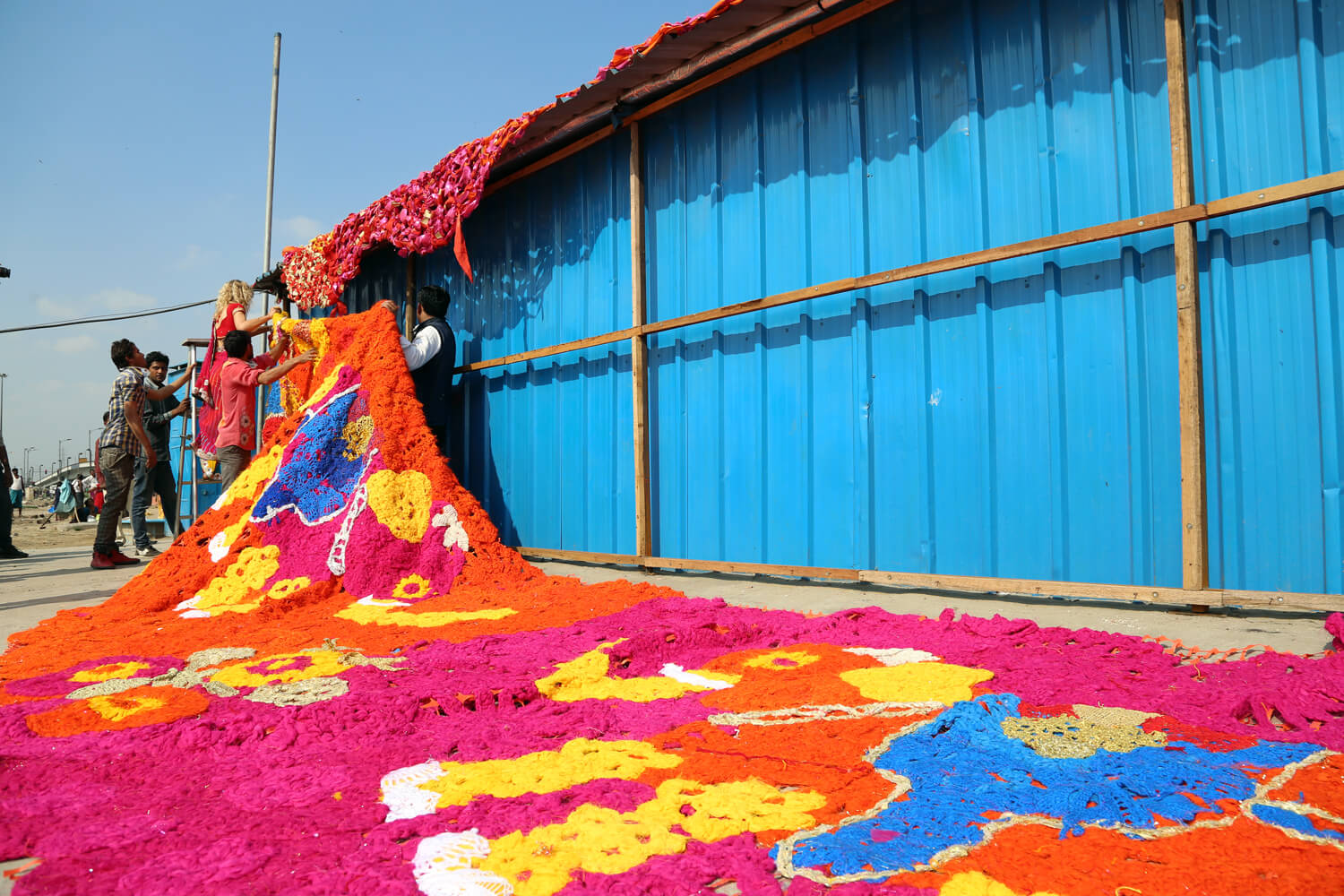 Within the first few days of her arrival in India, OLEK held a workshop on crochet techniques with volunteers and women from several different organisations. The women were given several meters of fabric, which they took back home with them and crocheted into hearts and butterflies and other forms, which were all used to make a larger artwork for the project. OLEK got everyone involved with producing this large crochet installation.