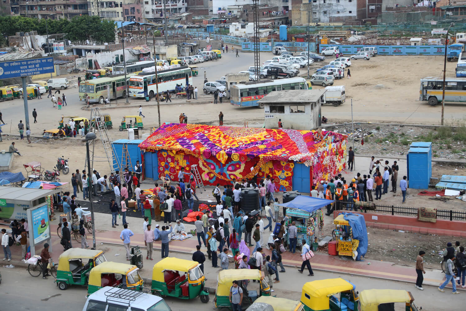 The night shelter is located in Sarai Kale Khan area of New Delhi and is about 40 ft long and 8 foot high – required an enormous 90 km of fabric to cover it. Through her project, OLEK is trying to touch the lives of homeless people living in New Delhi and draw the attention of the city to them.