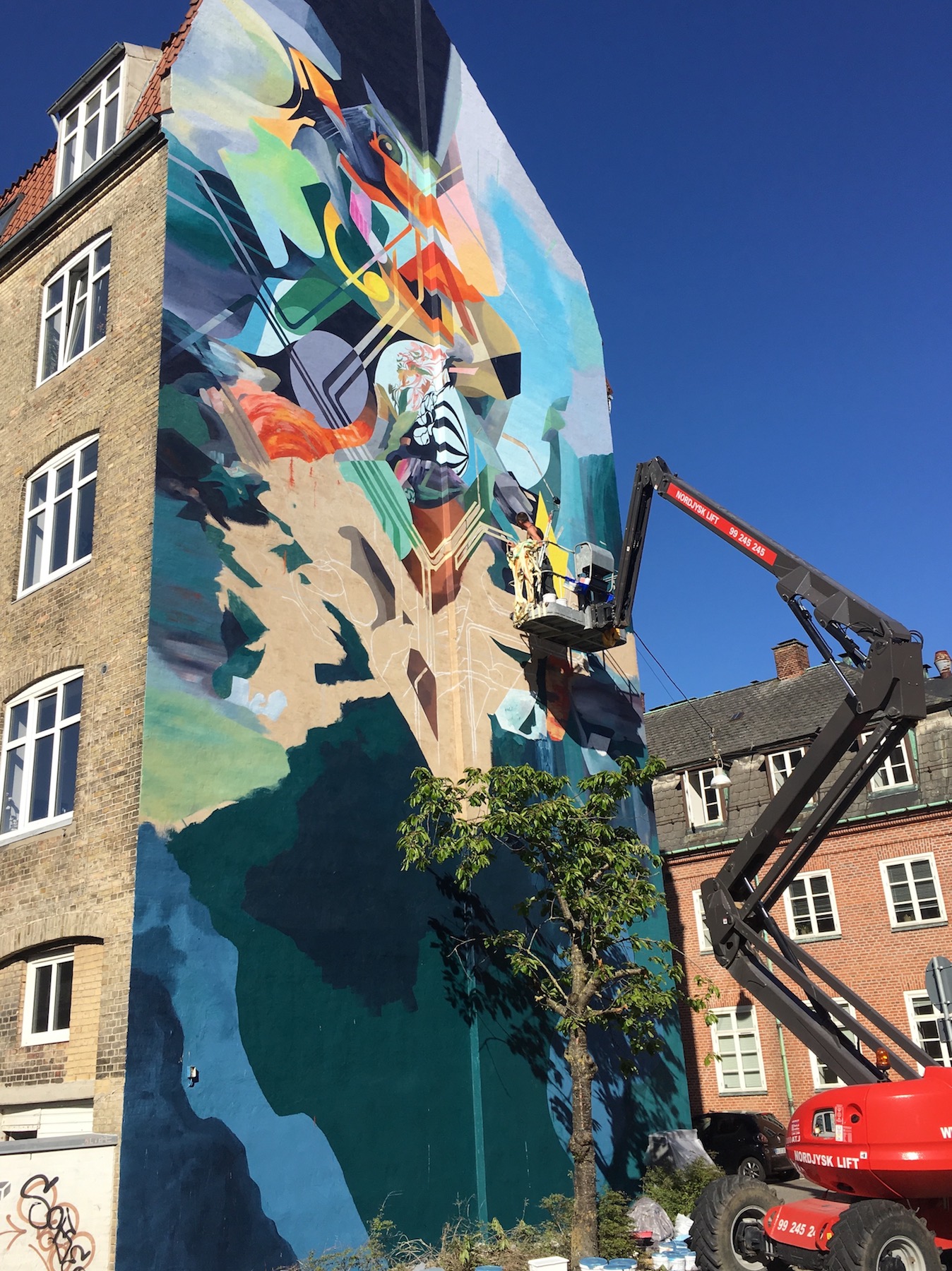 New York artist Oliver Vernon has just finished his biggest mural ever in Aalborg . The whole process from sketch to wall took two weeks with an intense twelve hour days, to produce this outstanding piece of art within modern abstraction.