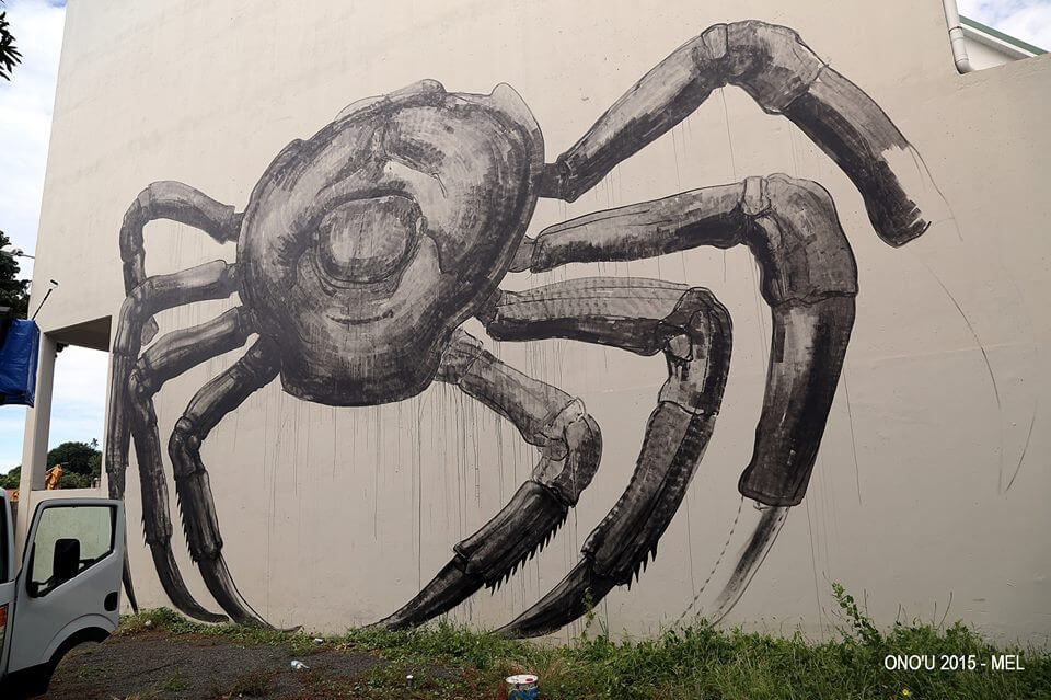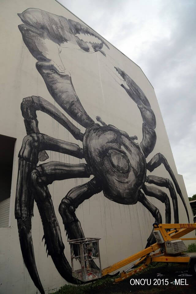 Belguim street artist Roa focuses again on his giant murals with technical precision. This time staying native to Tahiti Roa paints a gigantic Tahitian land crab. Lets hope they don’t get bigger than this!