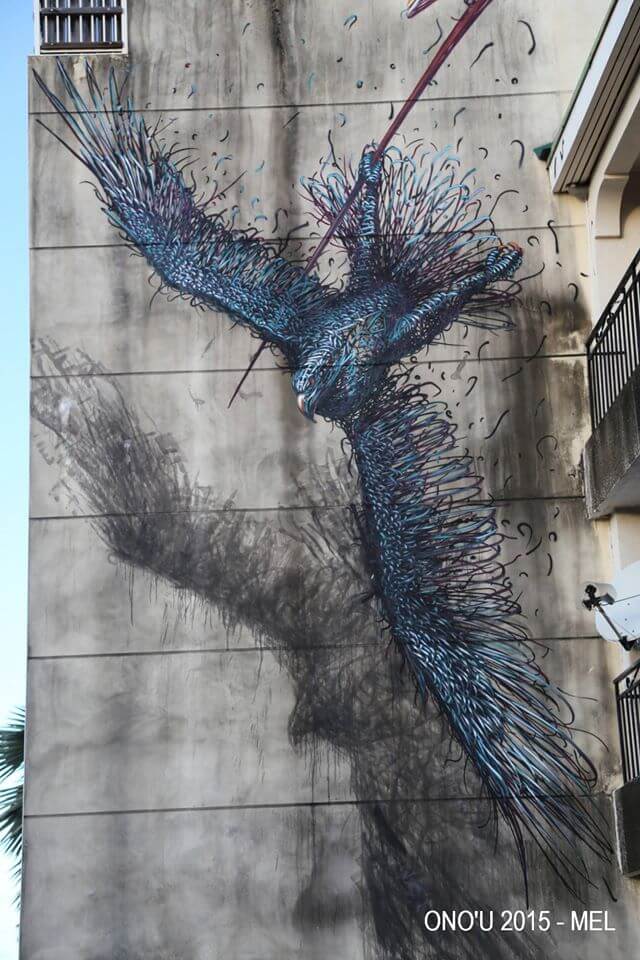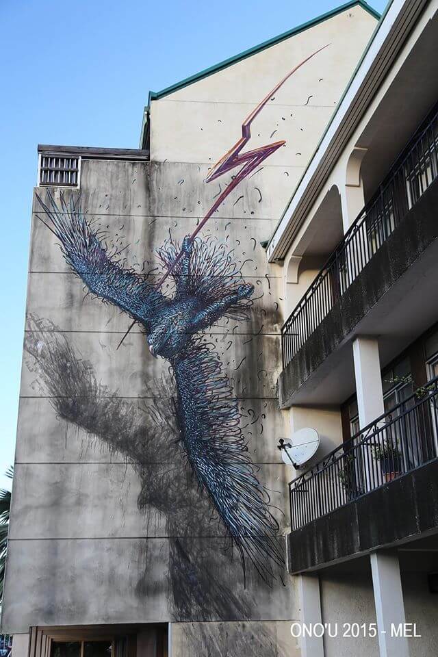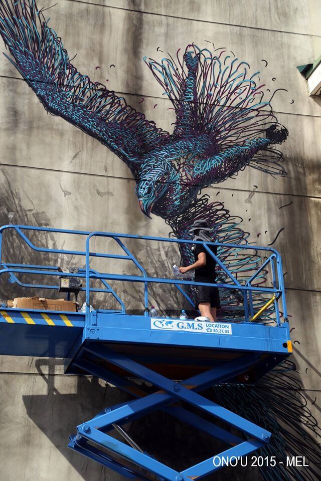 DALeast Mural is of a striking bird of prey in his signature three-dimensional metallic weaving. The bird is bringing energy into Tahiti with a thunder bolt, which was in keeping with the weather of this stormy festival. However, looking at this falcon would brighten up anyones day.