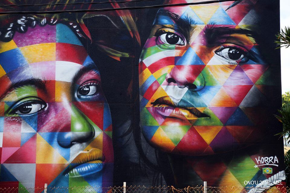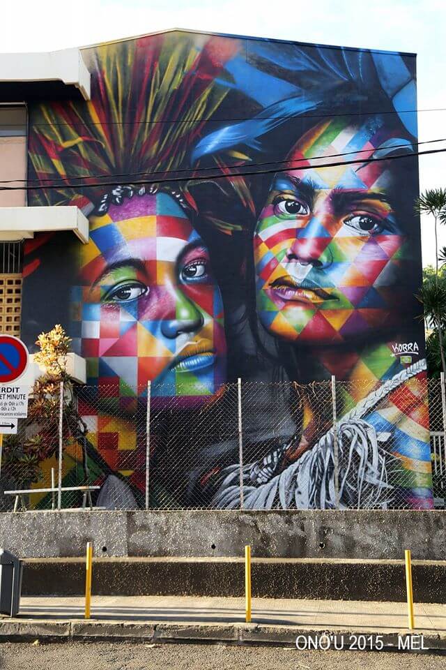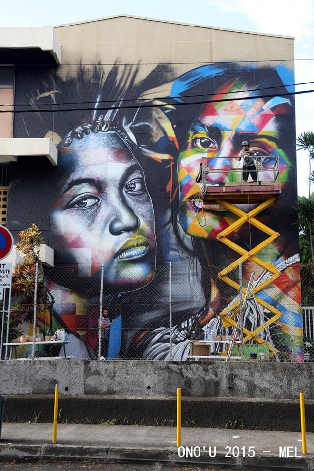 Brazilian street artist, Kobras beautiful mural was of two Polynesian girls in Papeete. In his signature style Kobra utilises bright colours and bold lines while staying true to a kaleidoscope theme throughout. Kobra worked through the tropical rain storms and sun shine to paint his own kaleidoscope rainbow in Tahiti.