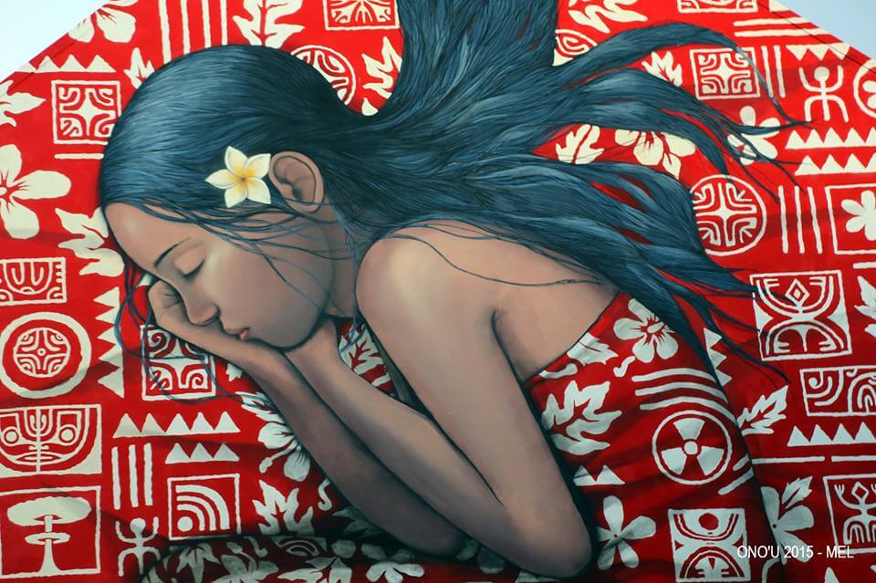 Buildings in Tahiti have been given another fresh lick of paint and heading this years festival was French street artist Seth. Seth drew inspiration from the local culture and painted this beautiful portrait of a young Tahitian pareo, wearing, and sleeping on, a striking printed fabric, designed by HTC, with white hibiscus flowers on a red background. However, if you look a little closer you can see some symbols in the middle are different to the usual traditional symbols of Polynesian art, such as radioactivity on the side of the young woman and a radioactive mushroom cloud just above her knee. These subtle differences are in reference to the many years of disputed nuclear testing in Mururoa Atoll.