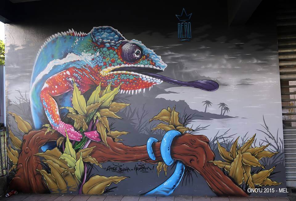 Street artist Aero paints a huge chameleon chilling out on the beautiful island!
