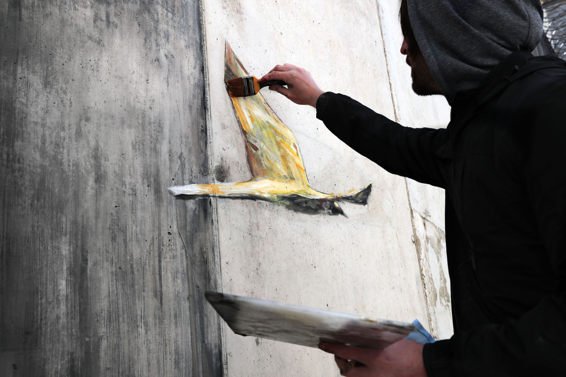 Another mural was painted within the concrete alley way and is a gold bird flying out of the wall. This mural was titled “Hollow Walls”.