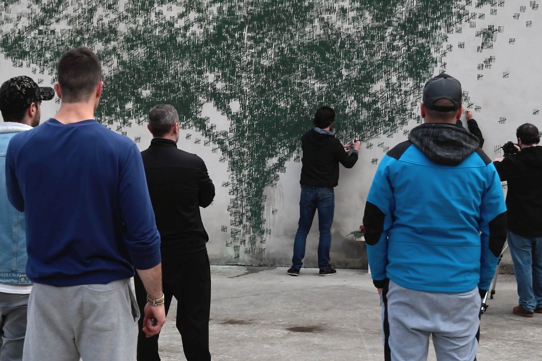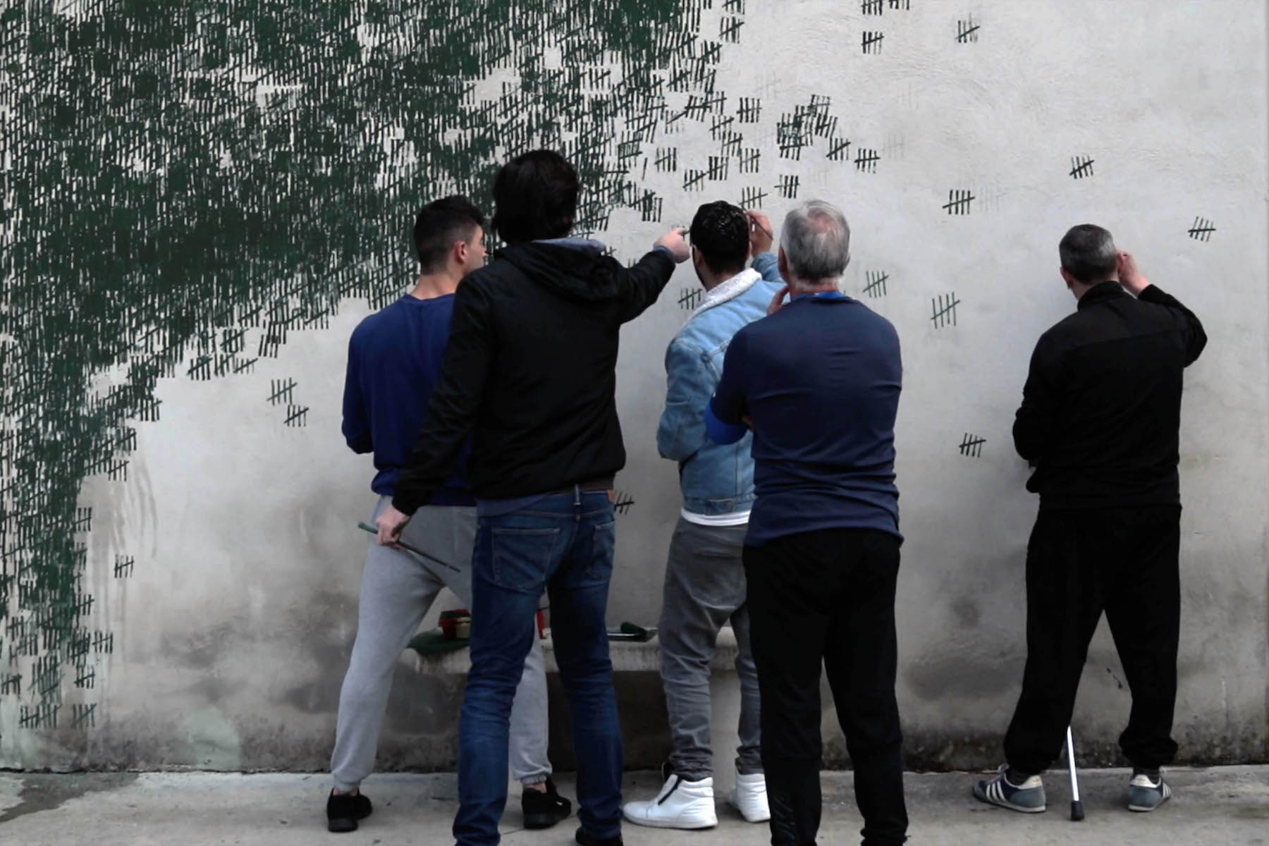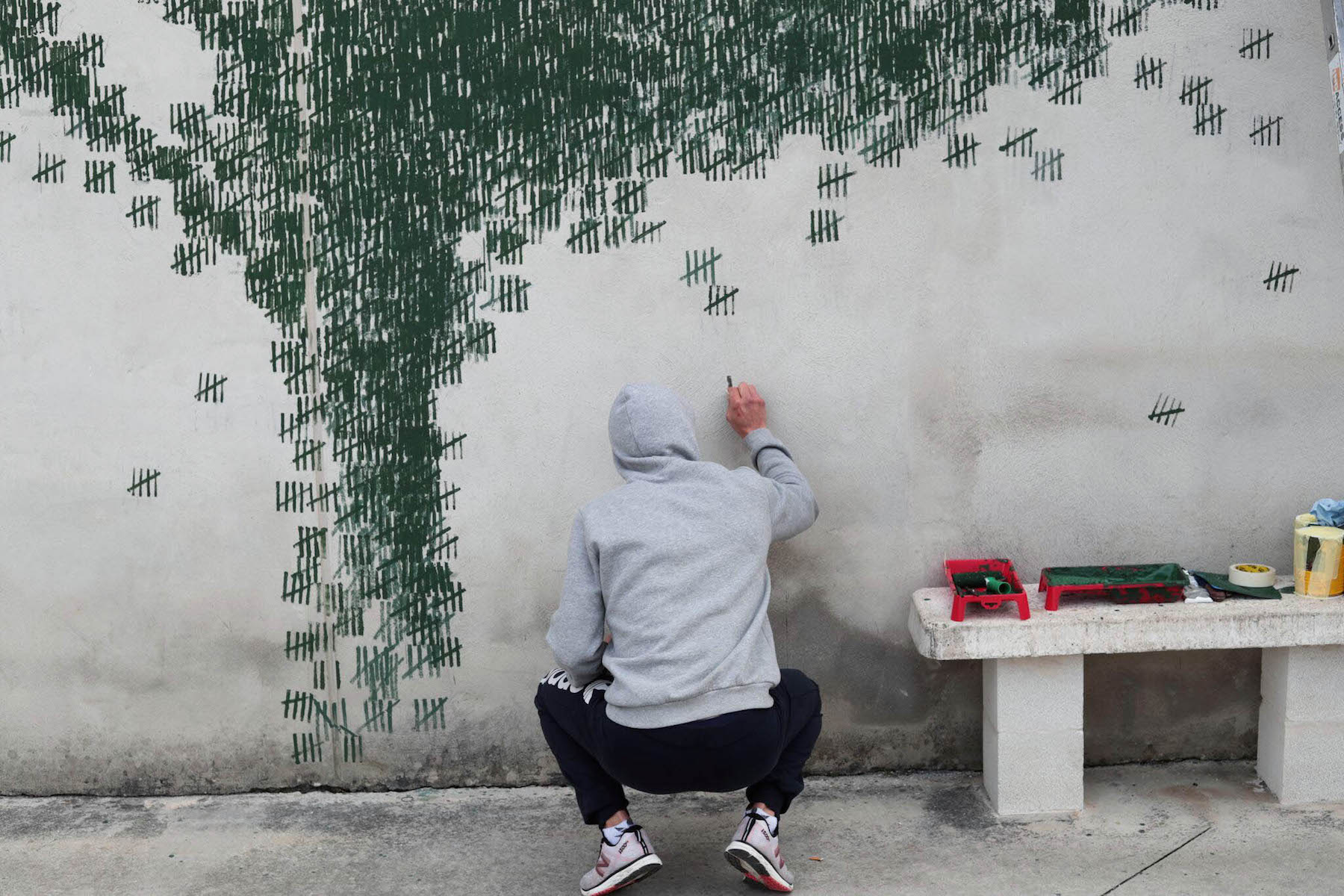 One mural was a clever image of a tree painted on the concrete wall, with the composition containing green line markings of time spent in five year groups.