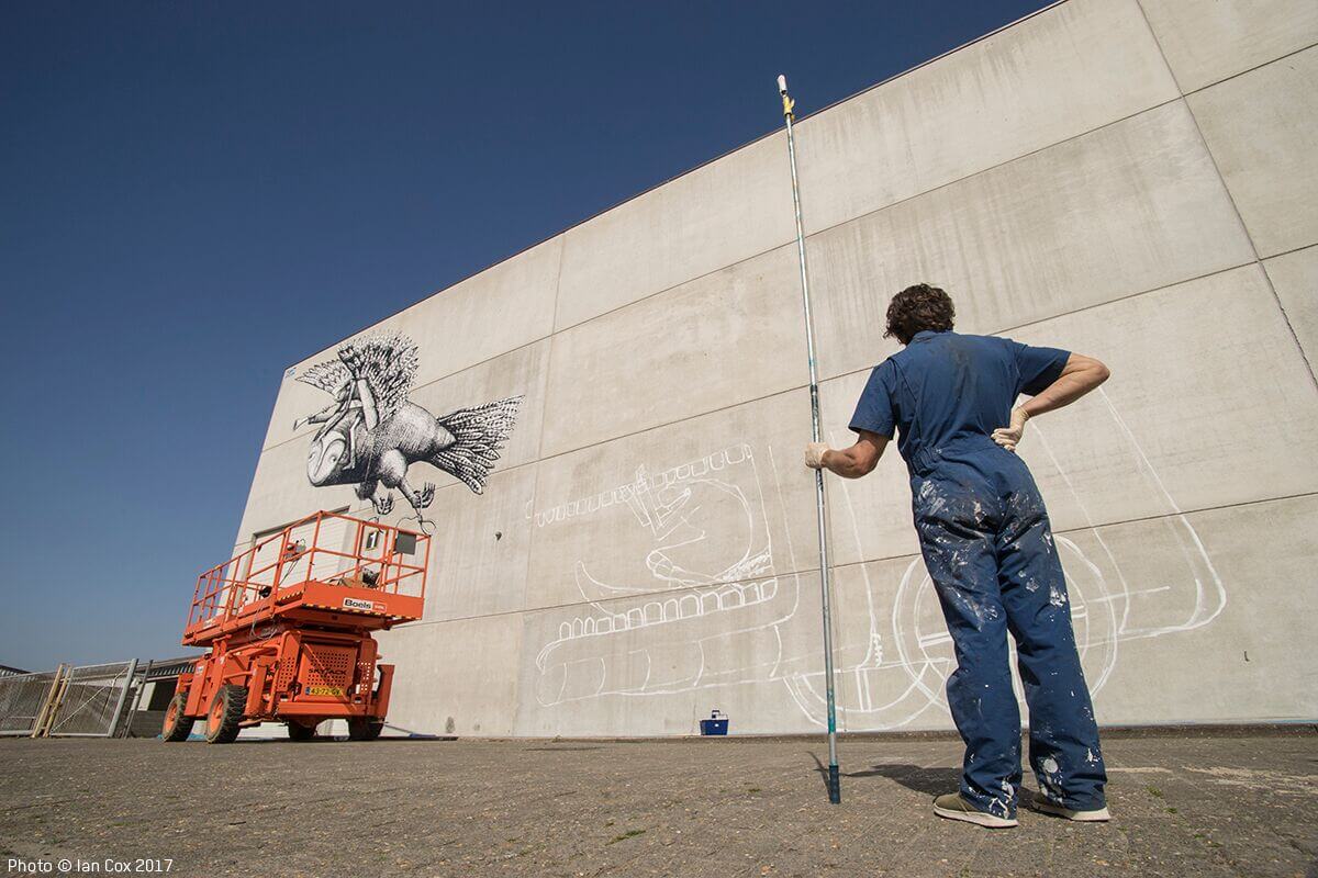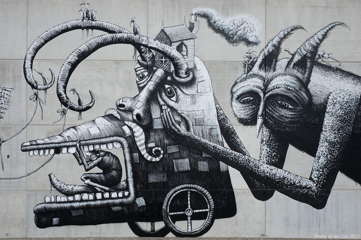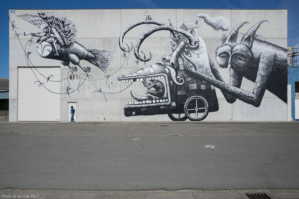 The world renowned and talented British street artist Phlegm, cartoonist and illustrator, visited Ostend to paint this amazing new mural.