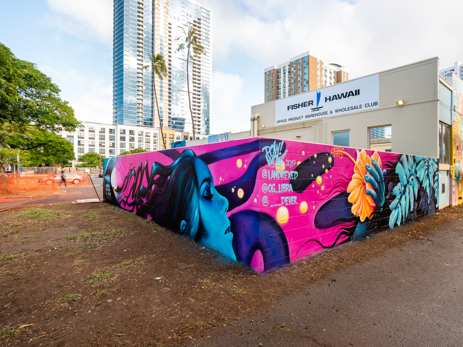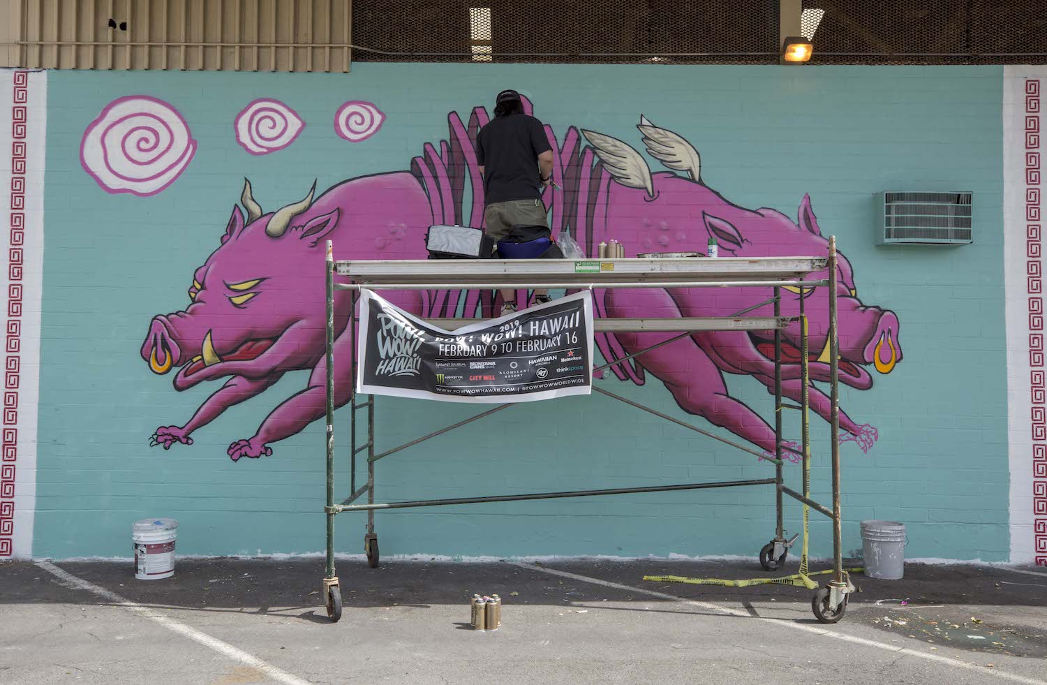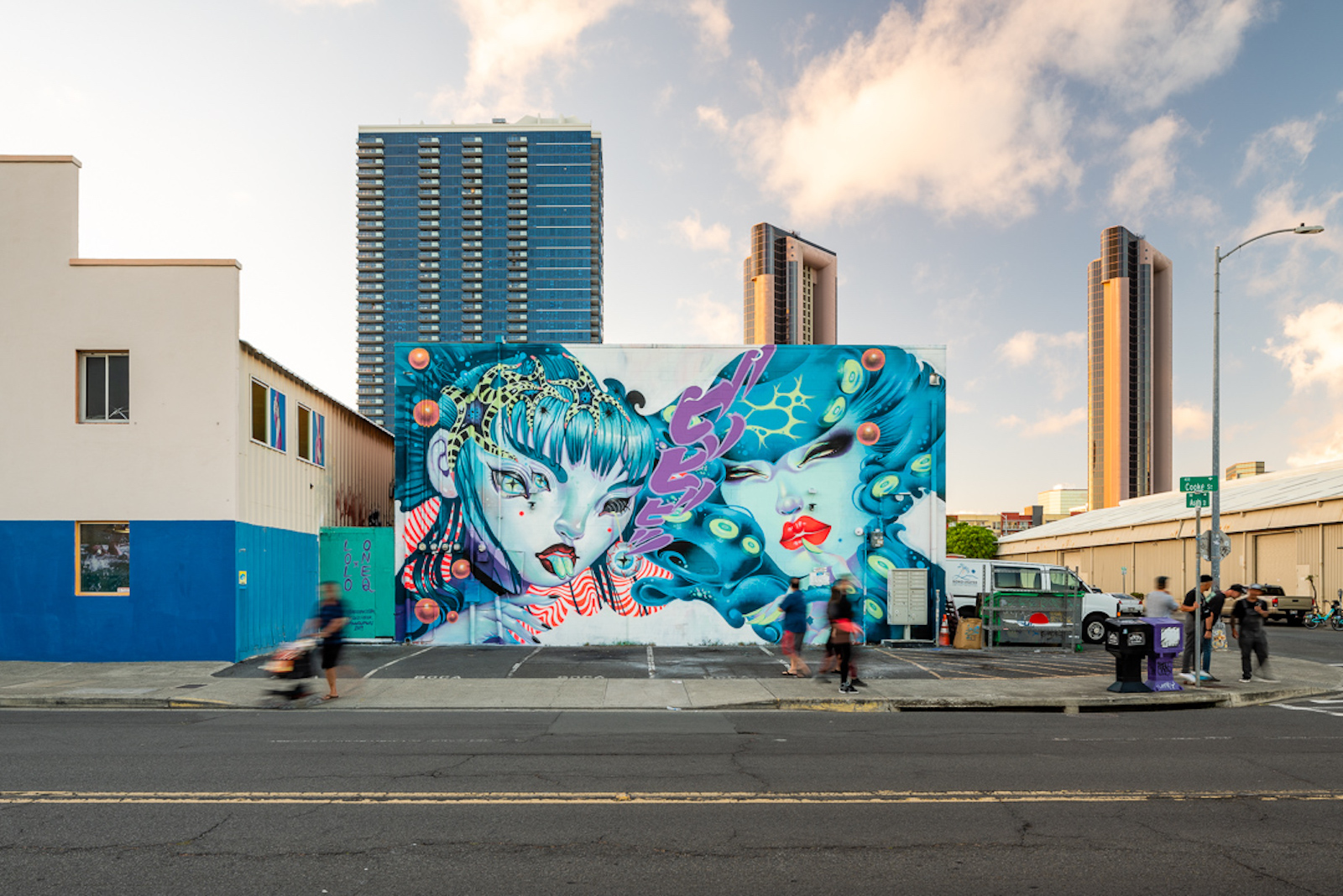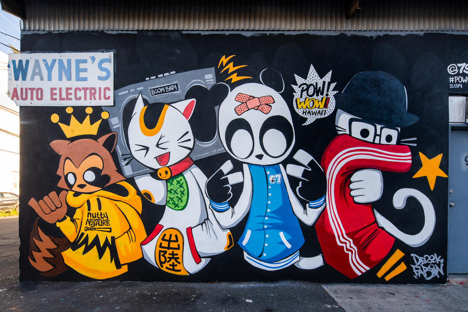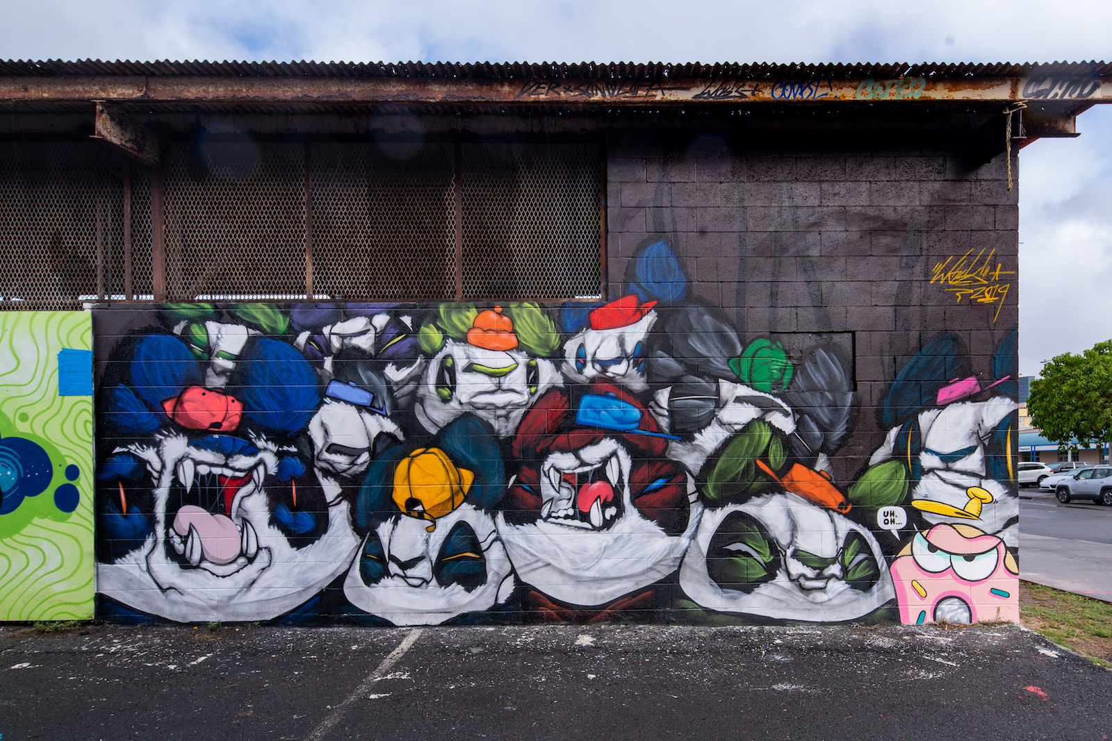 POW! WOW! Hawaii 2019 invited local and international artists to the beautiful town of Oahu, Visiting Artist Roster included Amy Sol (California), Lauren YS (California), Ekundayo (Hawaii/Washington), Joao Ruas (Brazil), Reeder One (California), Mr. Hahn of Linkin Park (Hawaii/California), ONEQ (Japan), Crash (New York), Mike McGinn of World of Dance (California), Spidertag (Spain), How Nosm (New York), Logan Hicks (New York), Zepha (France), Roamcouch (Japan), Superdeux (California), Shepard Fairey (California), Kevin Lyons (New York), Mayo (Australia), Drew Young (Canada), Eddy Angel (Florida), Aaron De La Cruz (California), Woes (Hawaii/California) and OG Slick (Hawaii/California). Local artists included 7sketches (California),Asalt (Hawaii), Cme (Hawaii),Cory Taum (Hawaii), Ckaweeks (Hawaii), Devour (Hawaii), Gary Draws Fish (Hawaii), Gavin Murai (Hawaii), Jasper Wong (Hawaii), Jeffrey Gress (Hawaii), Dak1ne (Hawaii), Kahiau Beamer (Hawaii), Kai Kaulukukui (Hawaii), Kamea Hadar (Hawaii), Kaplan Bunce (Hawaii), Katch (Hawaii), Kate Wadsworth (Hawaii), Kealakukui of 808Urban (Hawaii), Kris Goto (Hawaii), Lucky Olelo (Hawaii), Luke Dekneef (Hawaii), Render (Hawaii), Matthew Tapia (Hawaii), Maek (Hawaii), Melon James (Hawaii), Jesico Serrano (Hawaii), Oera (Hawaii), Prime (Hawaii), Puff (Hawaii), Sidy (Hawaii), Jack Soren (Hawaii), Nanea Lum (Hawaii), Ran Noveck (Hawaii), Solomon Enos (Hawaii), Unomas (Hawaii), Wooden Wave (Hawaii), Mystic (Hawaii), Gezu (Hawaii), Retsy (Hawaii) and Katoe (Hawaii).